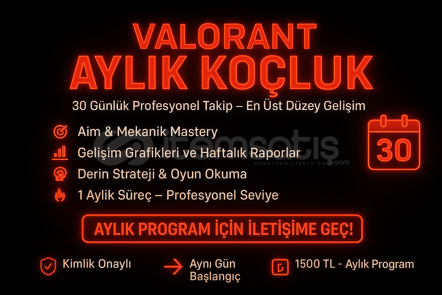 🔥 Profesyonel Valorant Koçluğu ile Gerçek Gelişim Zamanı! 🔥Valorant’ta hızlıca seviye atlamak, aimini güçlendirmek ve oyun bilgisini üst seviyeye çıkarmak mı istiyorsun?Senin için hazırlanan birebir profesyonel koçluk sistemi, kısa sürede etkili sonuçlar almanı sağlayacak! 💯🎯✨ Neler Sunuyorum?💥 Gelişmiş Aim Antrenman...