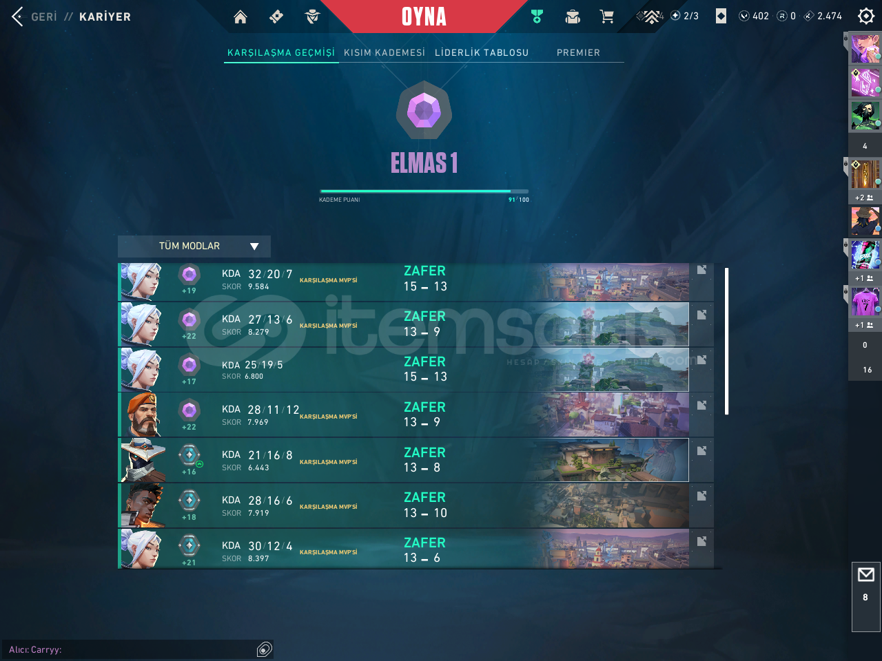BU İLANI SATIN ALMAYINIZ!Duo Boost İmkanı: Güvenle ve eğlenerek rütbe atlayabilirsin.Hesaplarda Voice Chat (Sesli Sohbet) KAPALI.%100 Güvenilir: 3. Parti Yazılım Kullanılmamaktadır.Demir - Bronz Rank Başı 20₺Bronz - Gümüş Rank Başı 35₺Gümüş - Altın Rank Başı 50₺ Altın - Platin Rank Başı 75₺Platin - Elmas Rank Başı 100₺Elmas...