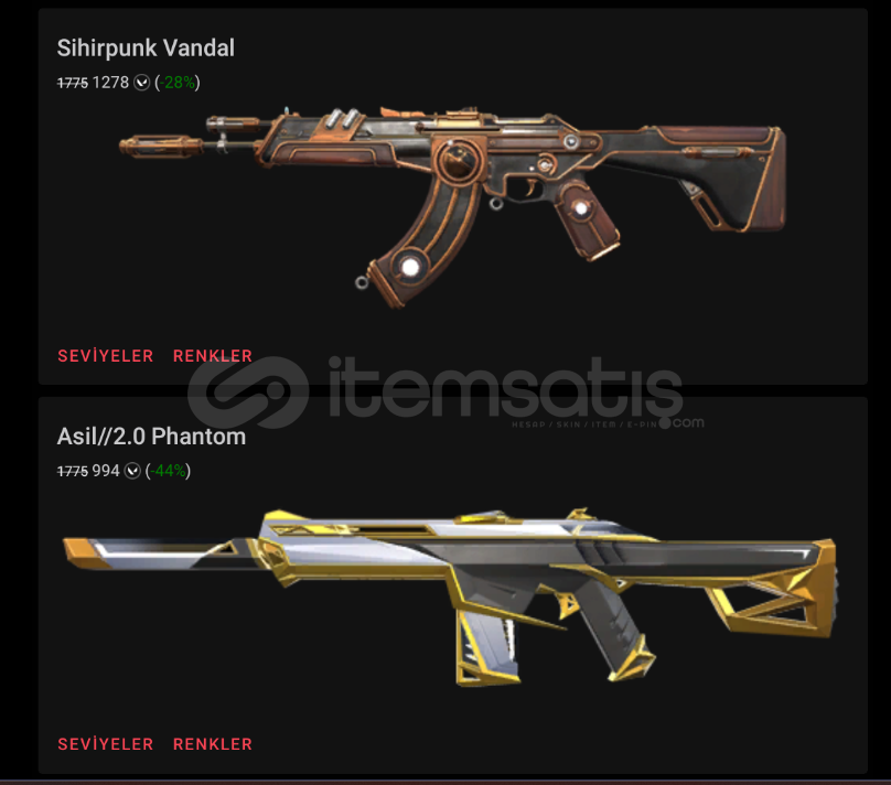 Hesapta gece pazarında asil phantom 994 vp ve sihirpunk vandal 1278 vp ye mevcuttur .Hesaplarımız otomatik teslimattır, aktif olmasam da satın alabilirsiniz. Hesaplarda e posta onayı yoktur, verdiğimiz bilgilerle e posta ve şifresini istediğiniz gibi değiştirebilirsinizBazı hesaplar temel eğitimde başlayabilir.Gece pazarında istediğiniz skinler varsa ya da sorularınız var ise mesaj atabilirsiniz.