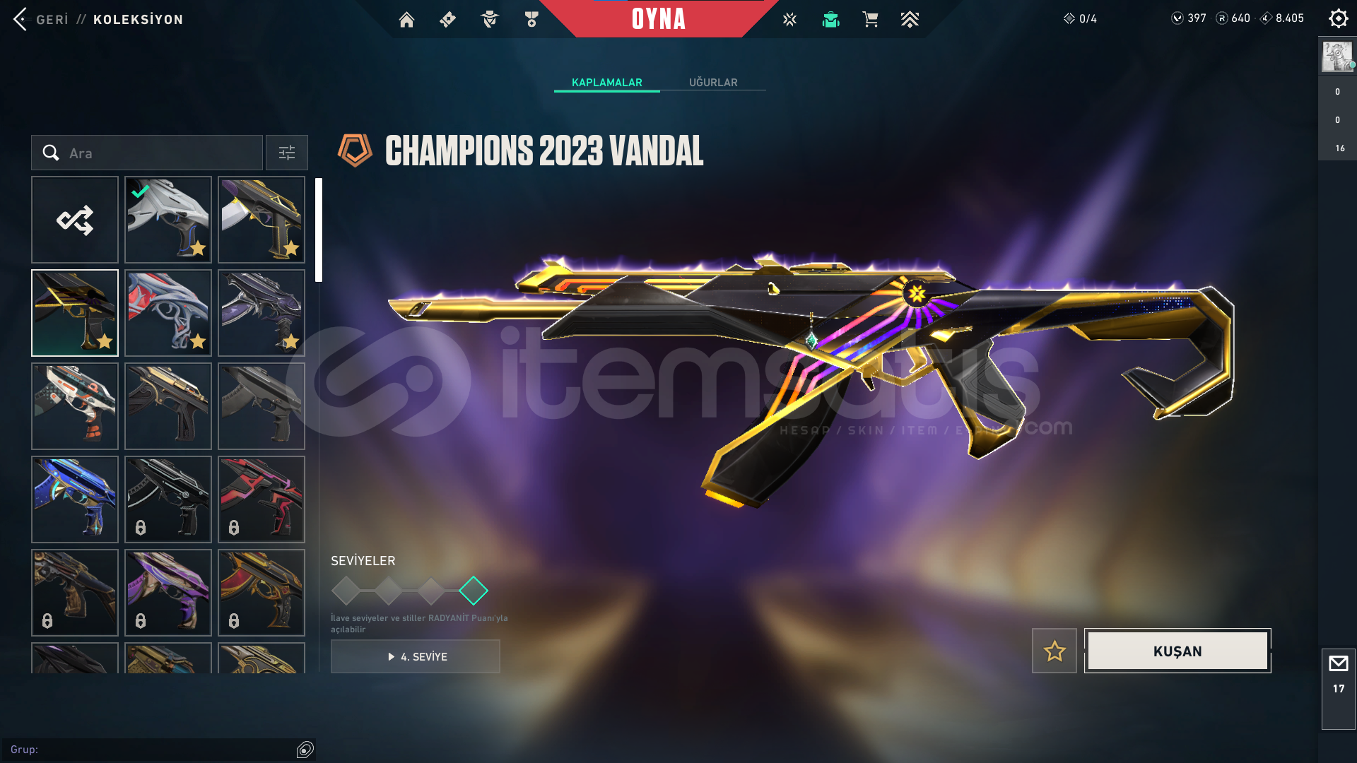 Hesabın içinde 70'den fazla skin bulunmakta. Hesabın peek rankı yücelik ancak aktif olarak gold.Champions VandalYağmacı KarambitÖzel Harekat Kelebekve bunlar gibi bir sürü skin de hesapta dahil