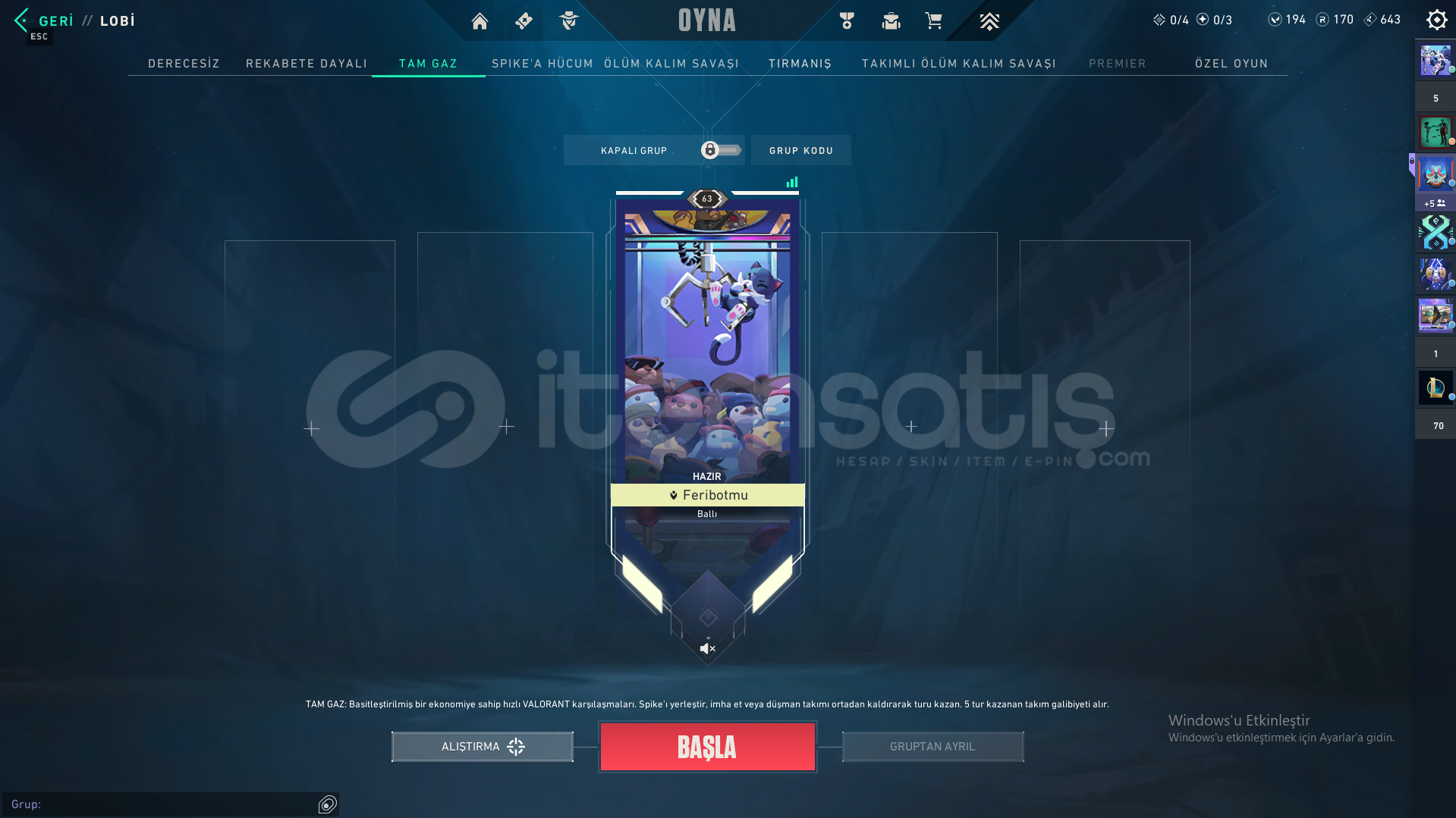 Bu kategorideki hesaplar RANDOM (Rastgele) hesaplardır. Hesapların bilgileri değişmeyebilir, e-mail erişimi olmayabilir veya banlı çıkabilir. Yalnızca banlı çıkan hesaplarda satıcılar iade/değişim yapmak zorundadır. Garanti süresi 7 gün ile sınırlıdır. Renk paketleri ve silah yükseltmeleri de KOSTÜM (skin) sayılmaktadır.