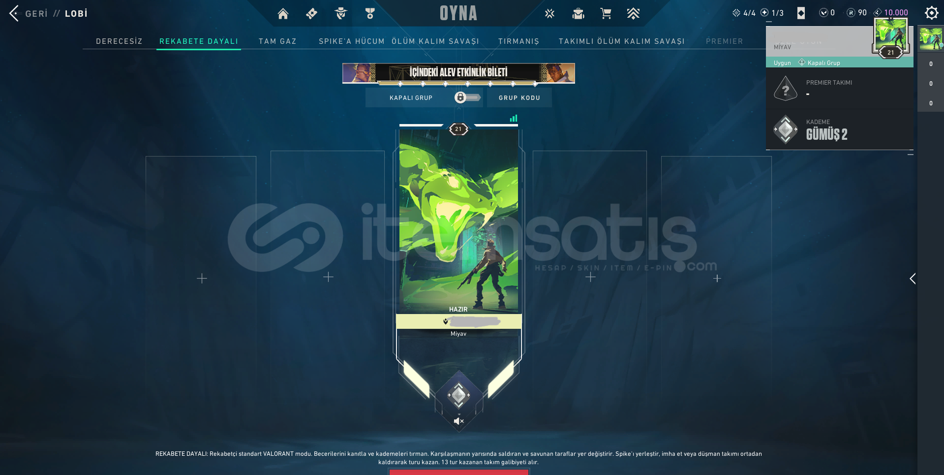 Gümüş 2 derecesine sahip hesap. Hesabın bağlı olduğu mail tamamen değiştirilebilir durumdadır. Banı yoktur, sorunsuz bir hesaptır. (HESAP BILGILERI OTO TESLIM EDILECEKTIR) ISIM DEGISTIRME HAKKI: VAR, MAGAZA ULKESI: TR, SUNUCU: TR
