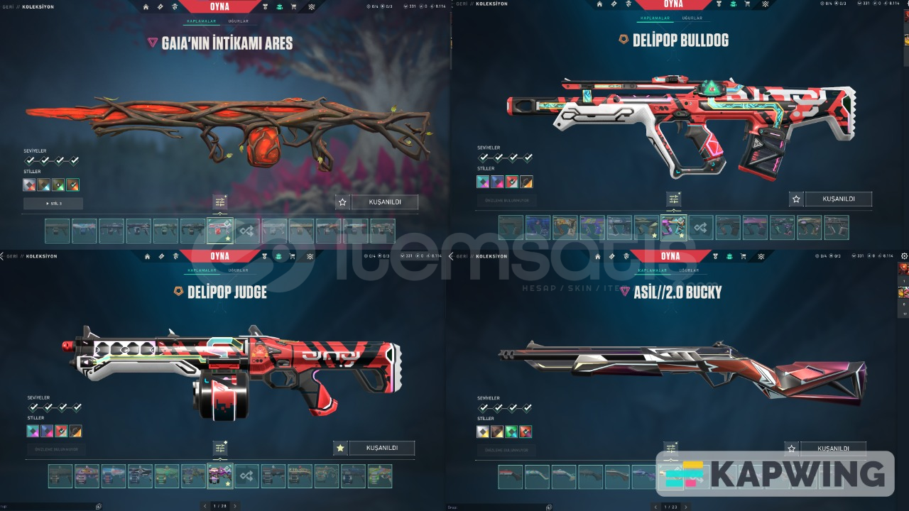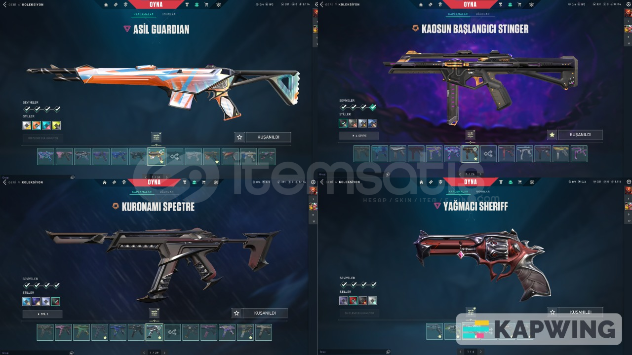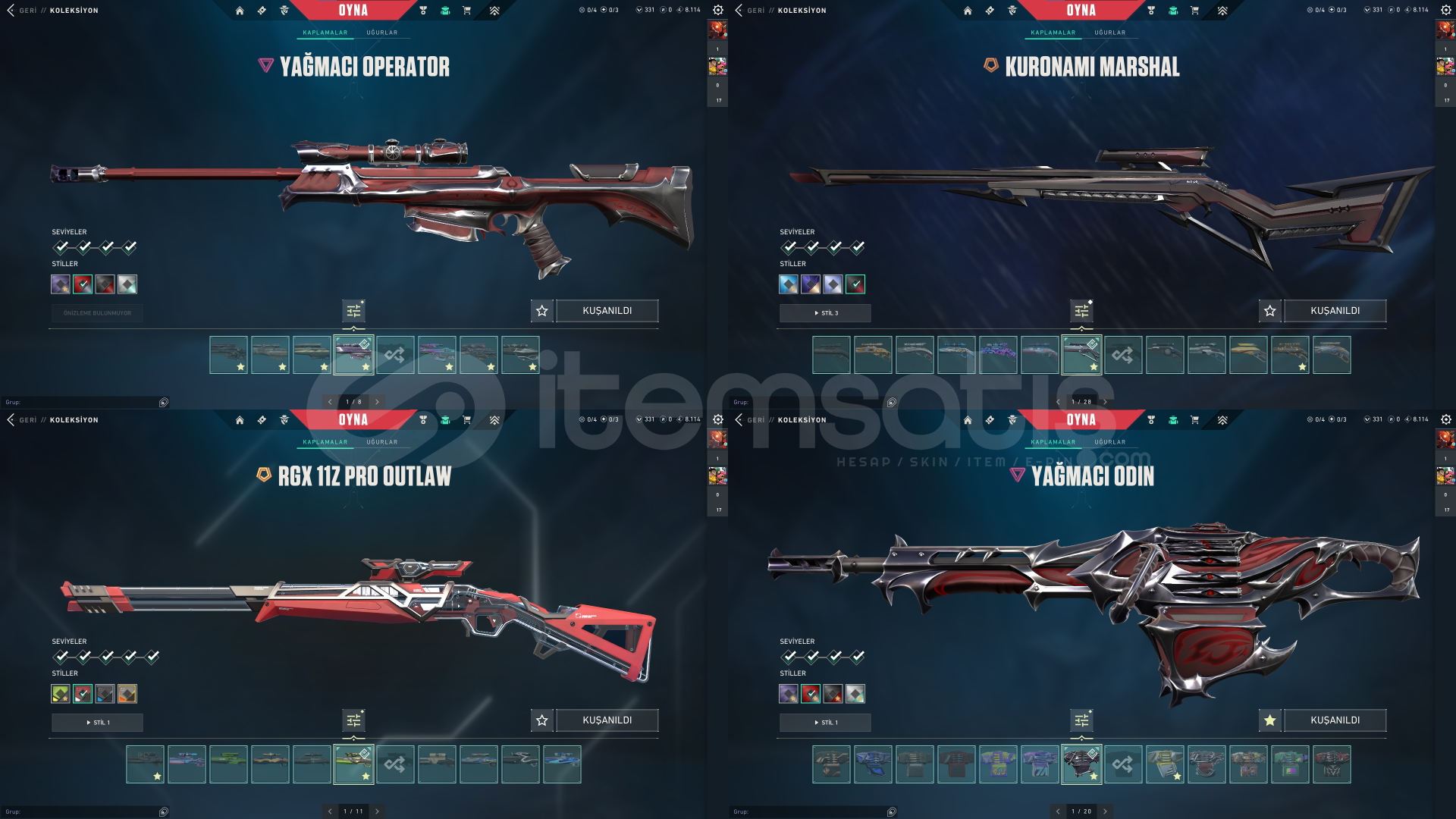 • Melee (52) – Kronomi, Altın Afet, Arcane Eldiven, Asil Karambit, Champions 2023 Kunai, Champions 2024 Kılıç, Delipop Balta & Hançer, Faz Koruyucu, RGX Karambit, VCT 2025 Karambit, Yağmacı Karambit, Yıldızbiçen, Ulupençe, Jett Go, Sırçiçeği Kunai ve daha fazlası