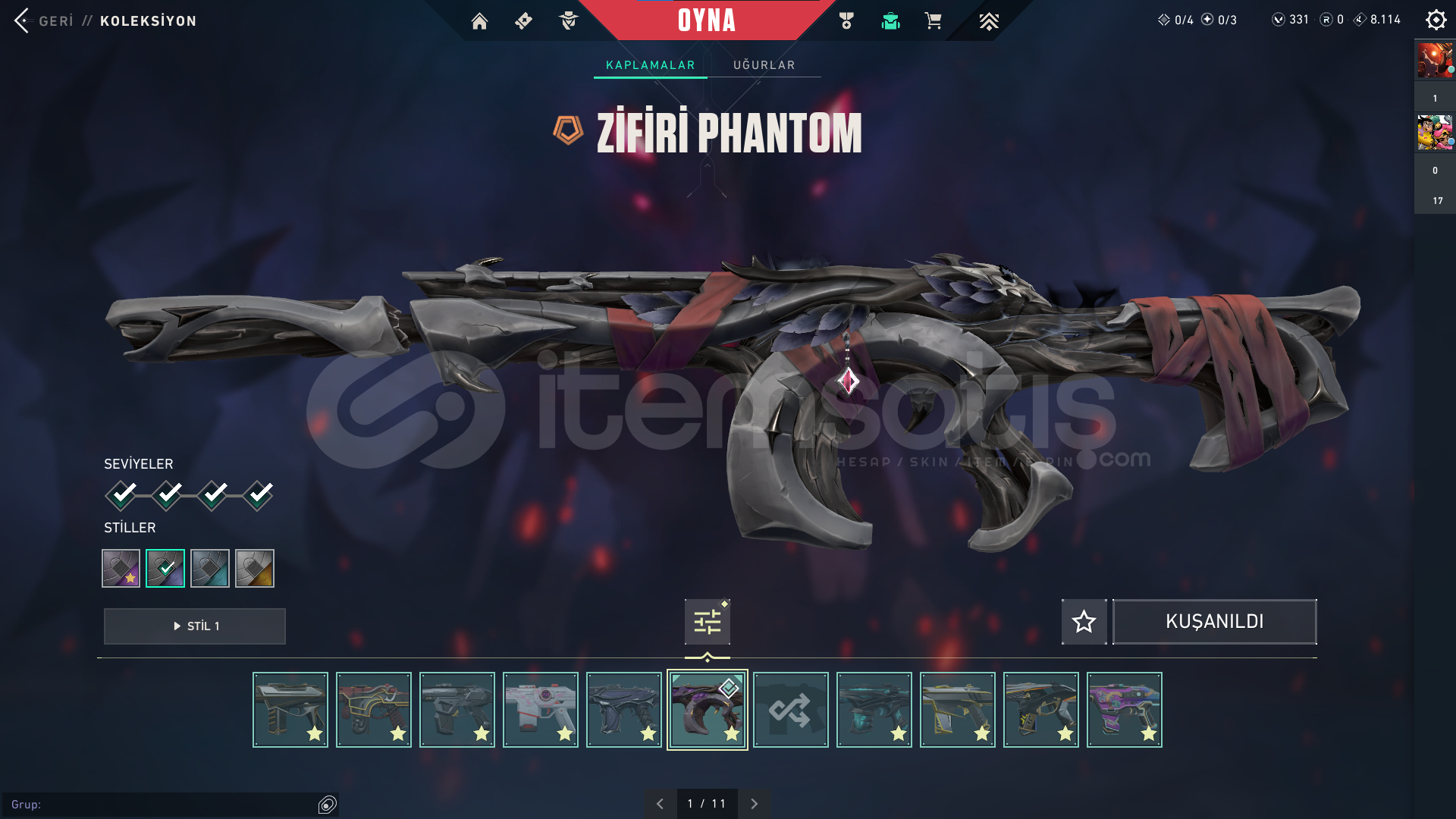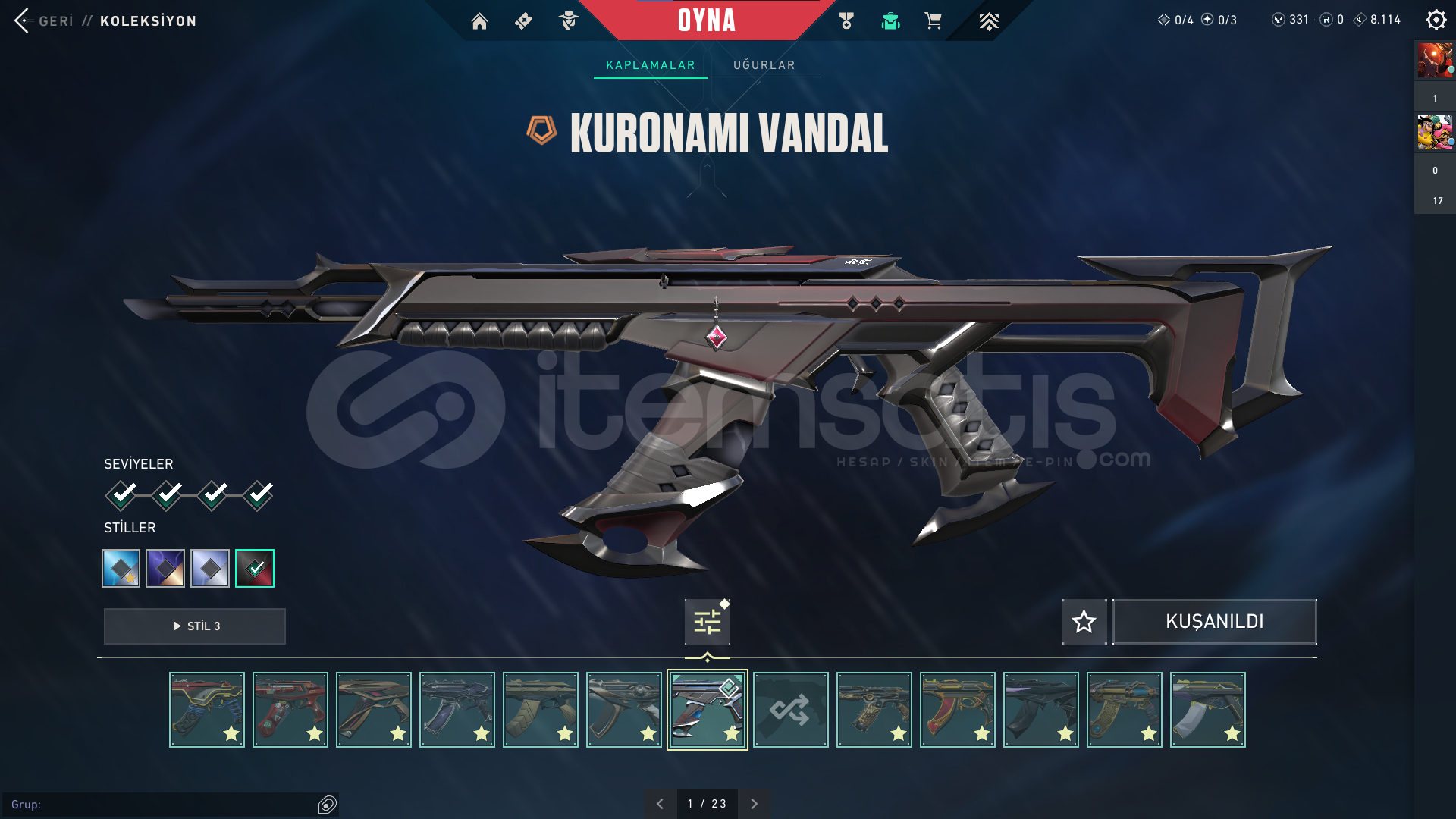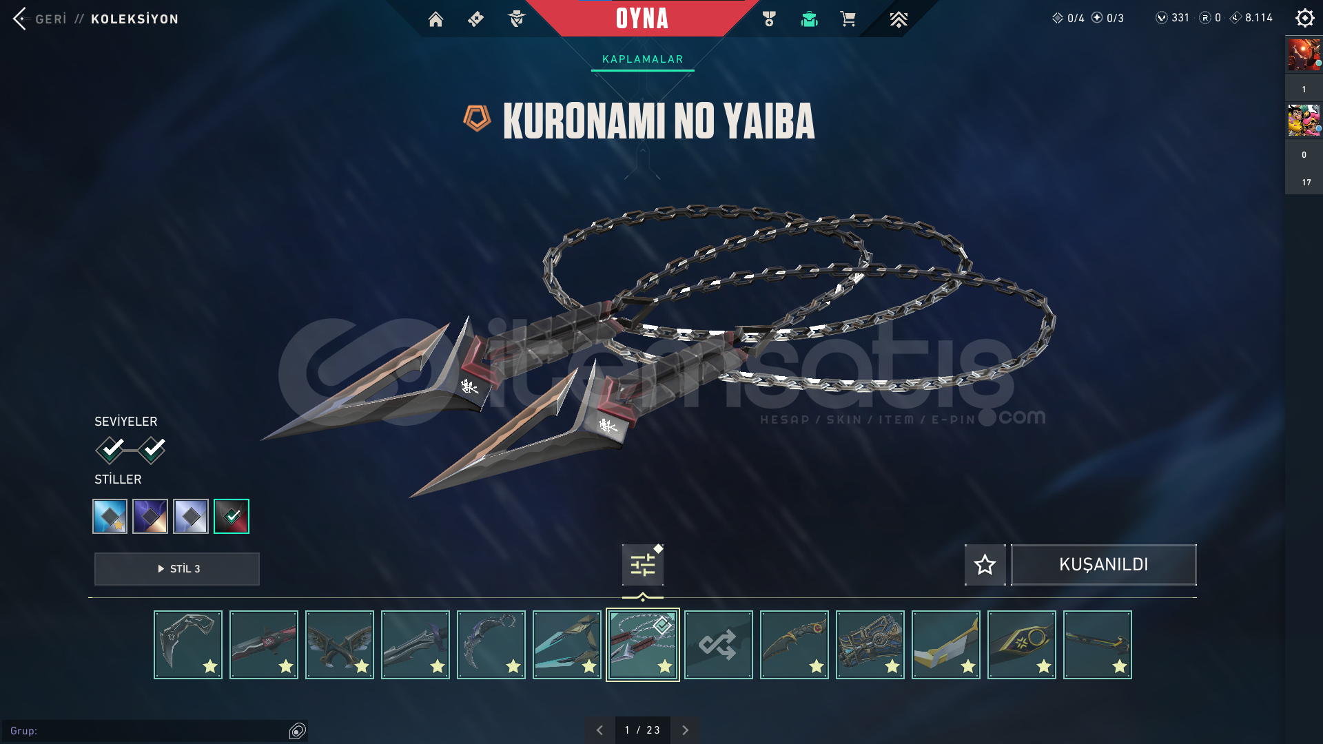 • Melee (52) – Kronomi, Altın Afet, Arcane Eldiven, Asil Karambit, Champions 2023 Kunai, Champions 2024 Kılıç, Delipop Balta & Hançer, Faz Koruyucu, RGX Karambit, VCT 2025 Karambit, Yağmacı Karambit, Yıldızbiçen, Ulupençe, Jett Go, Sırçiçeği Kunai ve daha fazlası