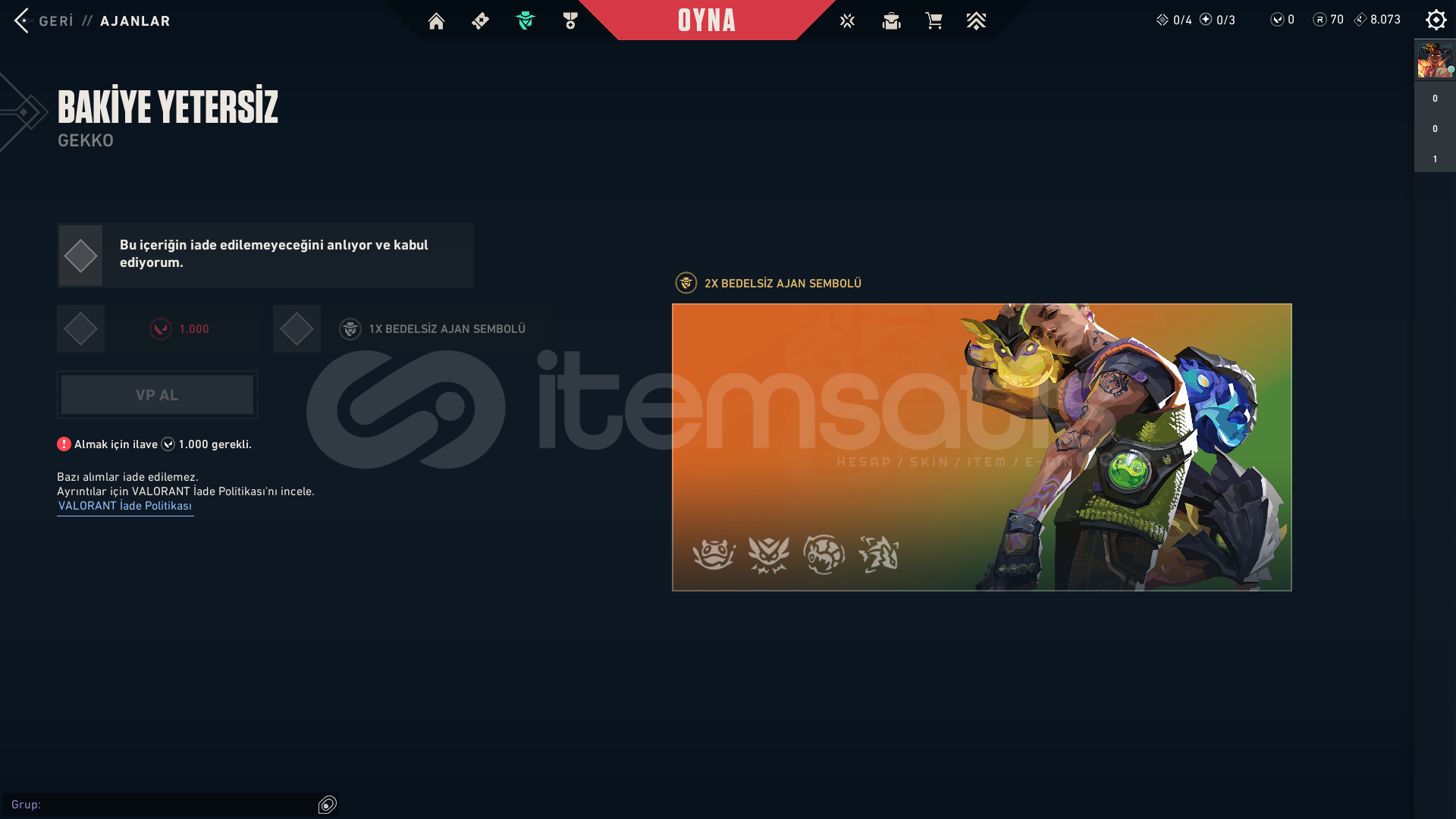 2 tane bedelsiz ajan sembolü ve 8000 kingdom kredisi mevcuttoplamda istediğiniz 3 ajanı direkt açabilirsinizİsim değiştirme hakkı mevcutturMail onayı yapılmamıştırArkadaşlar indirim sormayın elimle 0dan kastığım için fiyat indiremem. Mesaj bildirimleri gelmediğinden bazen görmüyorum ama hesap otomatik teslimatta ve üstte yazdığım gibi direkt satın alabilirsin...