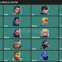 Killjoy ✪ Fade ✪ Iso ✪ Harbor ✪ Raze ✪ Yoru ✪ Gekko ✪ Skye ✪ Neon ✪ Reyna ✪ Deadlock ✪ Cypher ✪ Breach ✪ Waylay ✪ Viper ✪ Clove ✪ Chamber ✪ Tejo ✪ Omen ✪ KAY/O