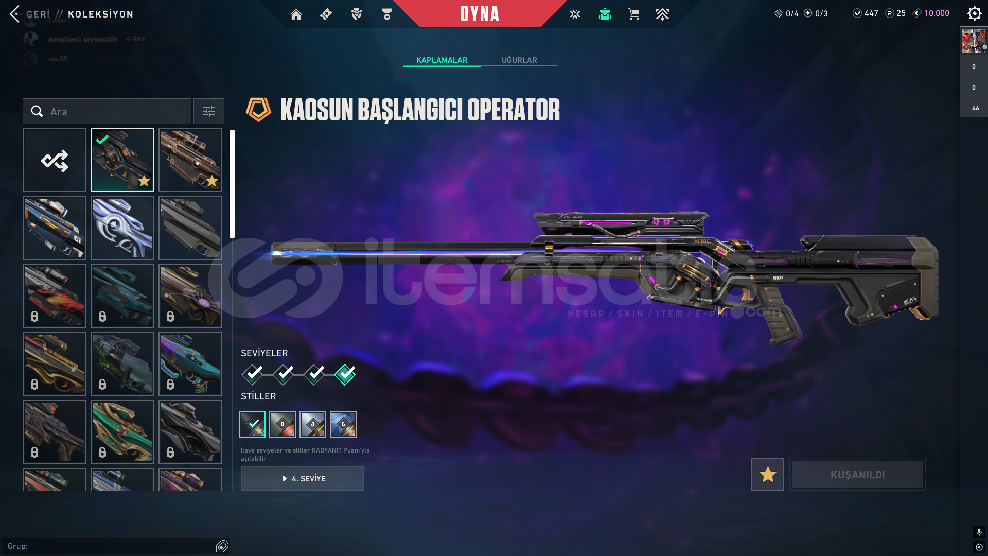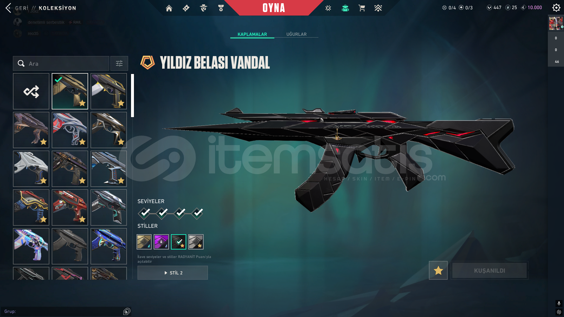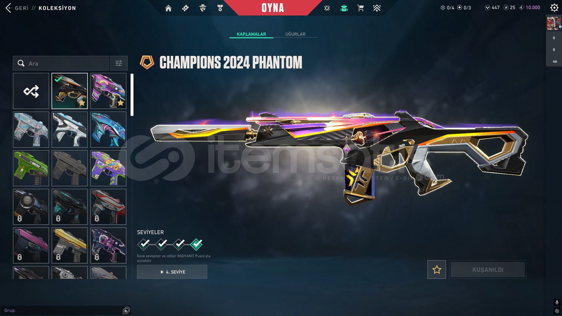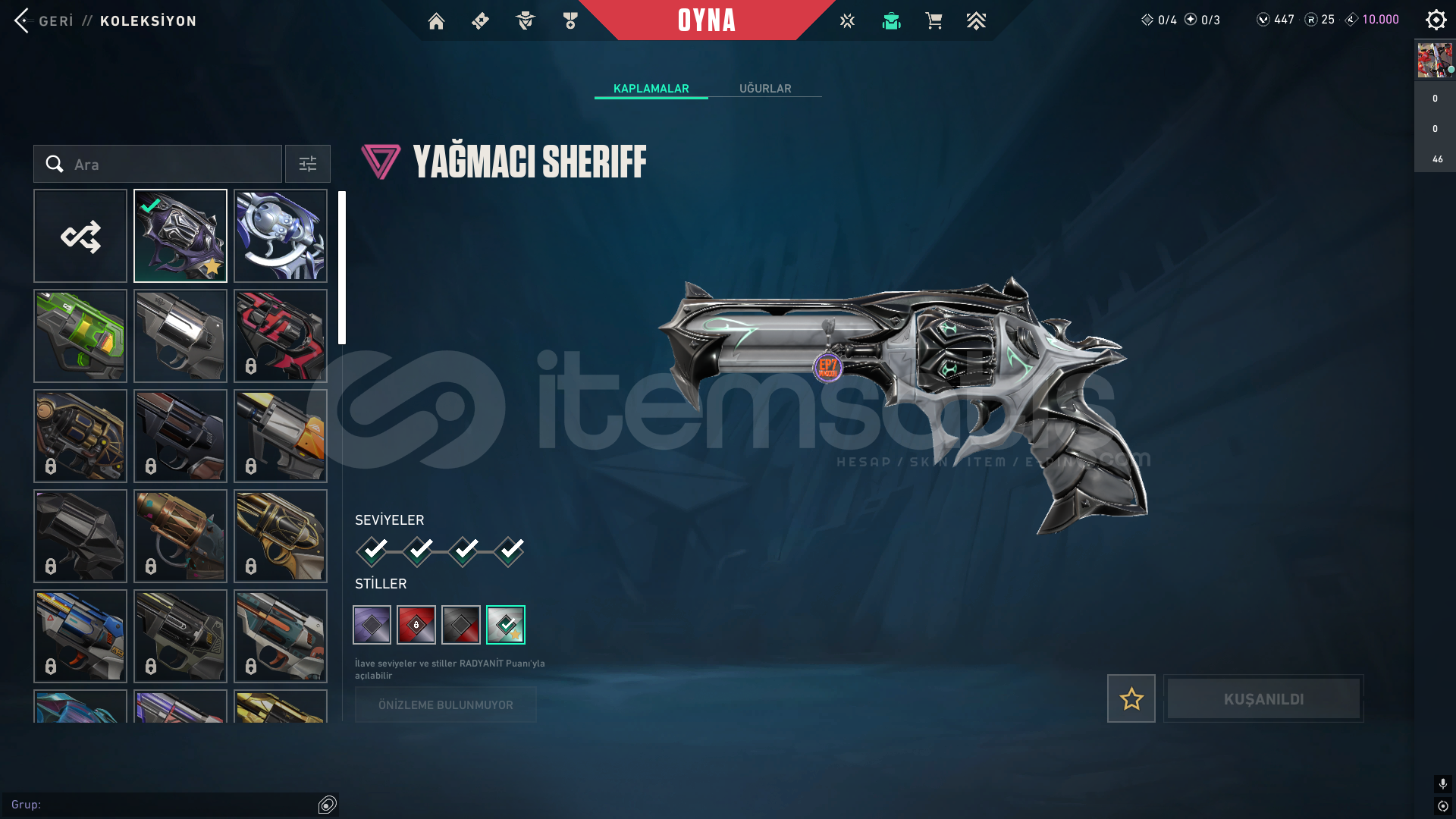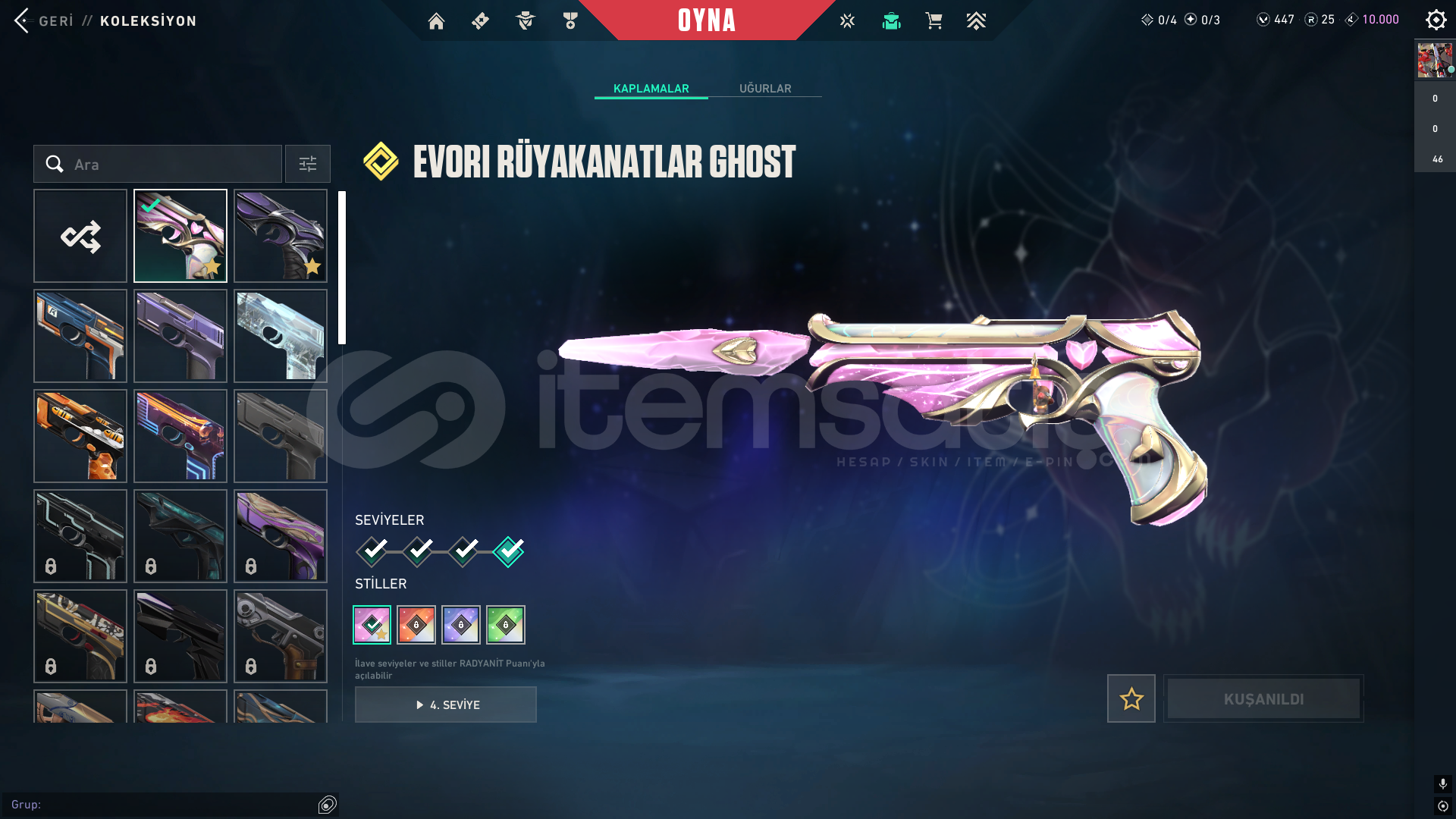 Evori Ghost , Yağmacı Ghost , Yağmacı Sheriff , Champions 2024 Phantom , Delipop Phantom , Yıldız Belası Vandal , İyon Vandal , Oni Vandal , Ejder Ateşi Vandal , Sürat Canavarı Vandal , Kaos Vandal , Kuronami Vandal , Işık Muhafızları Vandal , Gaia Vandal , Asil Vandal , Yağmacı Karambit , Asil Karambit , RGX Kelebek , Kuronami Bıçak , Champions 2024 Kılıç , Kaos Operator, Sihirpunk ...