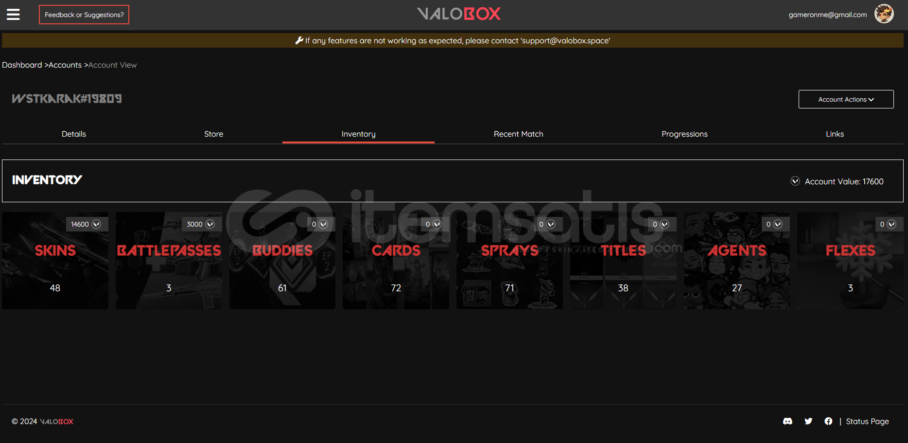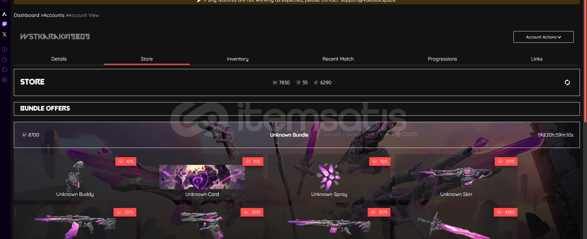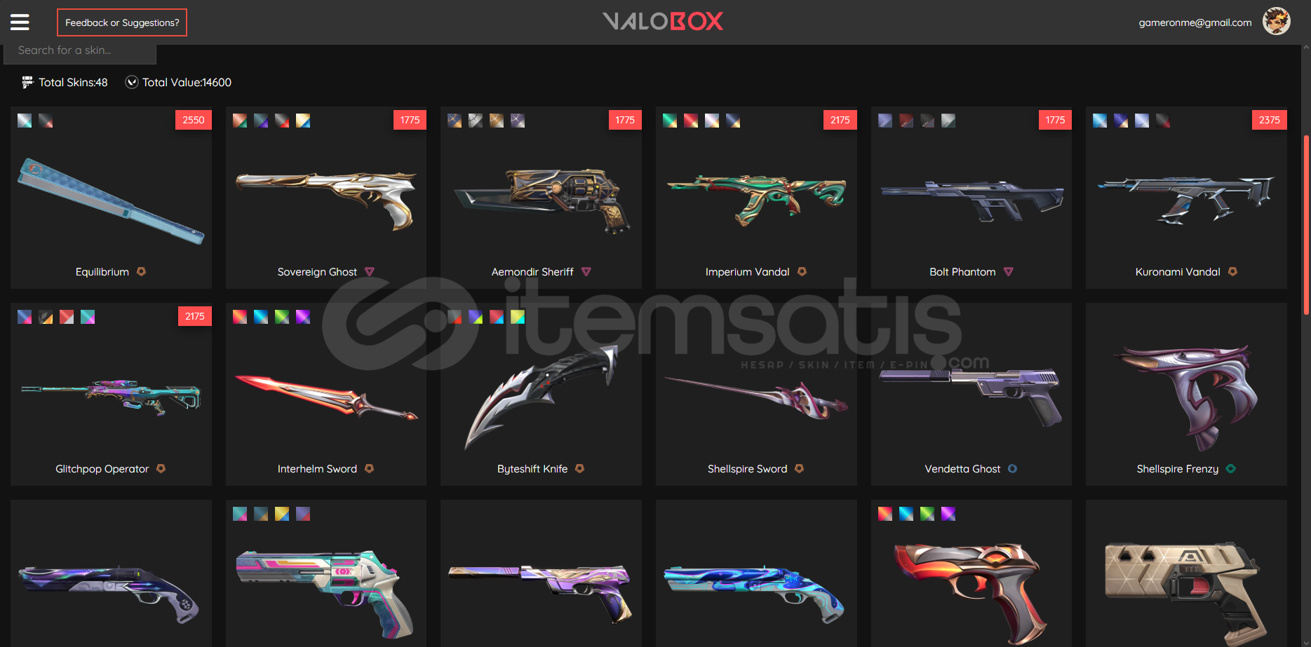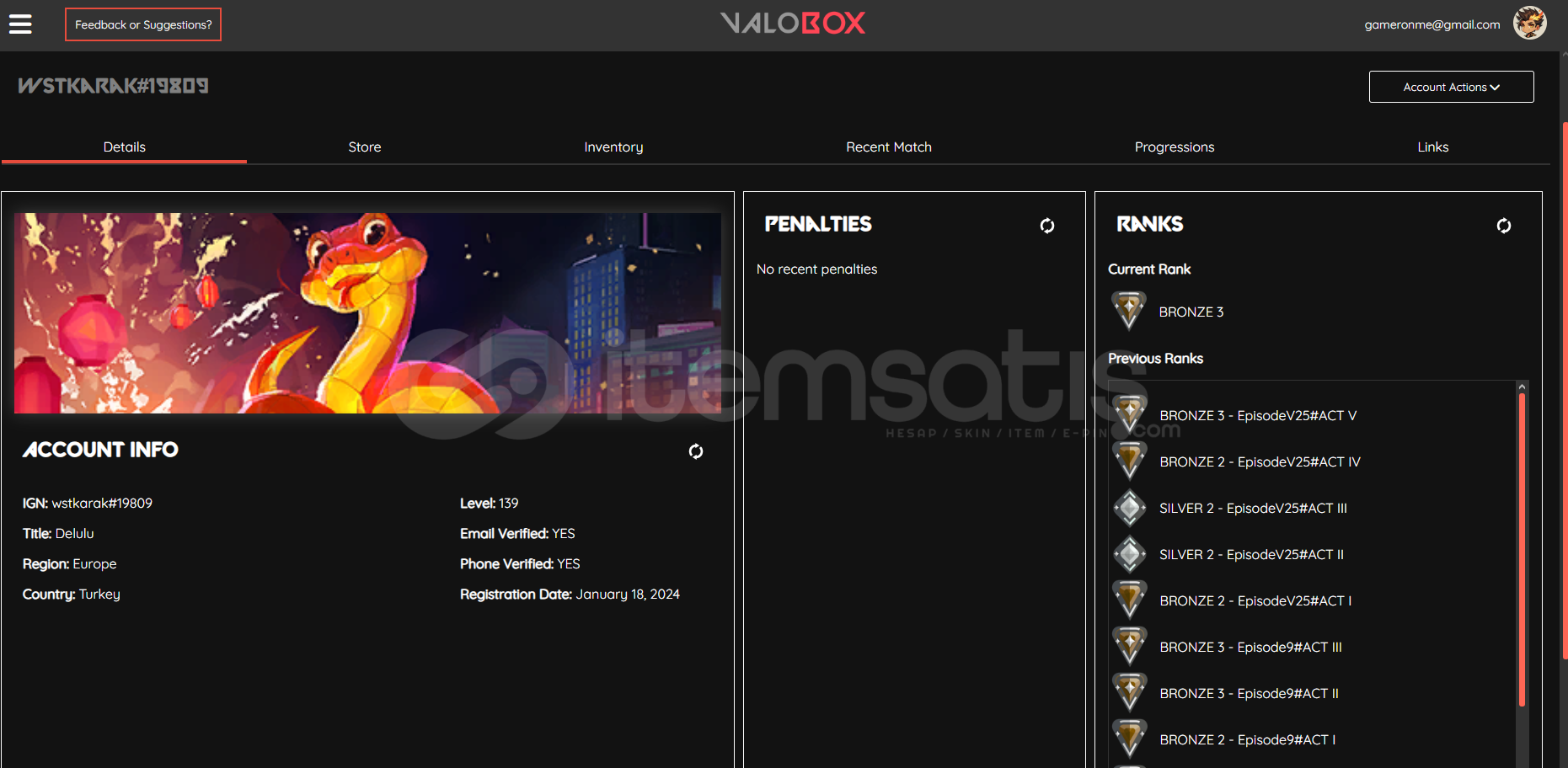 • Seviye: 120• Sunucu: TR• Rank: Bronze• VP: 7.800 VP mevcut• Toplam Yatırım: 25.000 VP üzeri• Toplam Skin: 48• Battle Pass: 3 tamamlanmış sezon• Ajanlar: 27 ajan açık• Kartlar / Sprayler / Buddyler: 70+ içerik• Değerli Skinlerden Bazıları:– Kuronami Vandal- Bolt Phantom– Glitchpop Operator– Imperium Vandal– Sovereign Ghost- Aemondir Sheriff– Equilibrium Bat&...