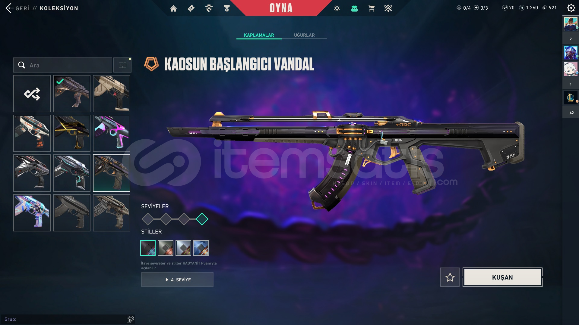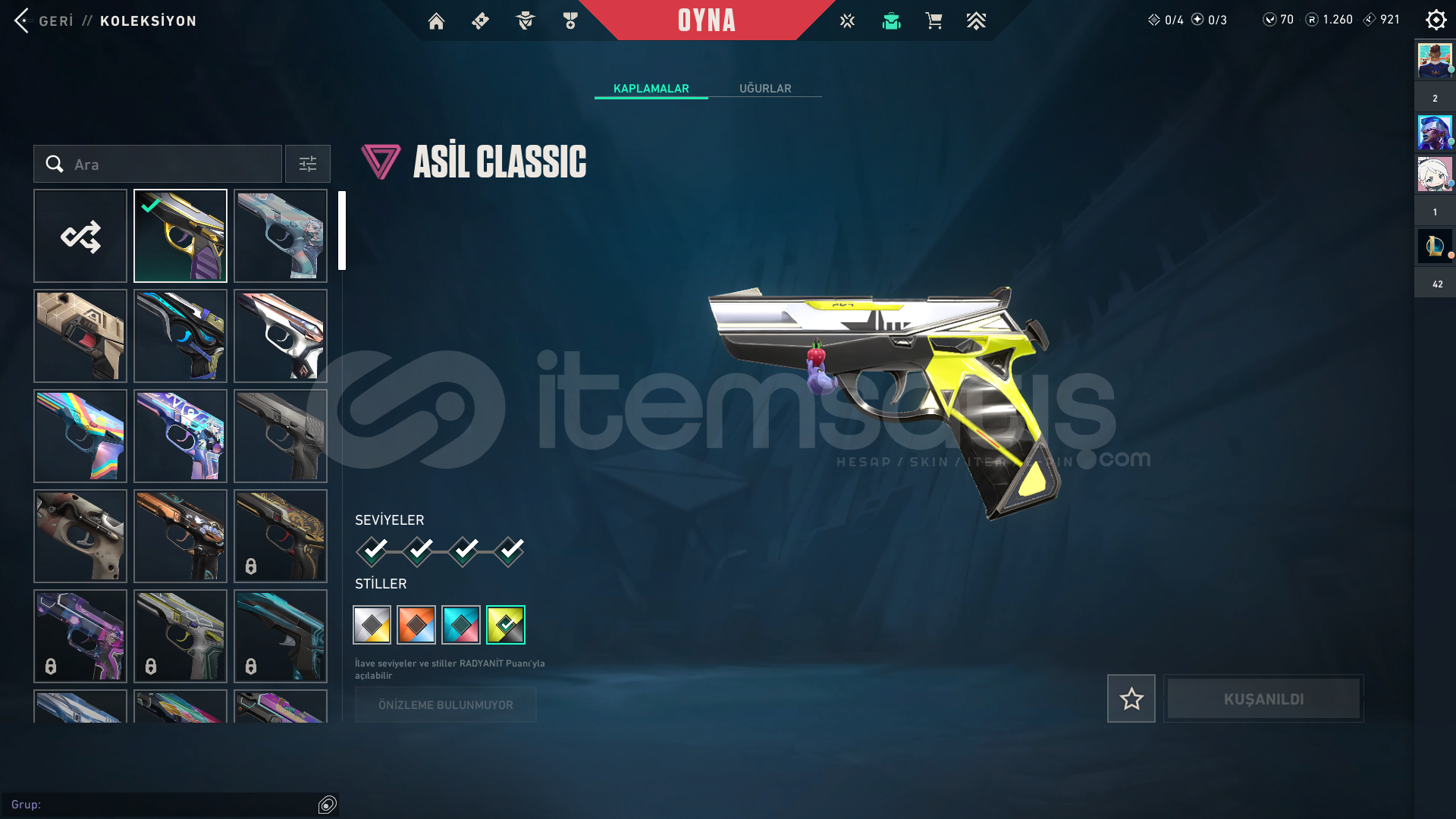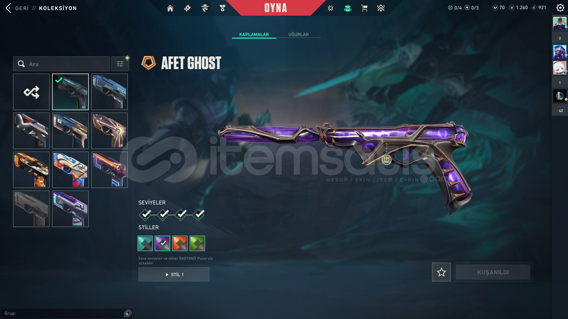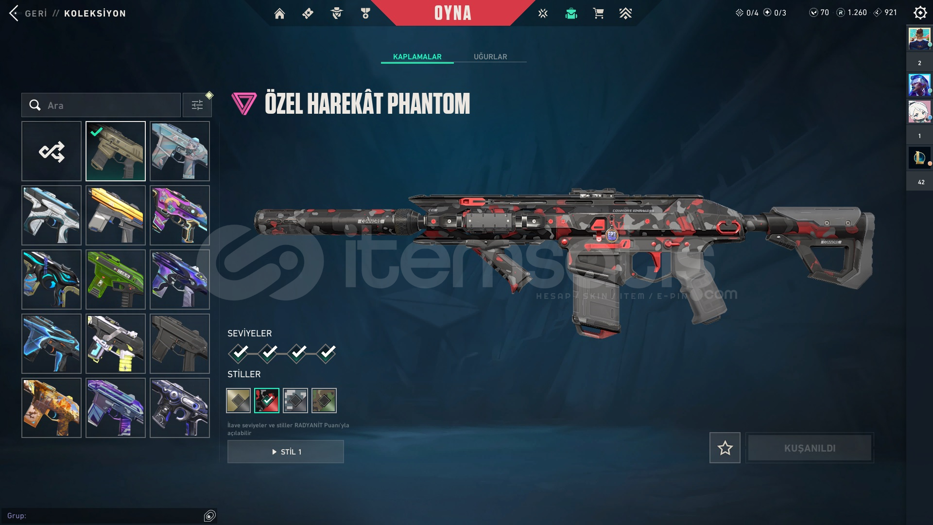 ASİL CLASSİCAFET GHOST ÖZEL HAREKET PHANTOM DELİPOP PHANTOM EJDER ATEŞİ VANDAL CHAMPİONS 2023 VANDAL KAOS VANDAL DOLU DİZGİN SOPA RGX 11Z PRO KARAMBİT Bu skinlerim hepsi son seviye ve stilleri açık hesabı açtığımdam beri çoğu savaş biletini bitirdim hali hazırda 1260 radyaniti var mail devredeceğim bıraktığımdan dolayı...