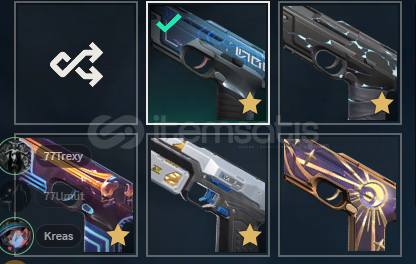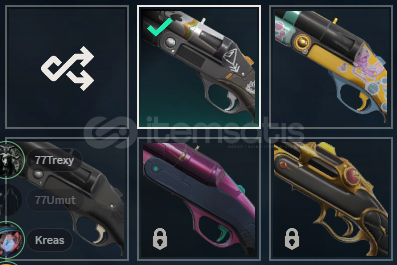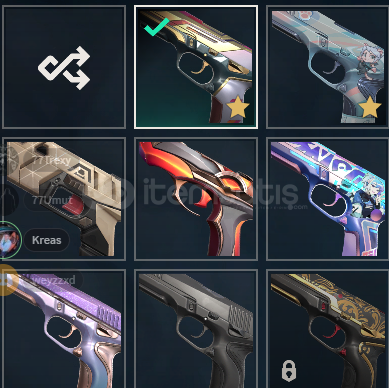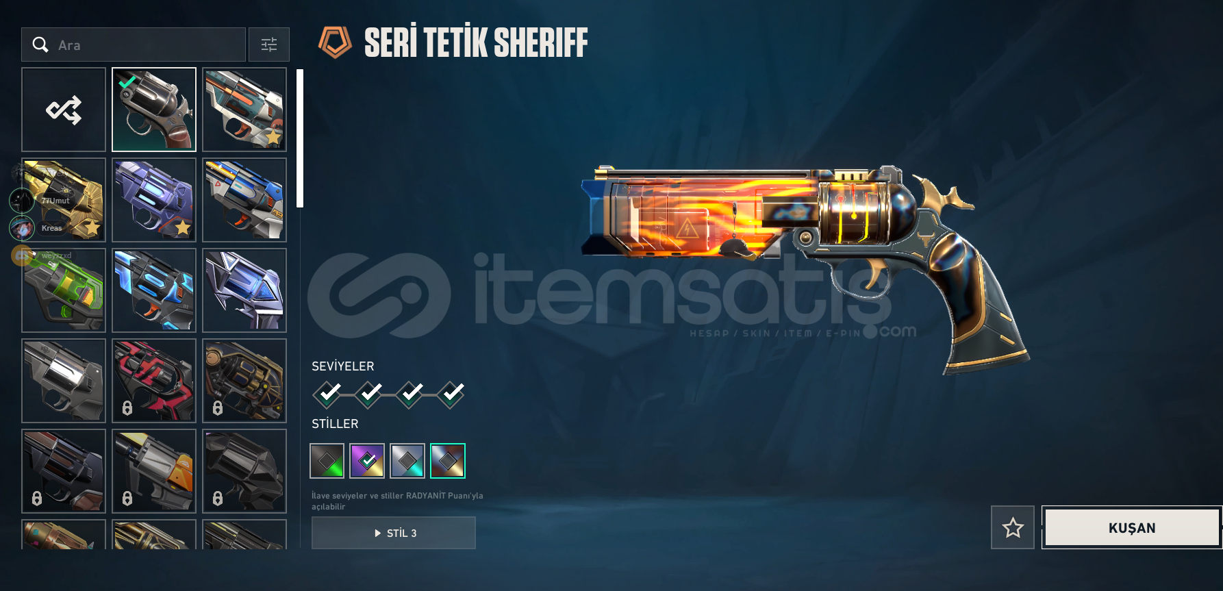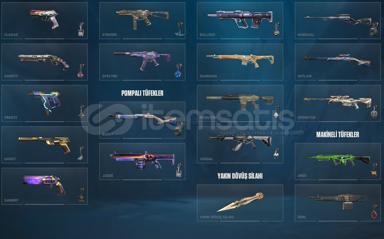 6 tane iştihamlı 1 tane seçkin seri bıçak 1 tane seçkin seri şerif (seri tetik) 2 tane battle hepsinin bütün varyantları açıık ve 200 radyanit var PAZARLIK YAPILIR
