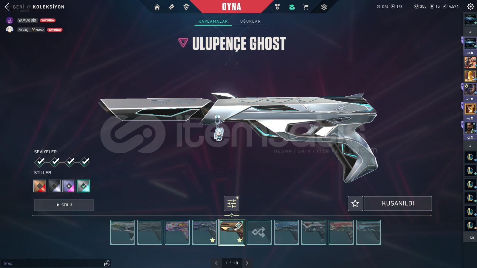 Yanında ufak 10 skinli lol hesabı vardırClassic: AsilGhost: yağmacı ve ulupençeSheriff: yağmacı,aemondır ve seri tetikGuardian: fatihPhantom: ion ve özel harekatVandal: exo,yağmacı,champions23,yitik,aemondır,cesur yürek,anomaliOperatör: KaosBıçak: asil karambit,ion karambit ve ulupençe bıçakHesap 260 lvlHesapta 8. Sezon immortal uğurluğu vardırhesapta 8.sezon elmas uğur...