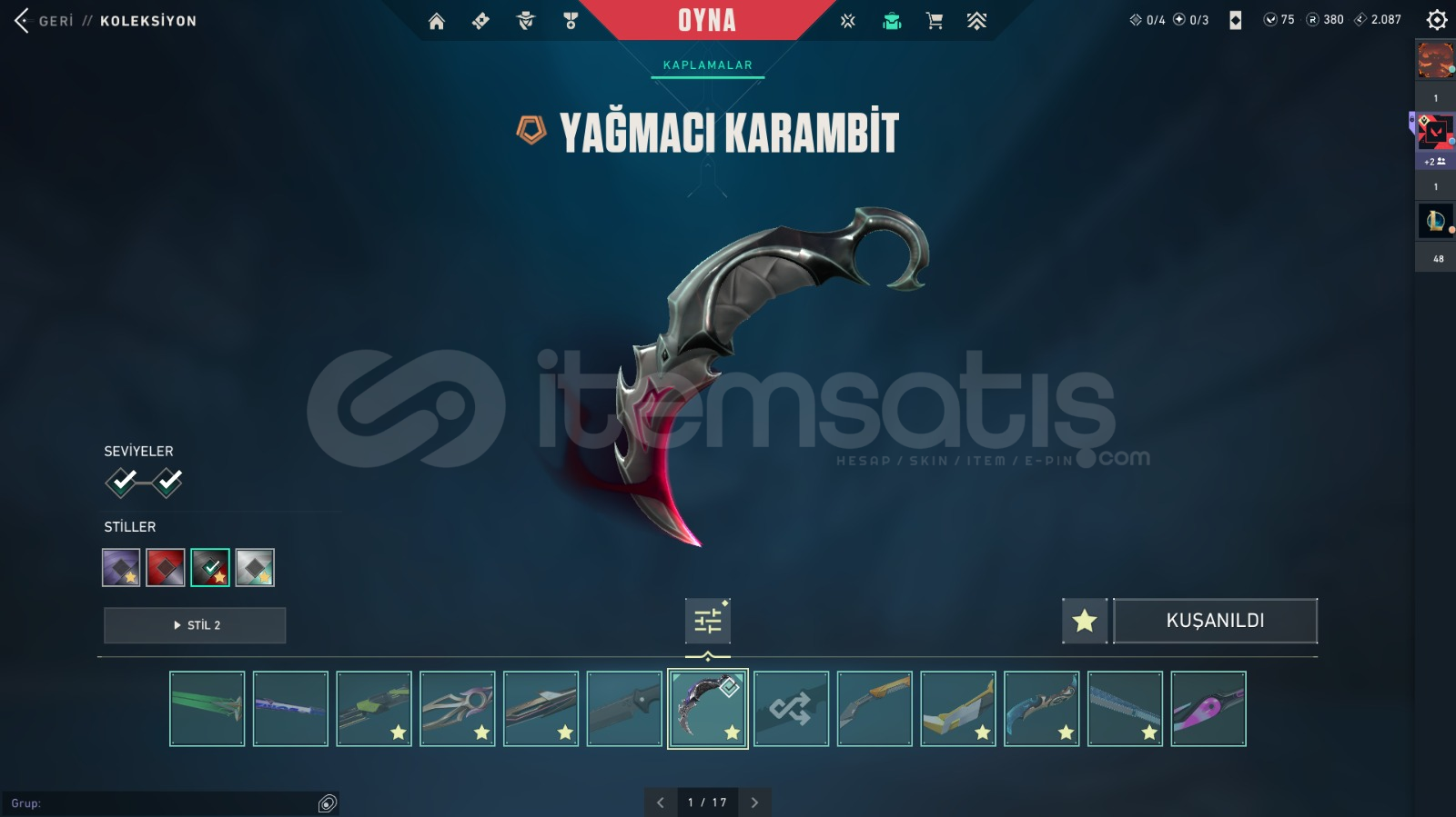 Güncel yücelik 10k yatırılmış hesapHesapta 6 tane falan battlepass aldımBıçak olarak;Yağmacı karambitAsil karambiRgx katanaDengeGaianin gazabı (ikili olan)Ay yadigarıUlupence bicakSircicegi kunaiVandal olarak;KaosAsılİyonFelaketin kalbiKuronamiDiğer skinlerden ise;Spectrum phantomSeri tetik şerifSeri tetik marşalYağmacı spectreYağmacı guardianAsil klasikCesur yürek operatör6-...