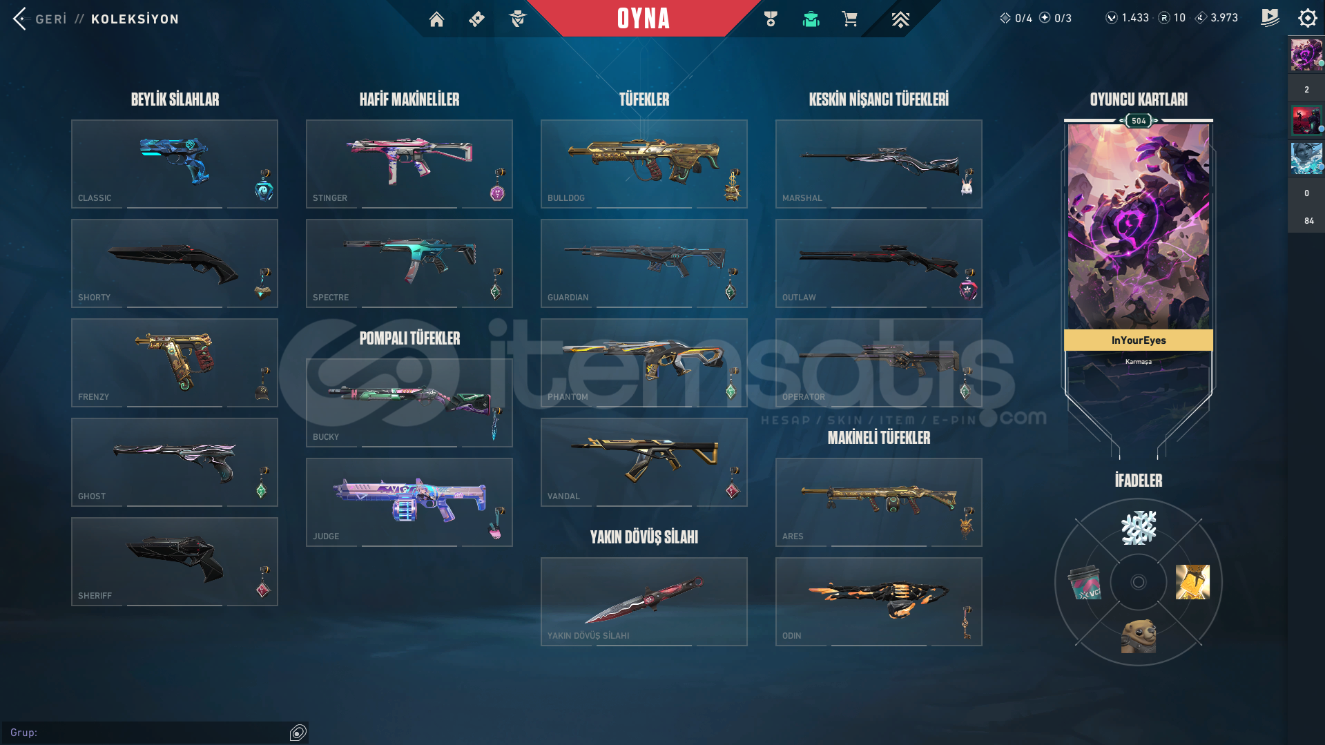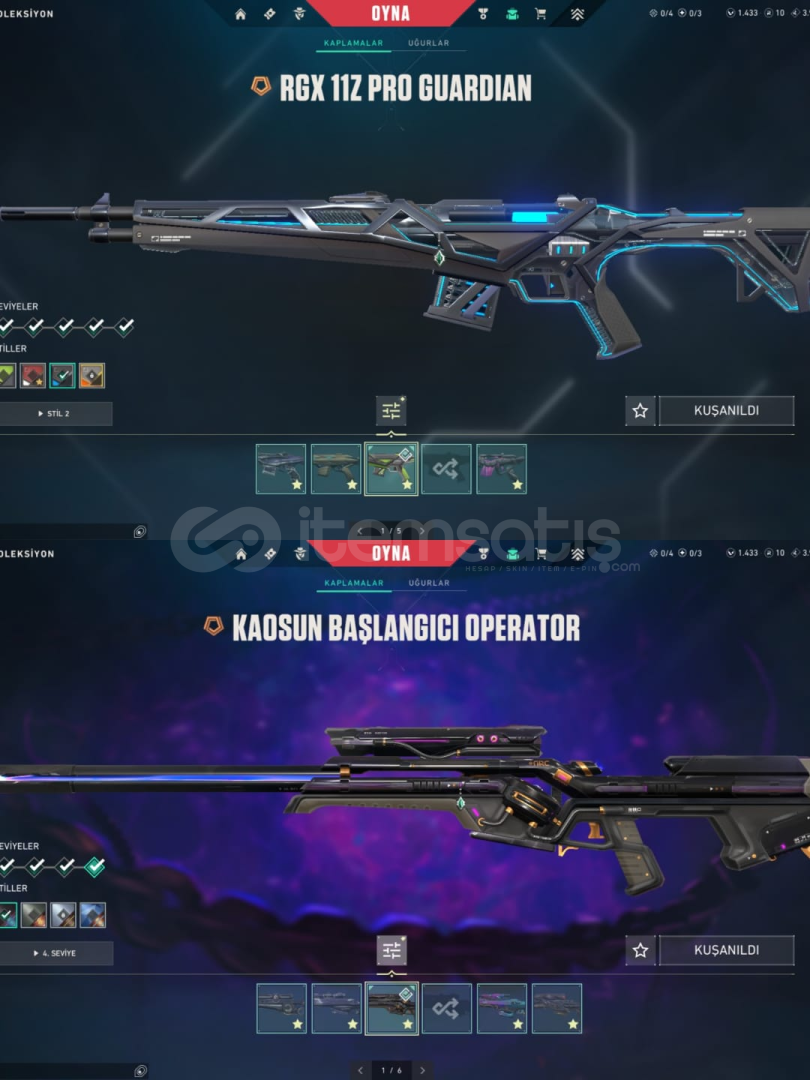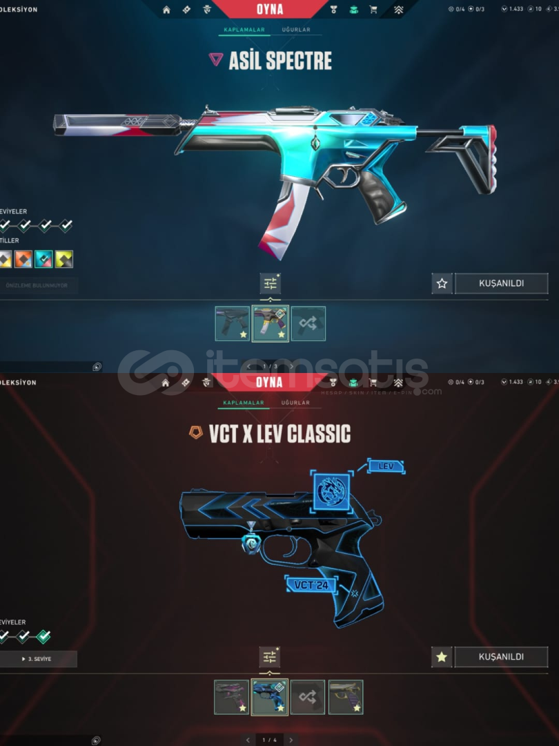 CLASSIC: VCT LEVİATHAN, ASİL, DOLMİR(3)SHORTY: YILDIZ BELASI(1)FRENYZ: ONİ(1)GHOST: FATİH, ANOMALİ(2)SHERİF: YAĞMACI, YILDIZ BELASI, ANOMALİ, SİHİRPUNK(4)SPECTRE: ASİL, ANOMALİ(2)BULLDOG: ONİ(1)GUARDIAN: YAĞMACI, RGX , YILDIZ BELASI, DOLMİR(4)MARSHALL: FATİH(1)OUTLAW: YILDIZ BELASI(1)OPERATOR: DELİPOP, YAĞMACI, KAOS, KÖKEN, EJDER(5)ARES: ONİ(1)ODIN: DOLMİR(1)PHANTOM: ONİ, ANOMAL...