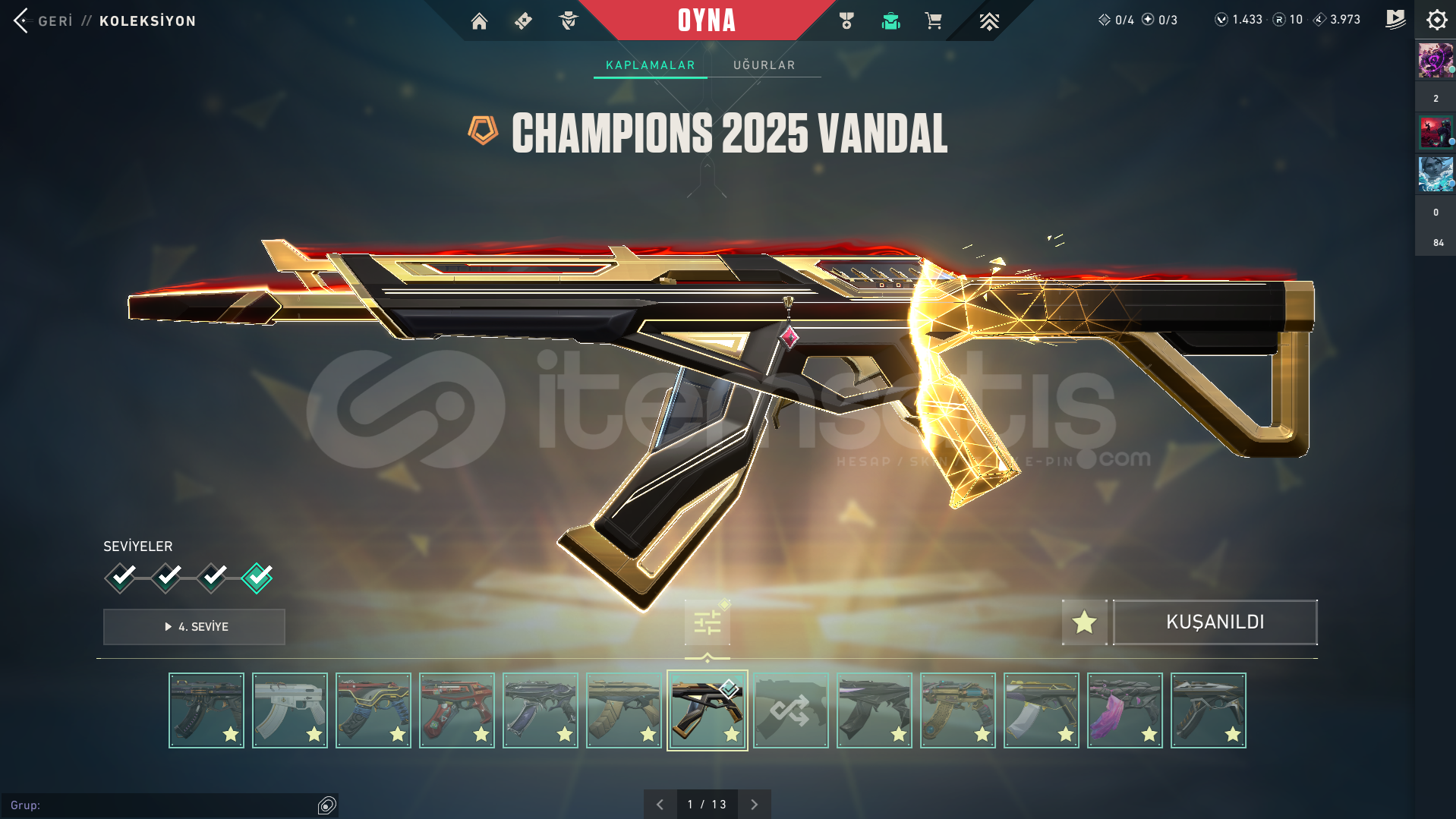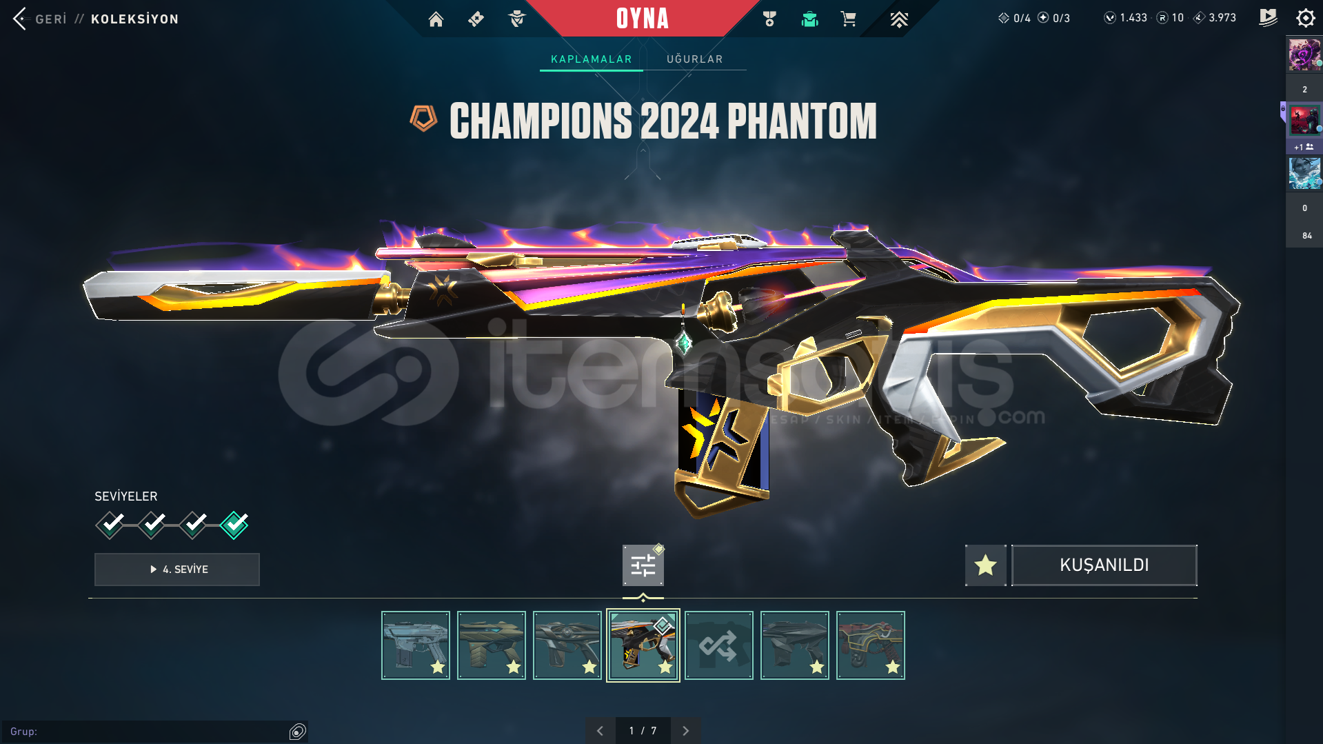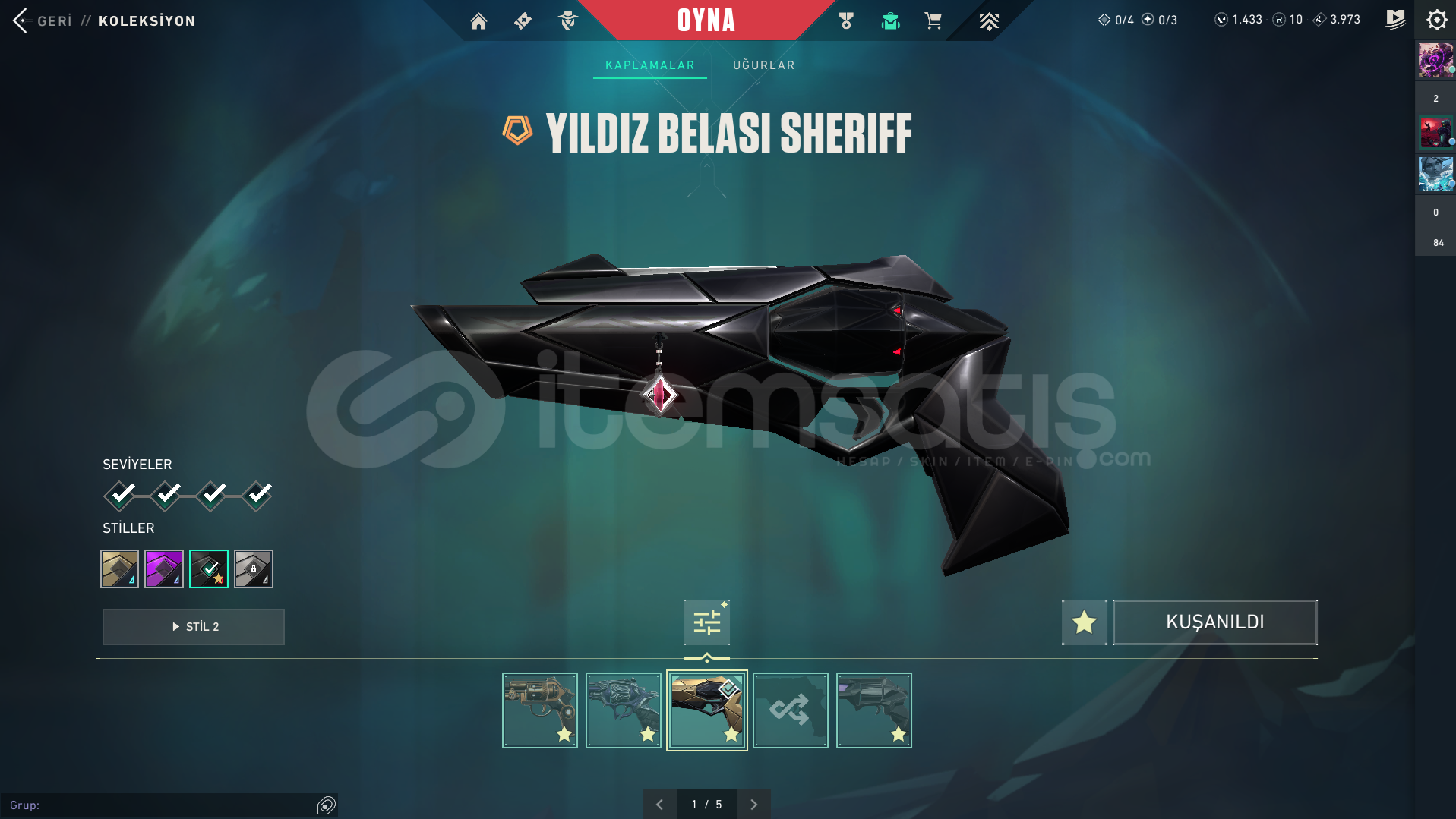 CLASSIC: VCT LEVİATHAN, ASİL, DOLMİR(3)SHORTY: YILDIZ BELASI(1)FRENYZ: ONİ(1)GHOST: FATİH, ANOMALİ(2)SHERİF: YAĞMACI, YILDIZ BELASI, ANOMALİ, SİHİRPUNK(4)SPECTRE: ASİL, ANOMALİ(2)BULLDOG: ONİ(1)GUARDIAN: YAĞMACI, RGX , YILDIZ BELASI, DOLMİR(4)MARSHALL: FATİH(1)OUTLAW: YILDIZ BELASI(1)OPERATOR: DELİPOP, YAĞMACI, KAOS, KÖKEN, EJDER(5)ARES: ONİ(1)ODIN: DOLMİR(1)PHANTOM: ONİ, ANOMAL...