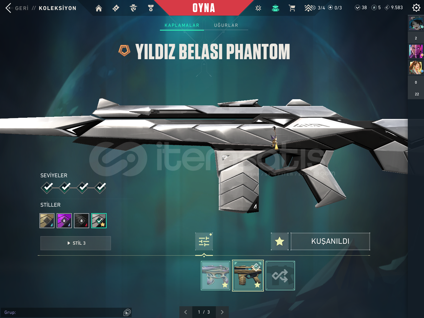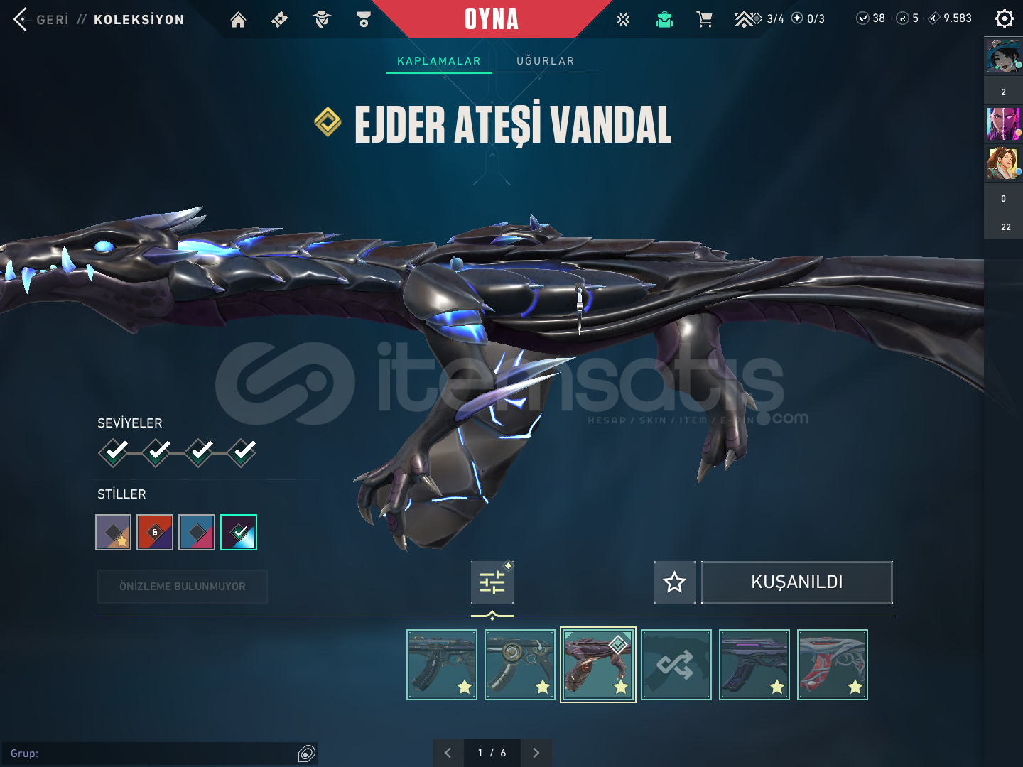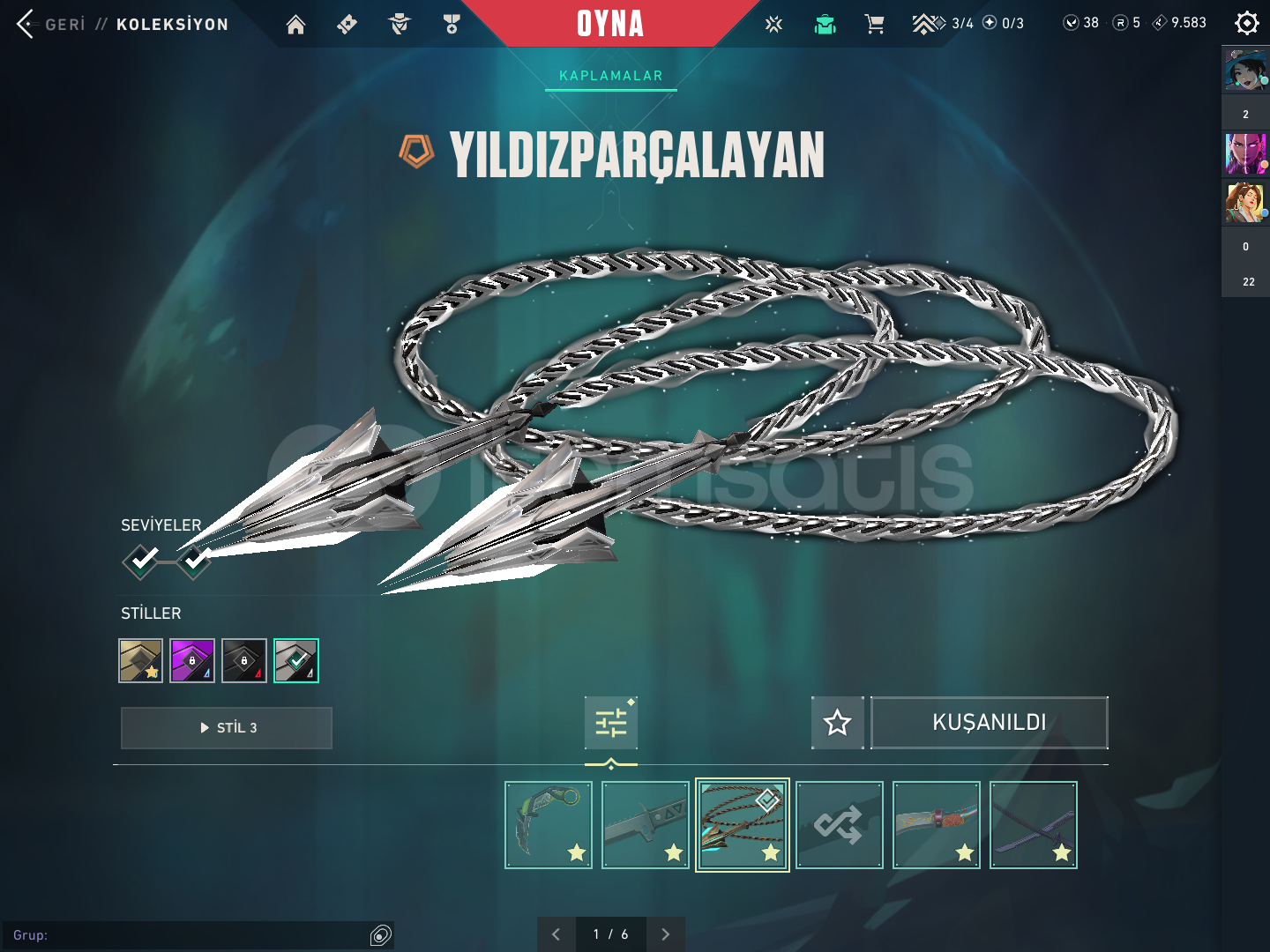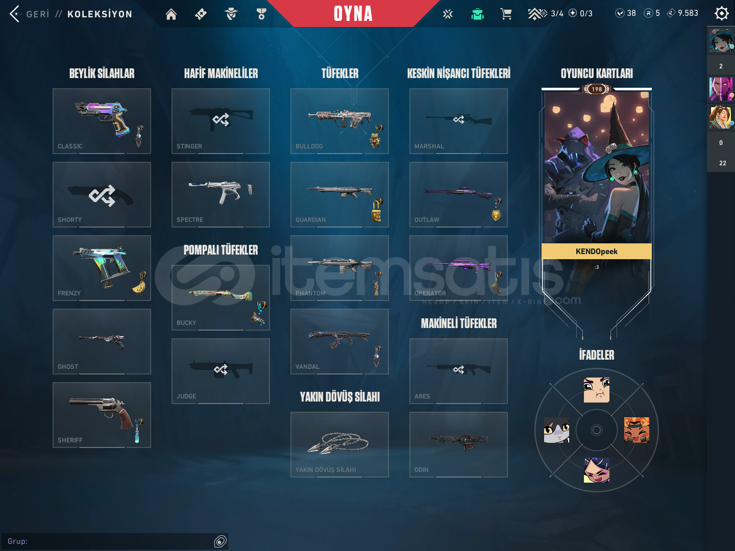 TOPLAM 110 ADET SKİN MEVCUTRGX 2. SETEXO SETYILDIZ BELASSI 2. SETBIÇAKLAR:KATRİNARGX KARAMBİTEXO KATANAUZAYLI AVCISIYILDIZ PARÇALAYANVANDALLAR:KÖKENGAİYAEJDERKAOSEXOPHANTOMLAR:YILDIZ BELASISIR ÇİÇEĞİDÜĞÜN YAPICAĞIM İÇİN SATIYORUM ALANA HAYIRLI OLSUN.