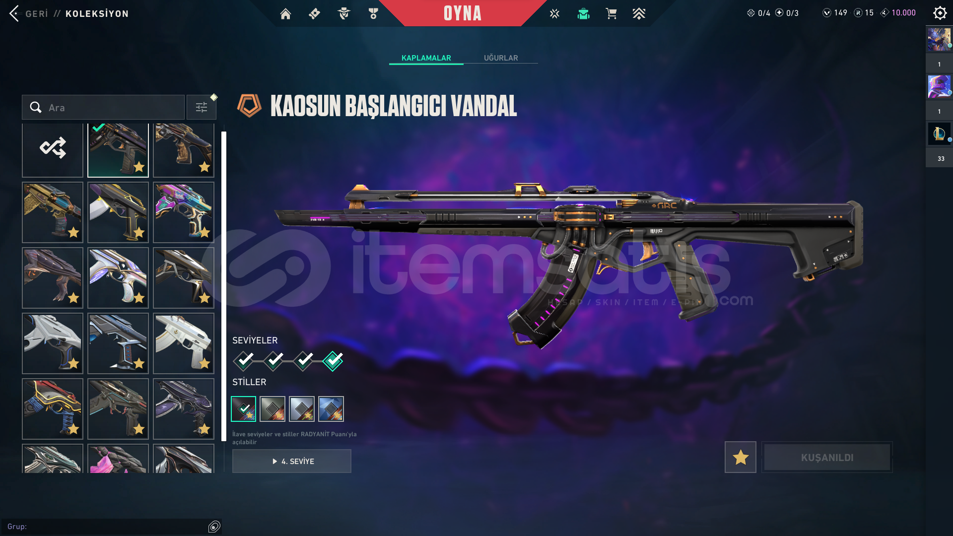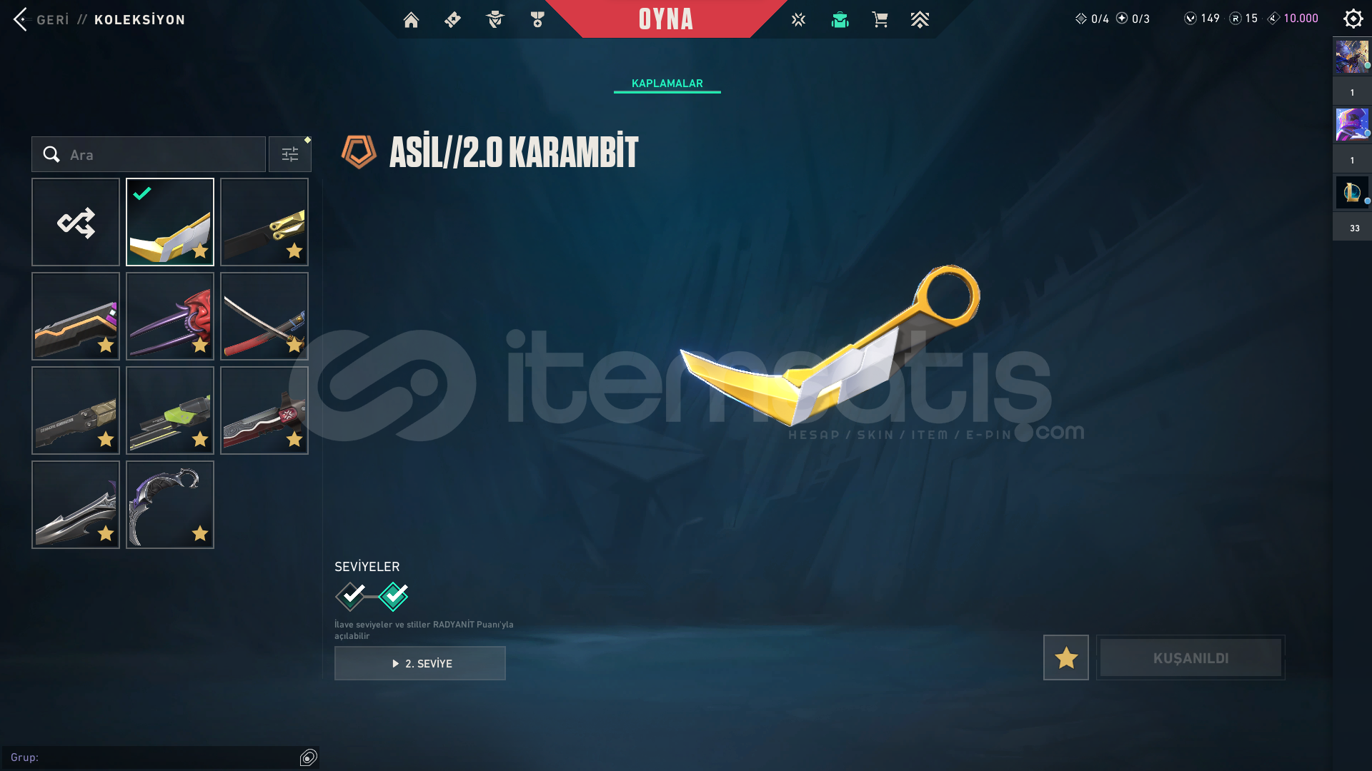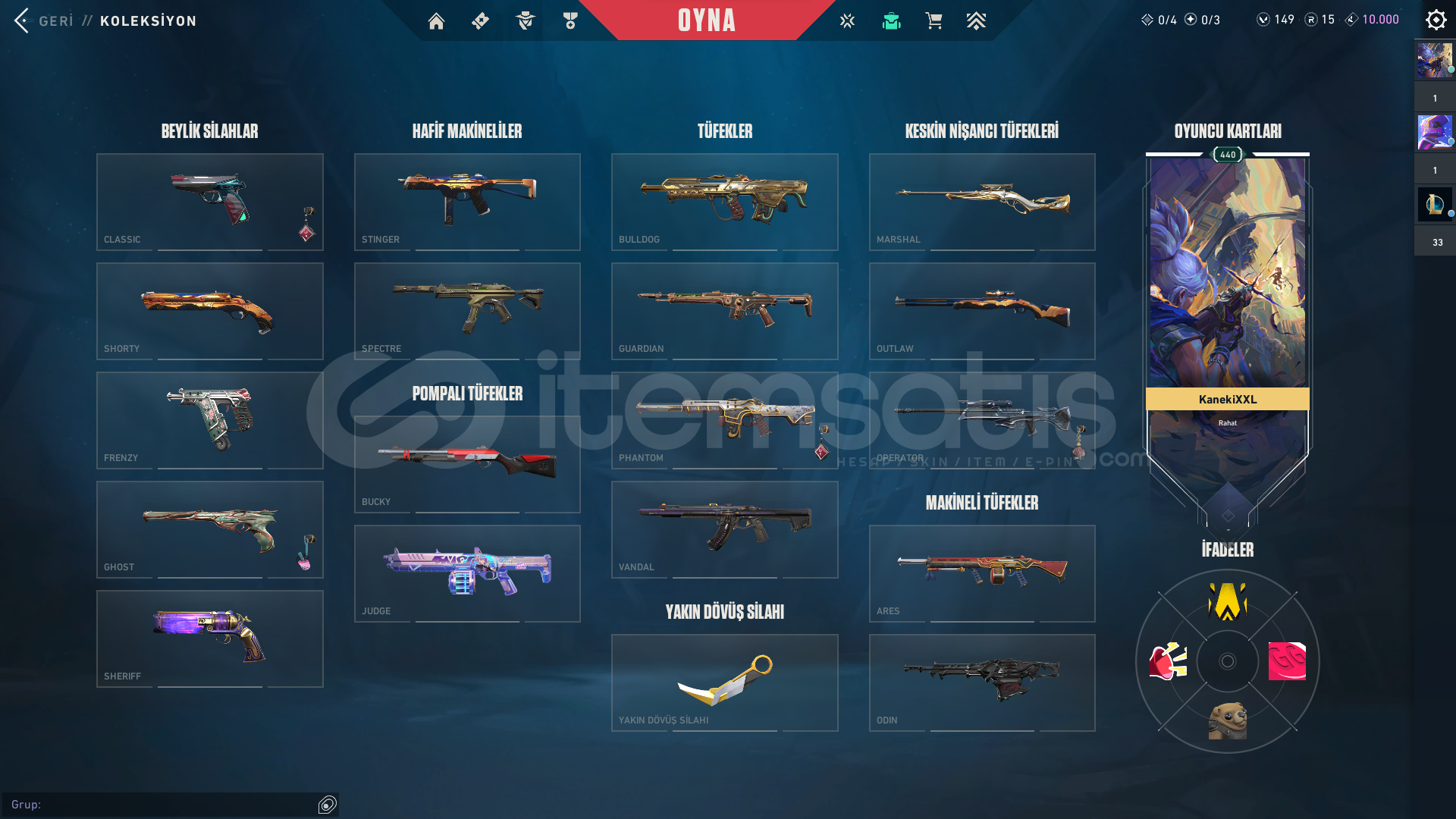 17 adet premium vandal 10 adet premium phantom 10 adet bıçak 2 adet guardian 1 adet bulldog 3 adet spectre 3 adet sheriff 2 adet ghost 1 adet frenzy 2 adet classic 1 adet marshall 3 adet operator 1 adet ares 2 adet odin ve üstüne fazlasıyla battle pass skini vardır. 149 vp ve 15 radyanit bulunmaktadır. Peak rankı immortal 2 şu an ki rankı immortal 1dir.