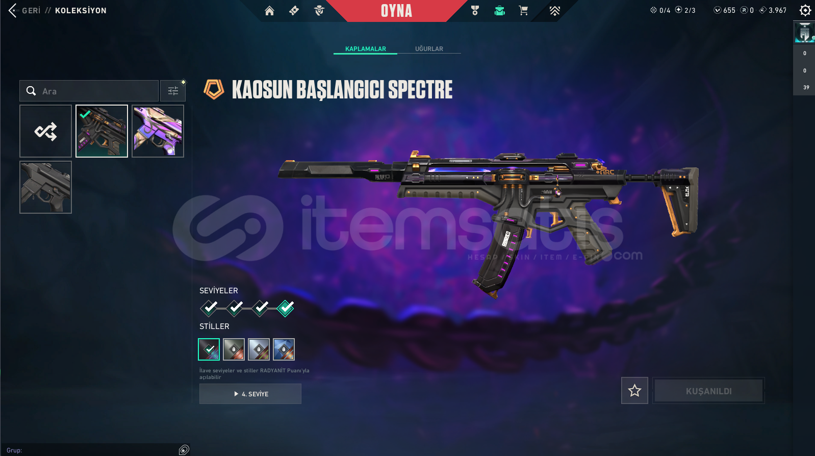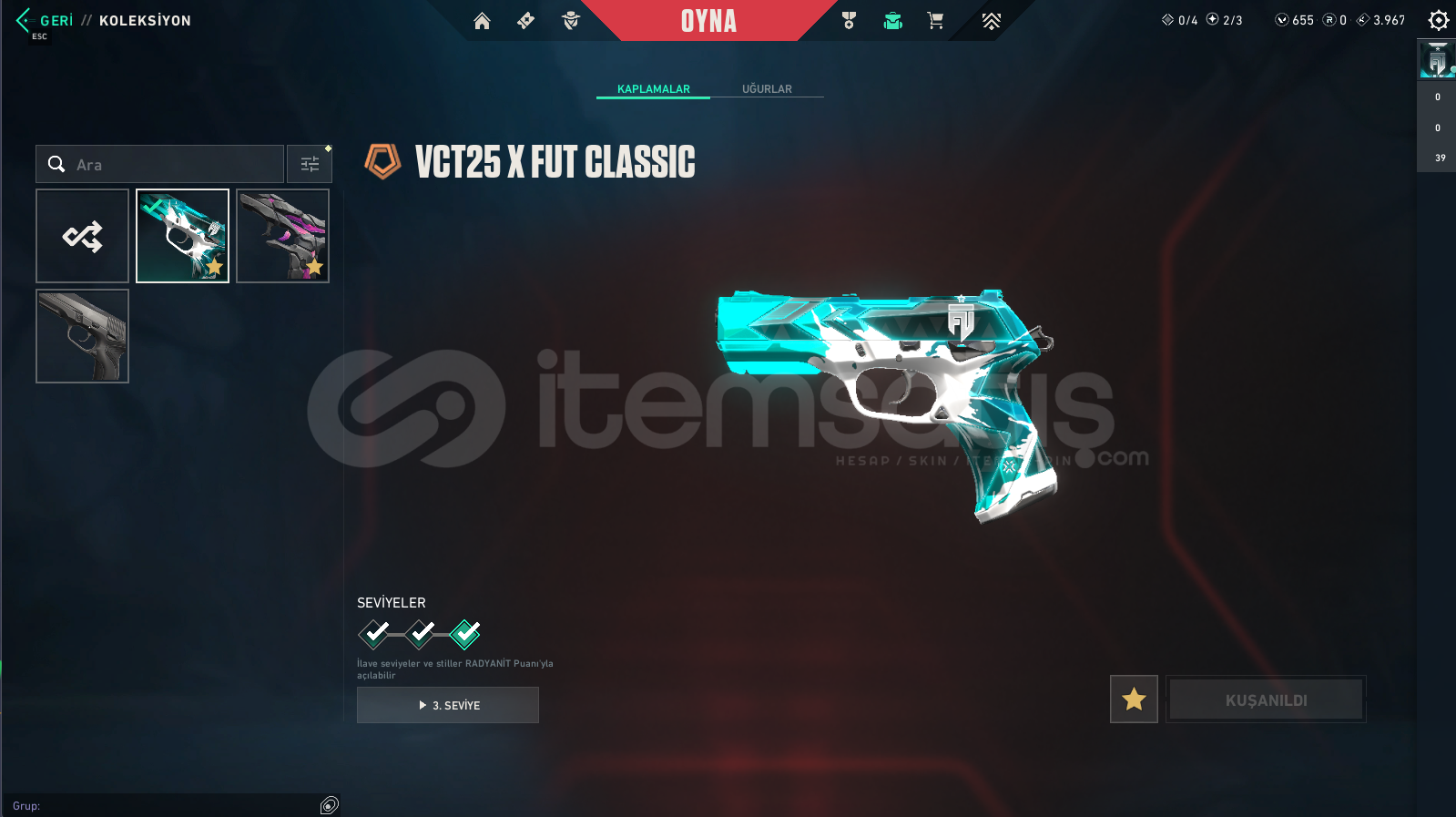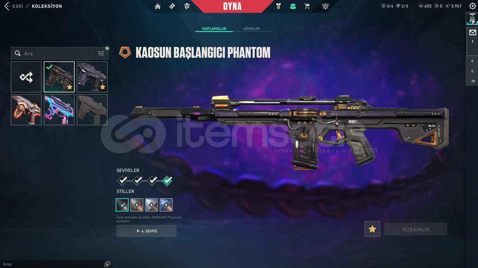 Vandallar: Champions 2025 Vandal , Asil Vandal , Dolmir in İntikamı Vandal , Exo Vandal , Gaia Vandal , Rgx Vandal , Ejder Ateşi VandalPhantomlar: Kaosun Başlangıcı Phantom , Yağmacı PhantomBıçaklar: Rgx Kelebek , Dolmirin Adaleti , Kaos Gürzü , Kalp YaranSheriff: Kaosun Başlangıcı Sheriff , Yağmacı Sheriff , Sırçiçeği SheriffGhostlar: Evori Rüyakanatlar Ghost , Anomali GhostClassi...