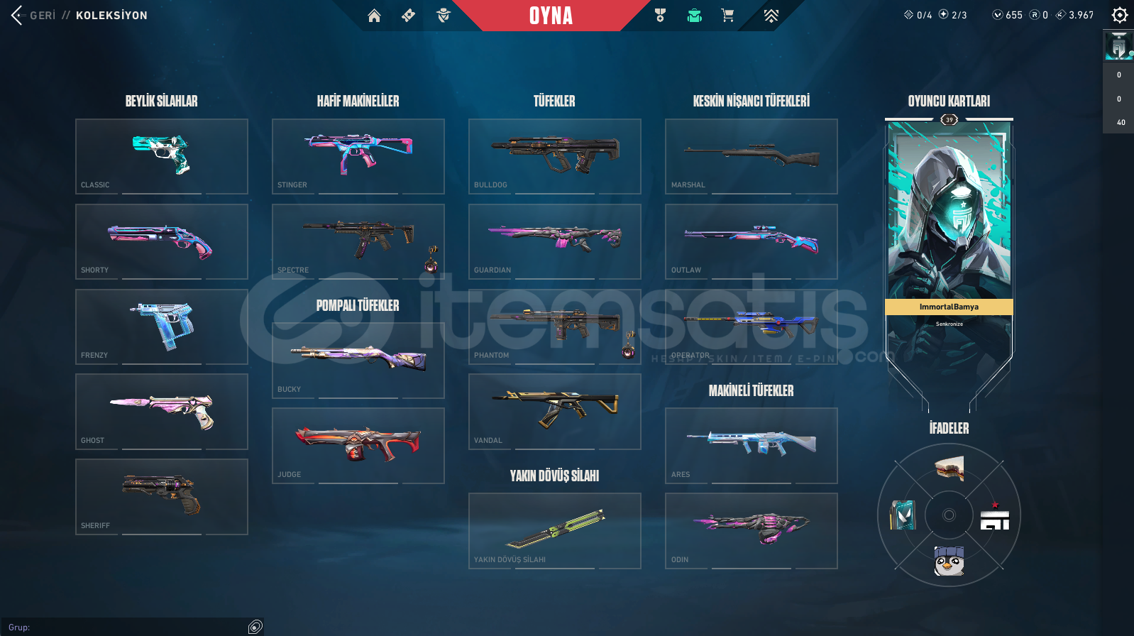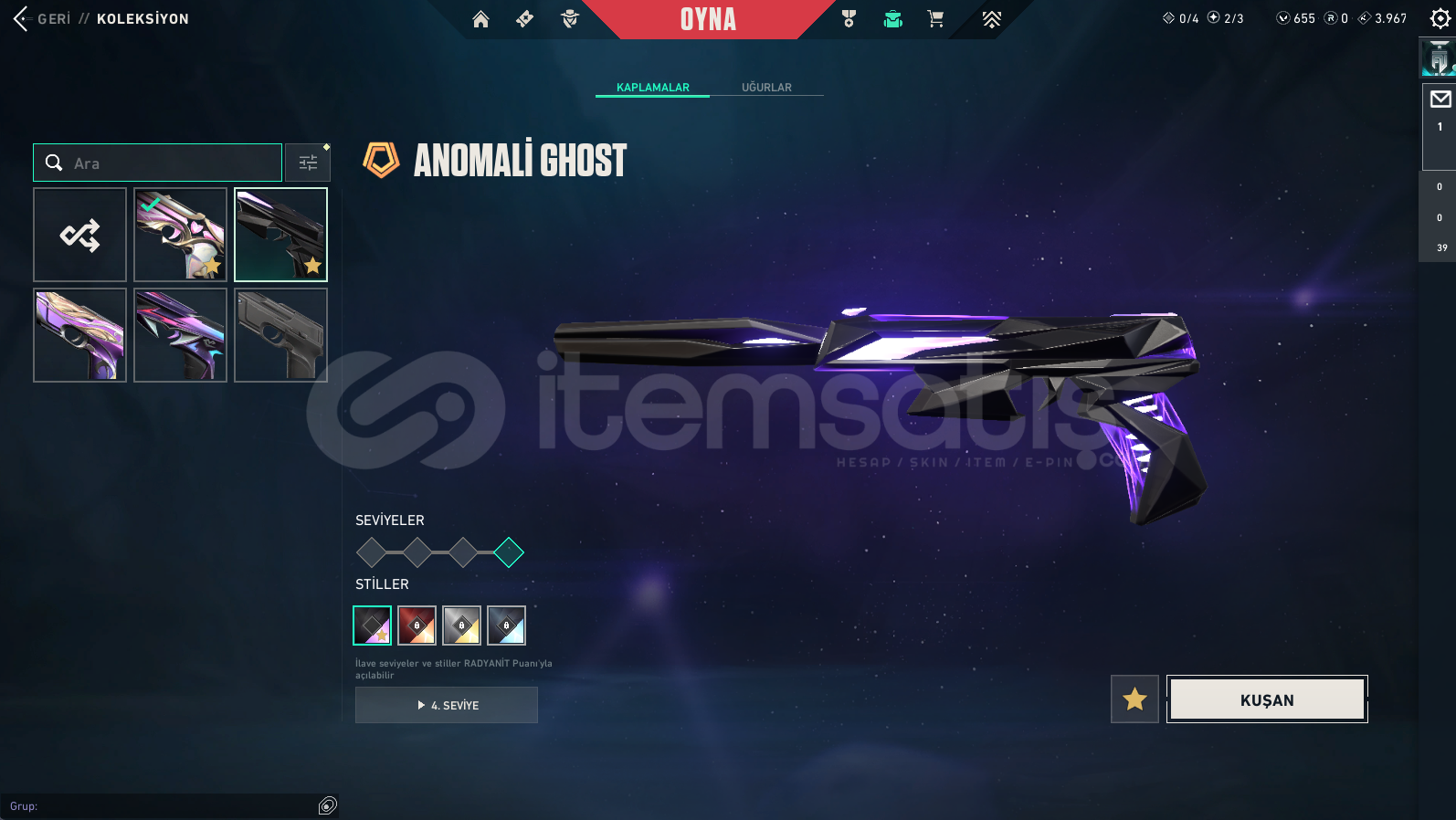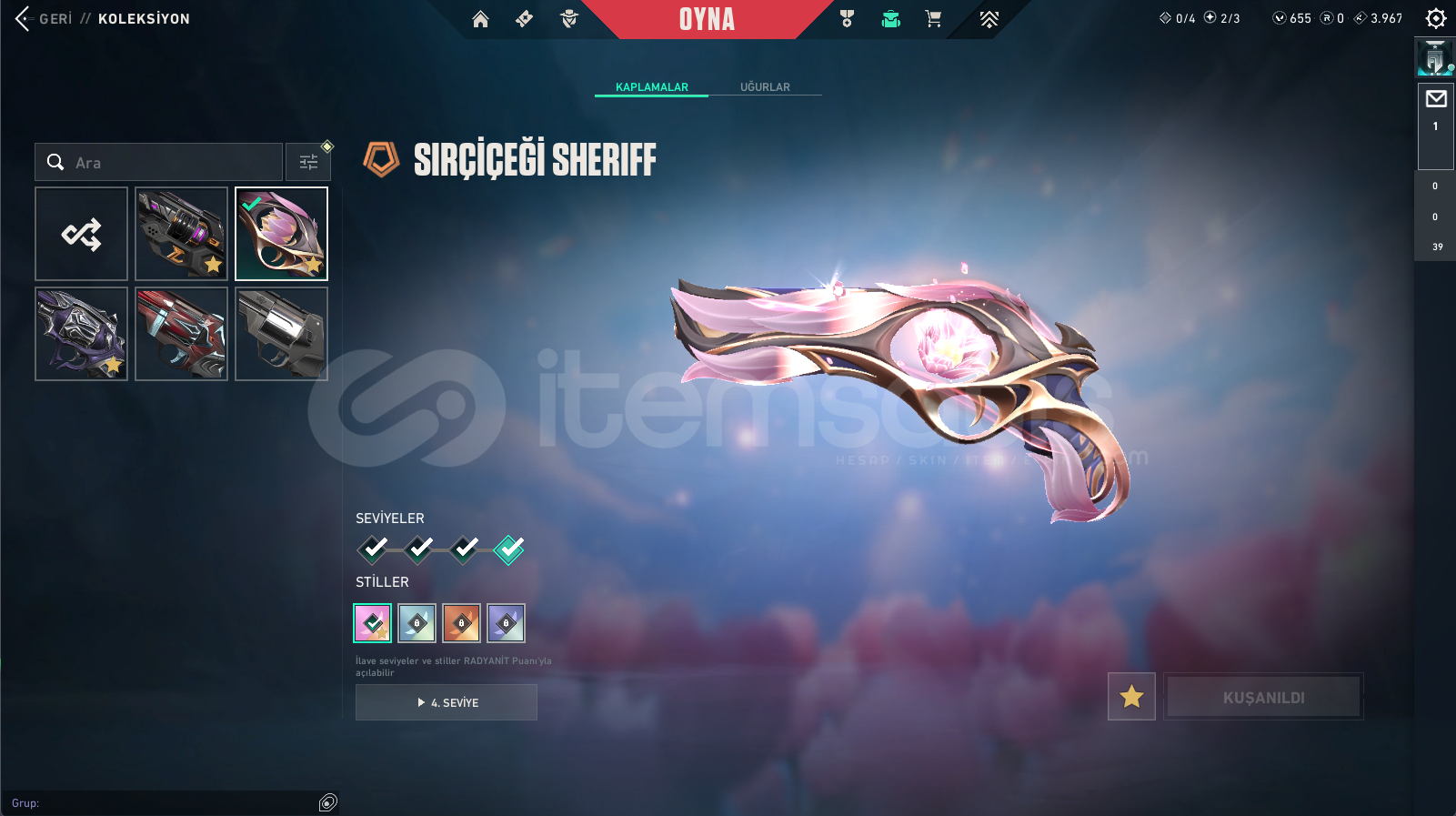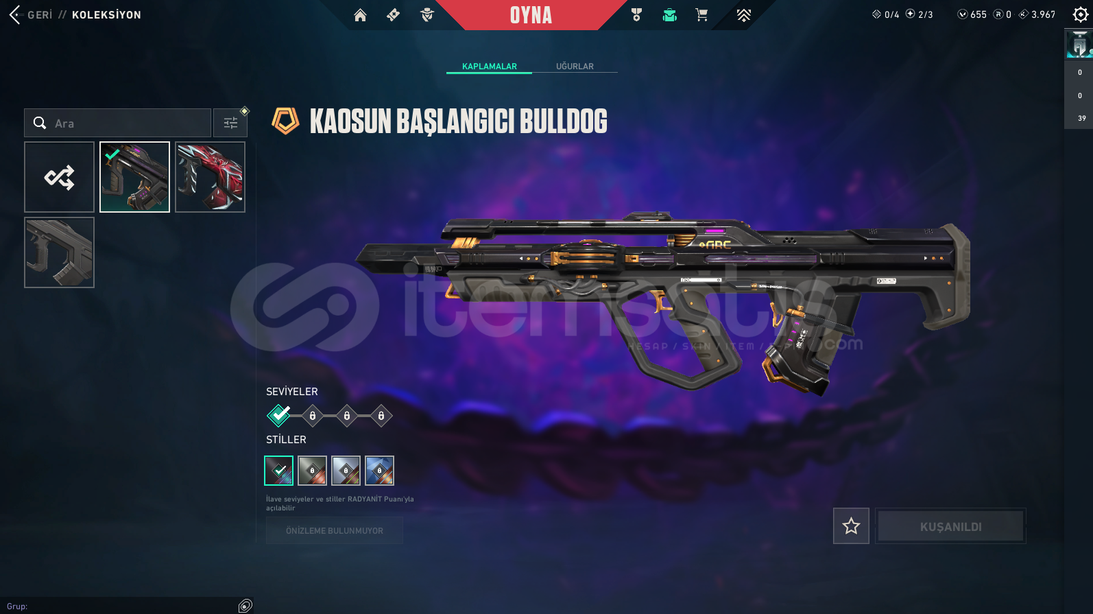 Vandallar: Champions 2025 Vandal , Asil Vandal , Dolmir in İntikamı Vandal , Exo Vandal , Gaia Vandal , Rgx Vandal , Ejder Ateşi VandalPhantomlar: Kaosun Başlangıcı Phantom , Yağmacı PhantomBıçaklar: Rgx Kelebek , Dolmirin Adaleti , Kaos Gürzü , Kalp YaranSheriff: Kaosun Başlangıcı Sheriff , Yağmacı Sheriff , Sırçiçeği SheriffGhostlar: Evori Rüyakanatlar Ghost , Anomali GhostClassi...