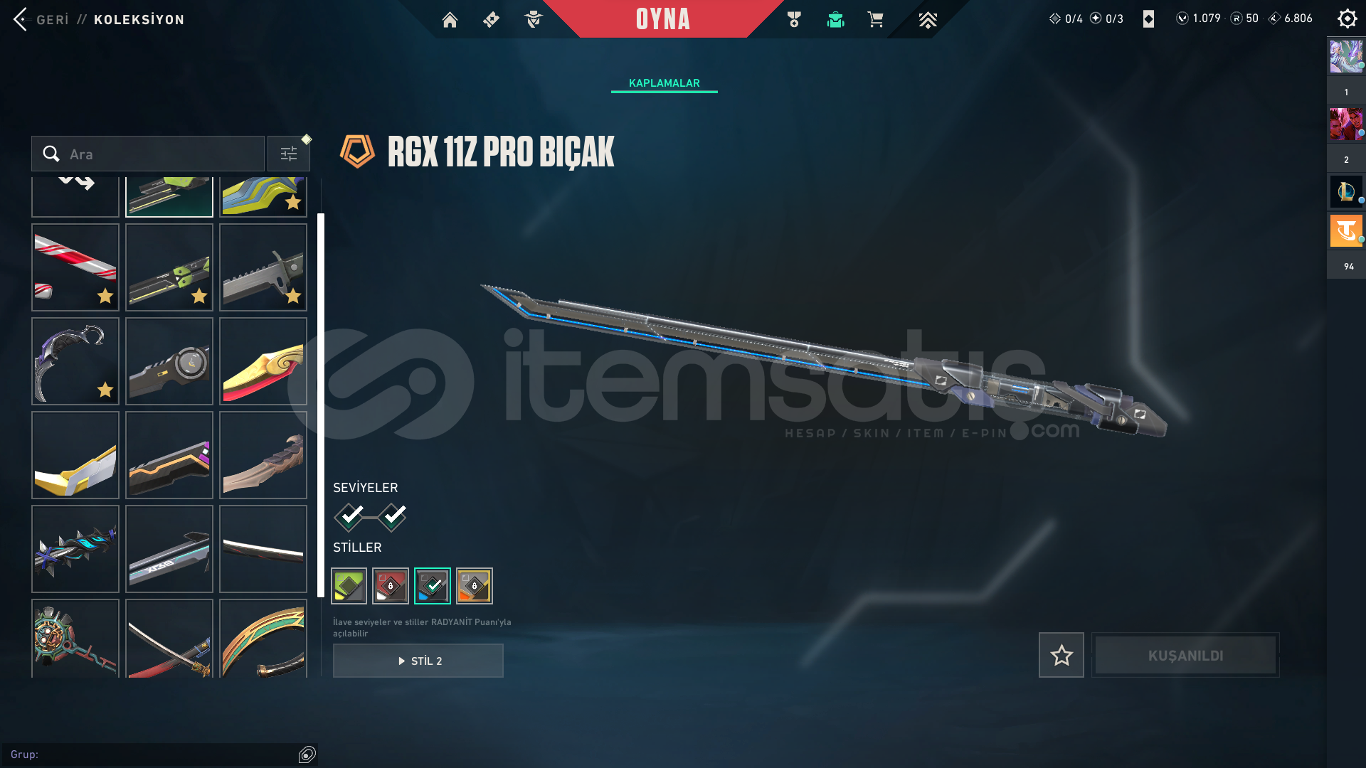 BIÇAK: rgx katana, kış harikası baston, rgx kelebek, uzaylı avcısı, yağmacı karambit, alaz yelpaze, asil karambit, delipop hançer, ejder hançer, kaplan dişi, oni katana, serketin bıçağı, valorant go 1. cilt, yitik hançer