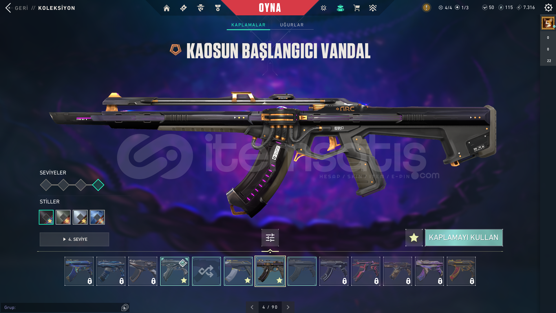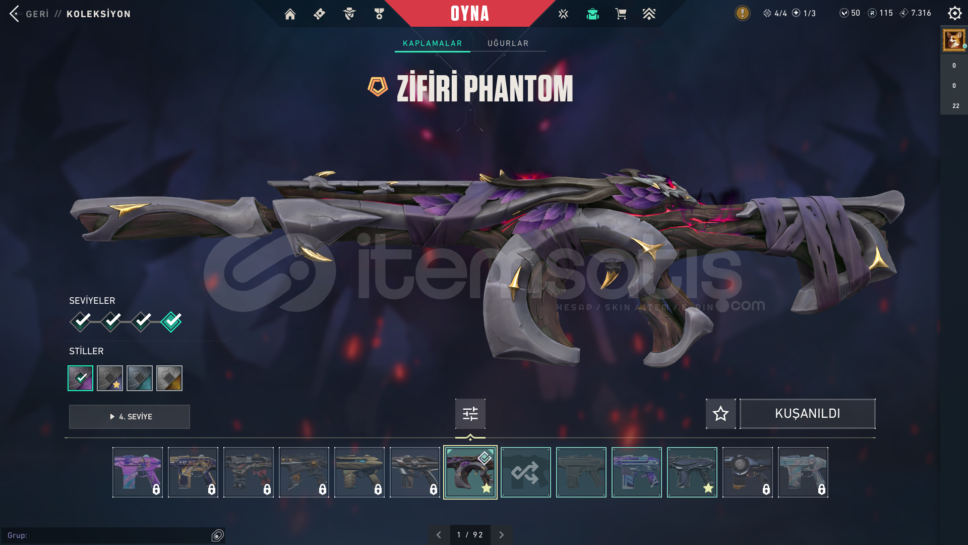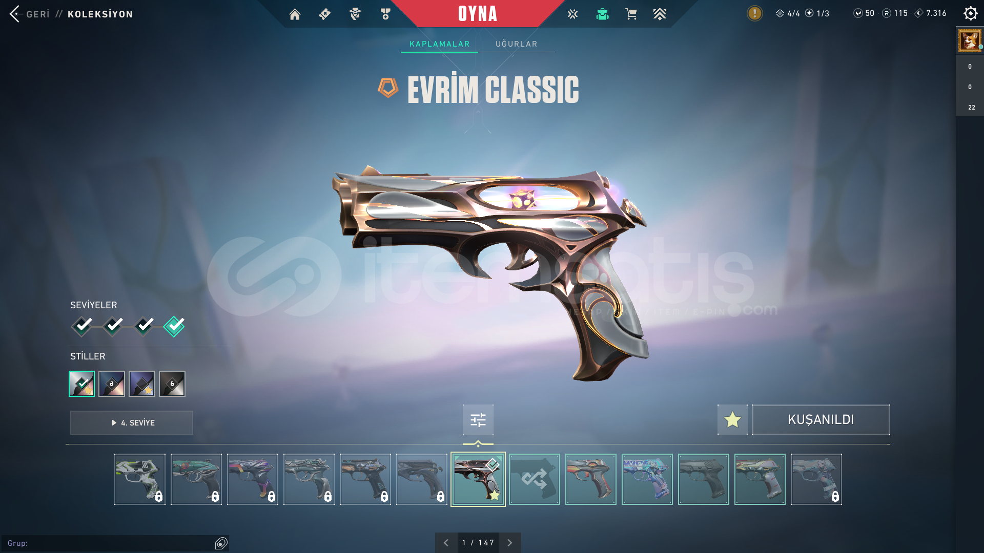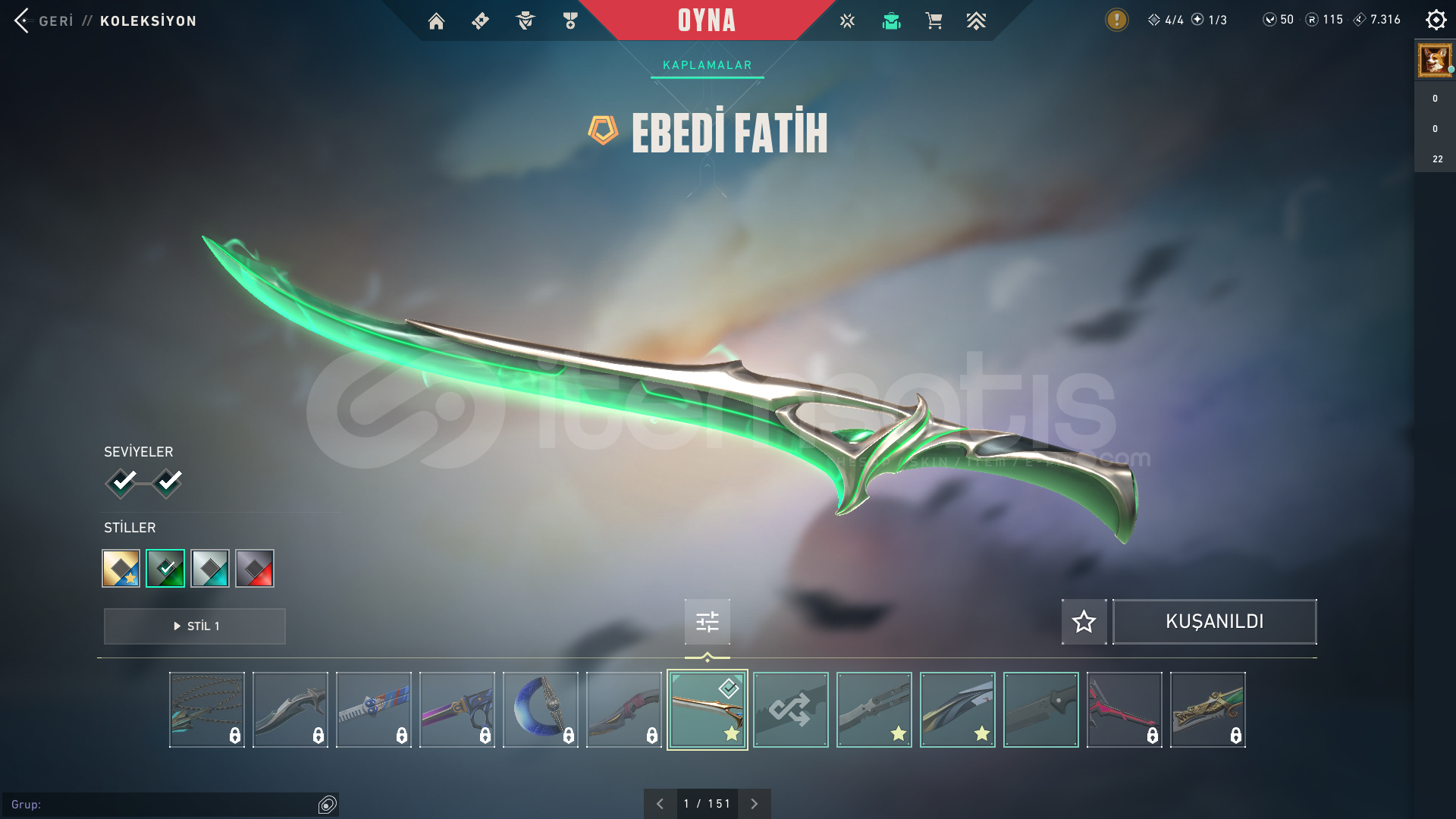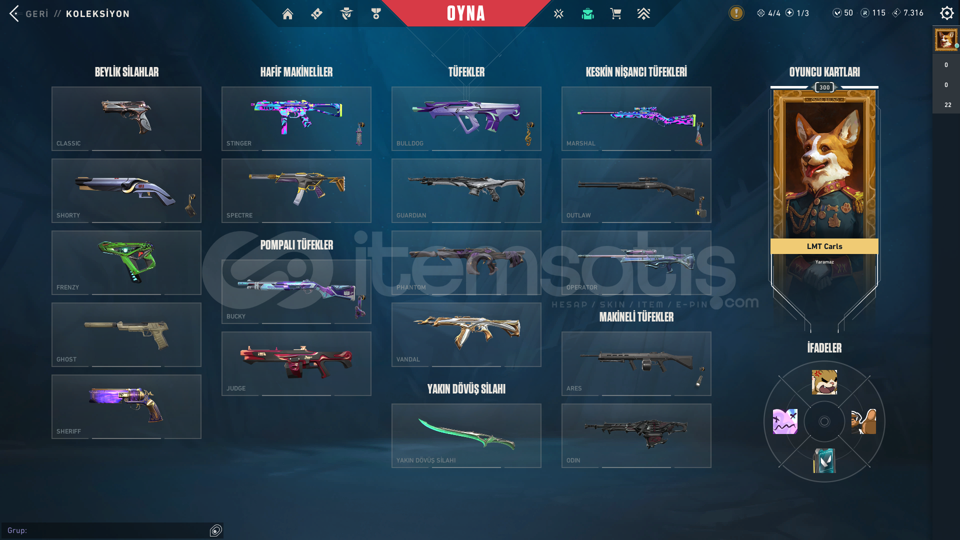 Classic-EvrimShorty-Battlepass+ GekkoFrenzy-İyonGhost-Özel HarekatSheriff-Seri Tetik Zamanın ÖtesiStinger-BattlepassSpectre-AsilBucky-BattlepassJudge-BattlepassBulldog-BattlepassGuardian-YağmacıPhantom-Zifiri+YağmacıVandal-Yitik+Kaos+AsilBıçak-Fatih 2.0+Karaborsa kelebek+BattlepassMarshal-BattlepassOperator-Cesur YürekOdin-Yağmacı