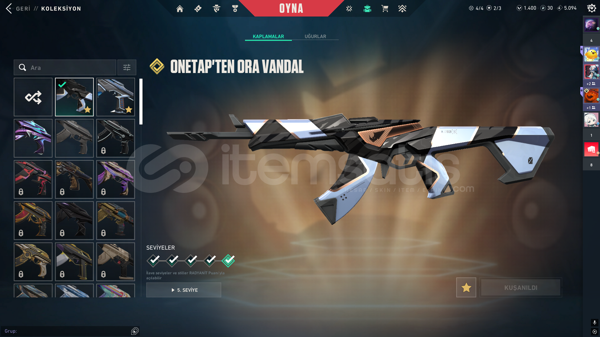 hesapta one tap ora vandalve kuronomi vandal mevcut battle pass açık 1400 vp var