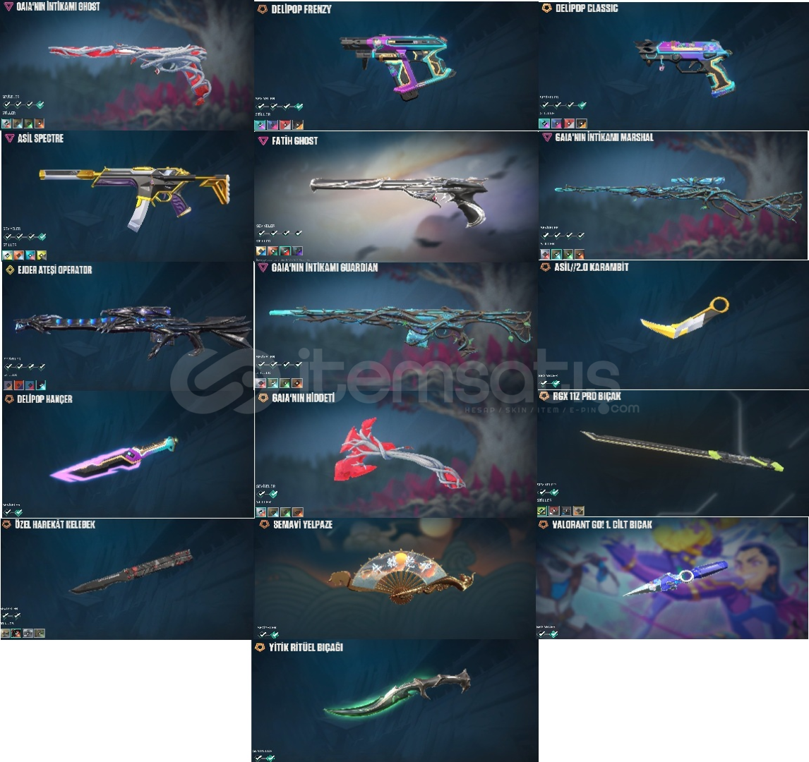 -Bıçaklar: VALORANT GO 1. CİLT JETT BIÇAĞI, ASİL KARAMBİT, RGX 11ZPRO KATANA, ÖZEL HAREKAT KELEBEK, DELİPOP HANÇER, YİTİK RİTÜEL BIÇAĞI, SEMAVİ YELPAZE, GAIANIN HİDDETİ BALTASI, GERİ KALAN 12 BIÇAK BATTLE PASS BIÇAKLARIDIR.