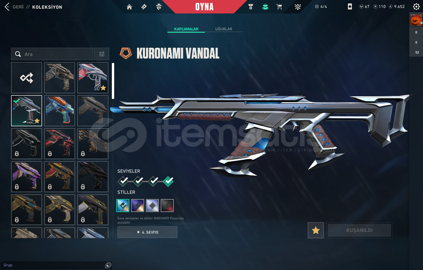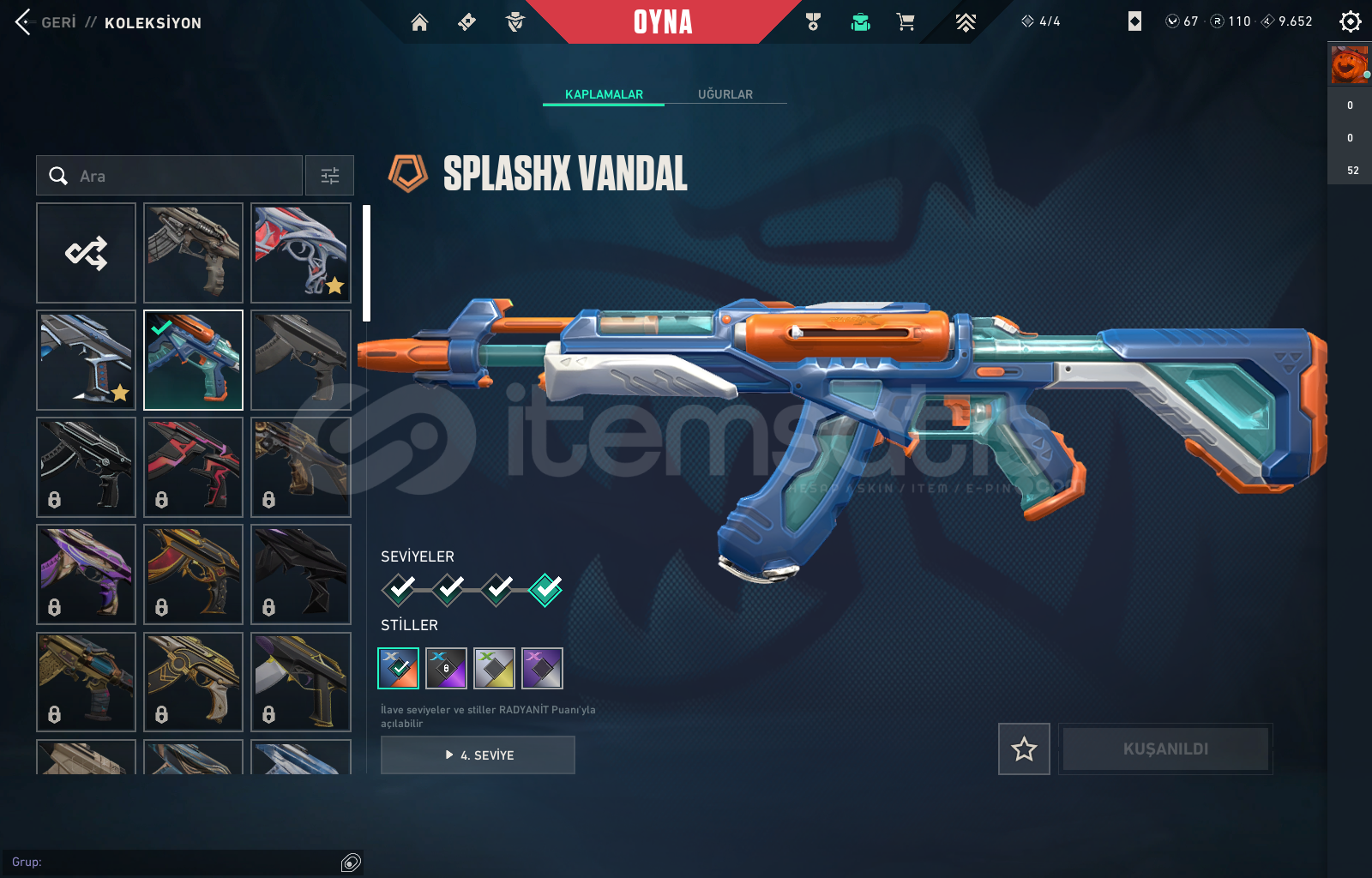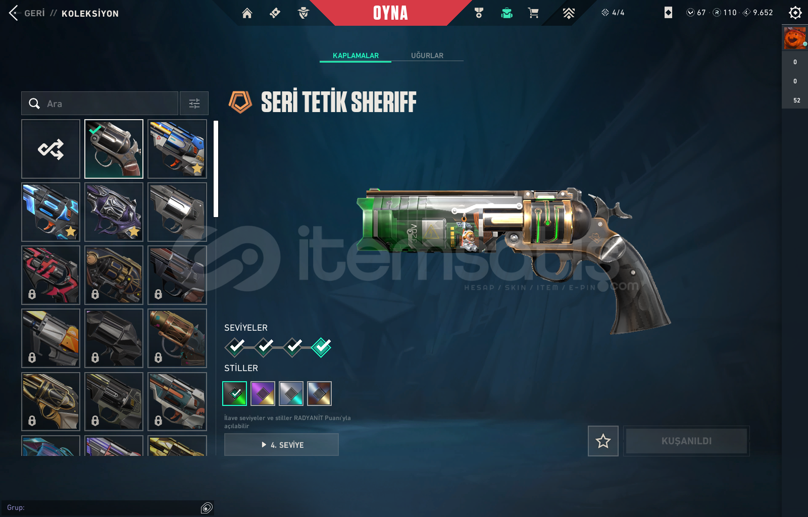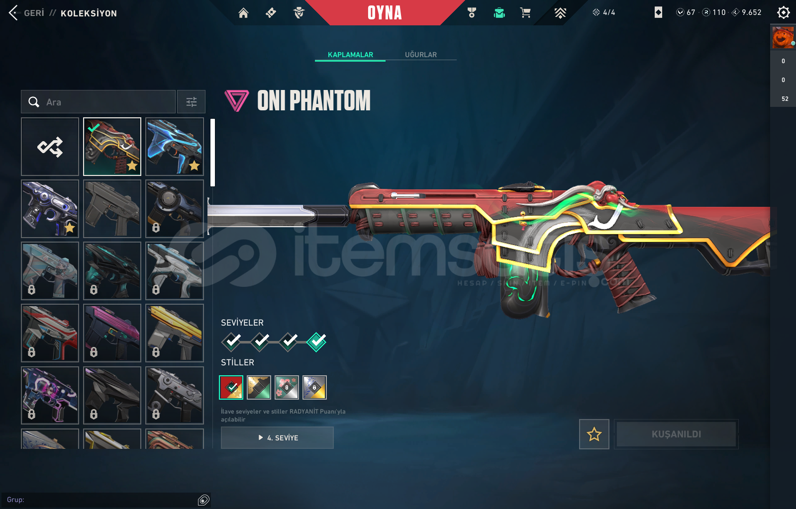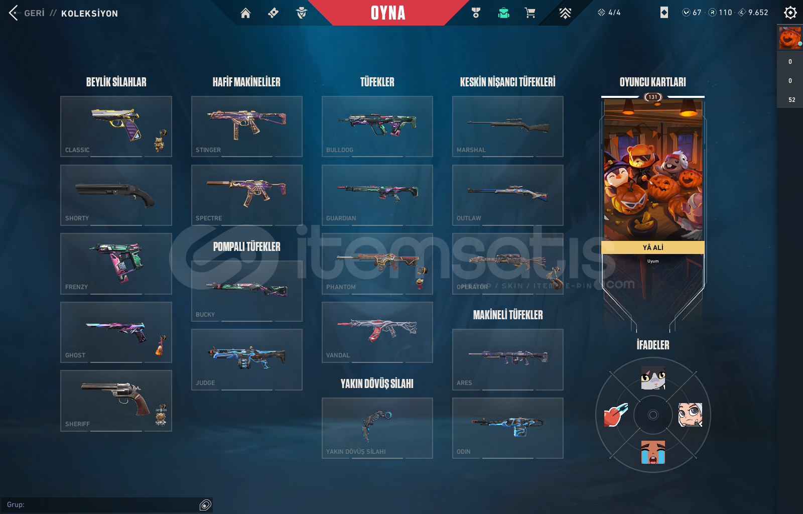 Vandallar : KURONAMİ - GAİA - SPLASHX + BATTLE PASSSHERİFFLER : SERİ TETİK - YAĞMACI + BATTLE PASSPHANTOMLAR : ONİ + BATTLE PASSOPERATÖR : EJDER + BATTLEPASSCLASSİC : ASİL + BATLLE PASSBIÇAKLAR : ANOMALİ KELEBEK + RGX KARAMBİTHESAP İÇERİSİNDE 110 RADYANİT + 67 VP BULUNMAKTATÜM AJANLAR AÇIKDİĞER YAZILMAMIŞ OLAN SKİNLERDE MARSHALL SHORTY DIŞINDA BATTLEPASS SKİNLER...