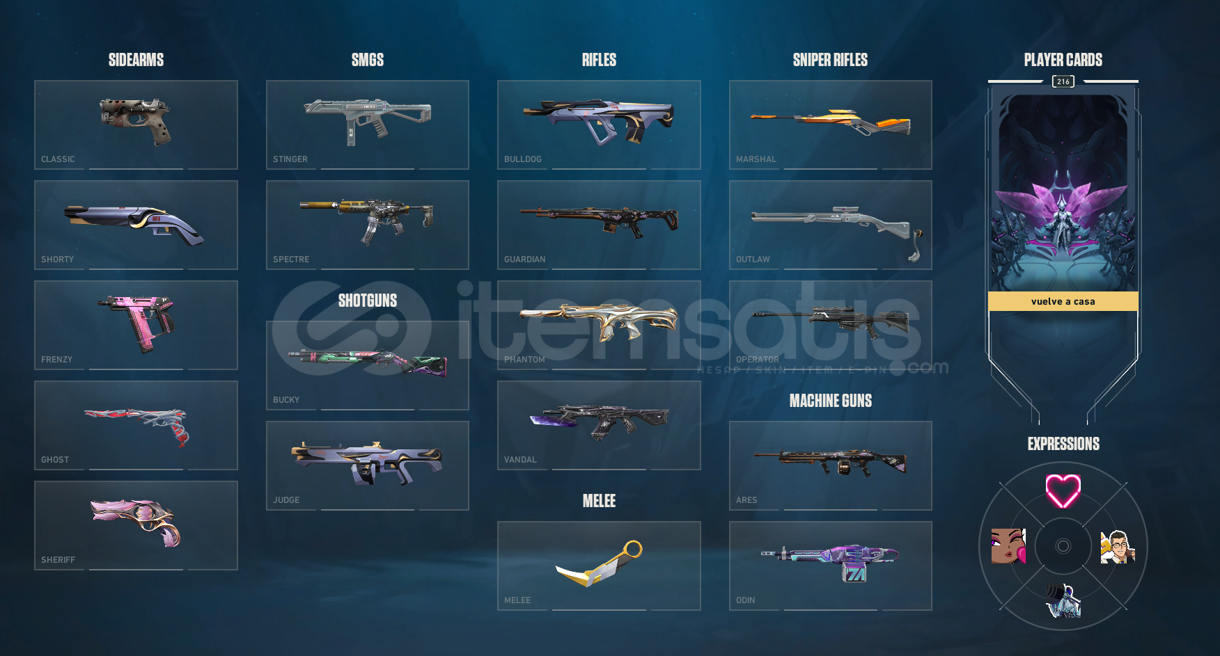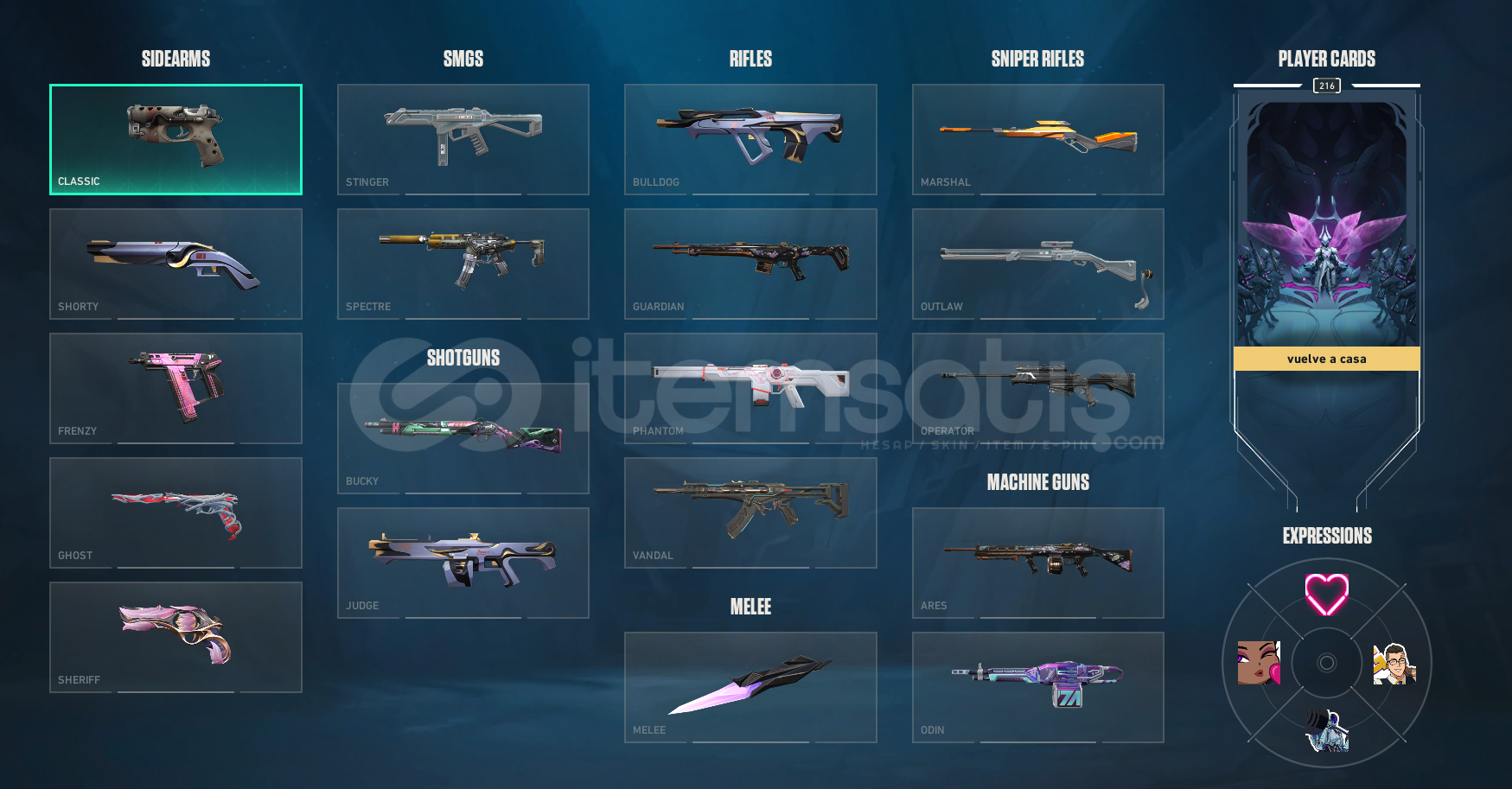 Classic : 4 adet skin (BP)Shorty : 2 adet skin (BP) Frenzy : 2 adet skin (BP)Ghost : 4 adet skin / GAİA GHOST / (3 skin BP)Sheriff : 12 adet skin / SIR ÇİÇEĞİ / (11 adet BP)Vandal : 5 adet skin / AEMONDIR / YAĞMACI / SOĞUK ÇELİK / (2 adet BP)Phantom : 6 adet skin / YİTİK / SPECTRUM / (4 adet skin BP)Operatör : 1 adet skin / YAĞMACI / Bıçaklar : 7 adet skin / ANOMALİ KELEBEK / ASİL KARAMBİT / (4...
