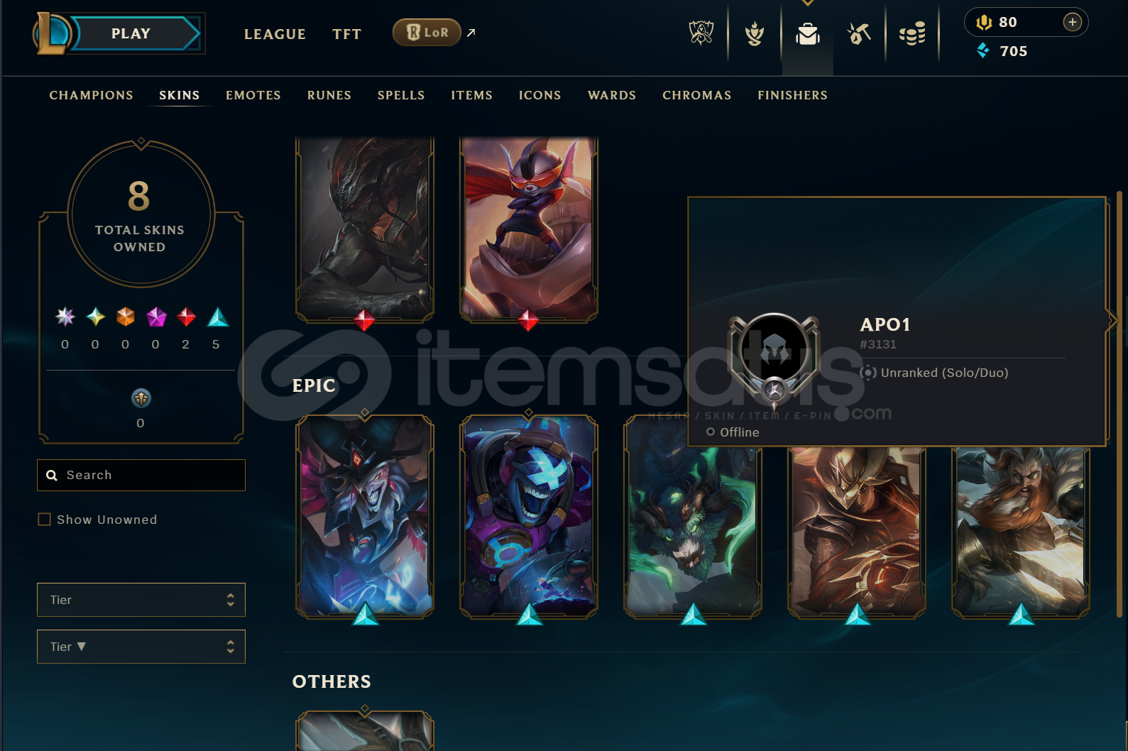 lol için (gecenin kılıcı yasuo ve süper galaxi rumble 1820 rp) +5 tane destansı olmak üzere 8 tane skin vardır