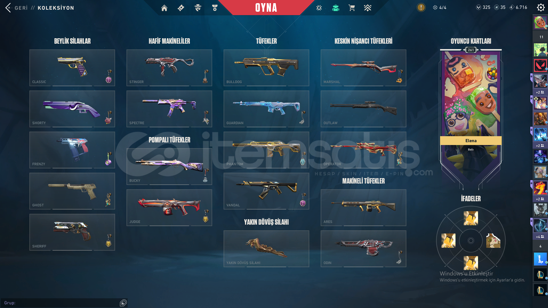 Her silahta skin bulunuyor.VP'Lİ SKİNLERCLASSİC:ASİL CLASSİCGHOST:ÖZEL HAREKAT GHOSTSHERİFF:PROTOKOL,YAĞMACI,KAOS SHERİFFPHANTOM:RGX PHANTOMVANDAL:SPLASHX,EJDER,KÖKEN,CHAMPİONS 2023,2025 VANDALOPERATÖR:EJDERİN BUYRUĞU OPERATÖRBIÇAK:SEMAVİ YELPAZE,RGX KELEBEK