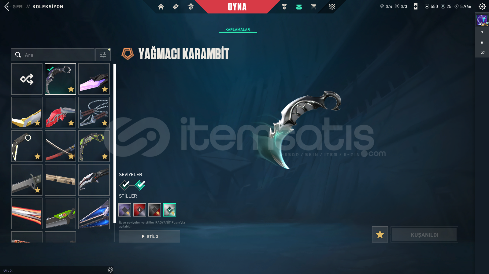 BIÇAK : Yağmacı Karambit - Anomali Kelebek - Asil 2.0 Karambit - Gaia'nın Gazabı - Kuronami No Yaıba - Minima Karambit - Onimaru Kunitsuna - RGX 11Z Pro Karambit - Xenohunter Bıçak (6 Battlepass)