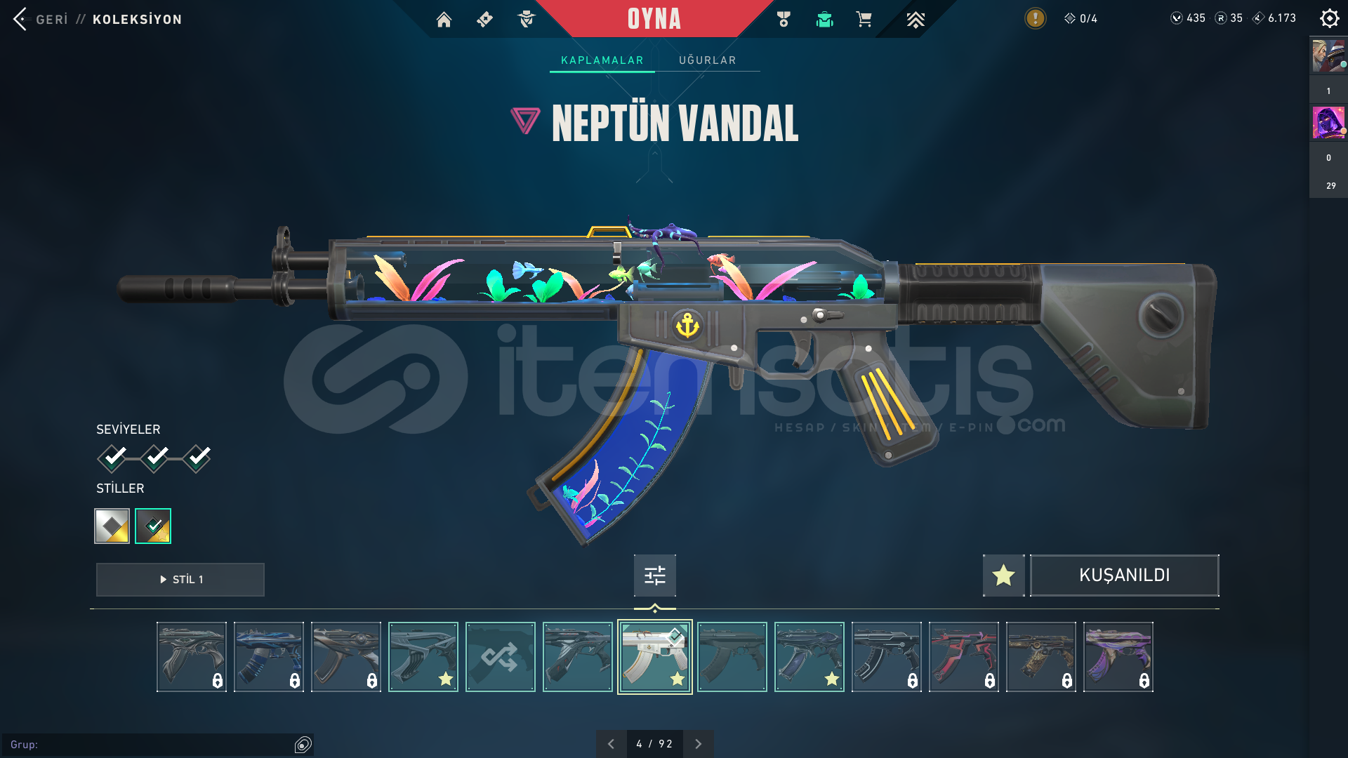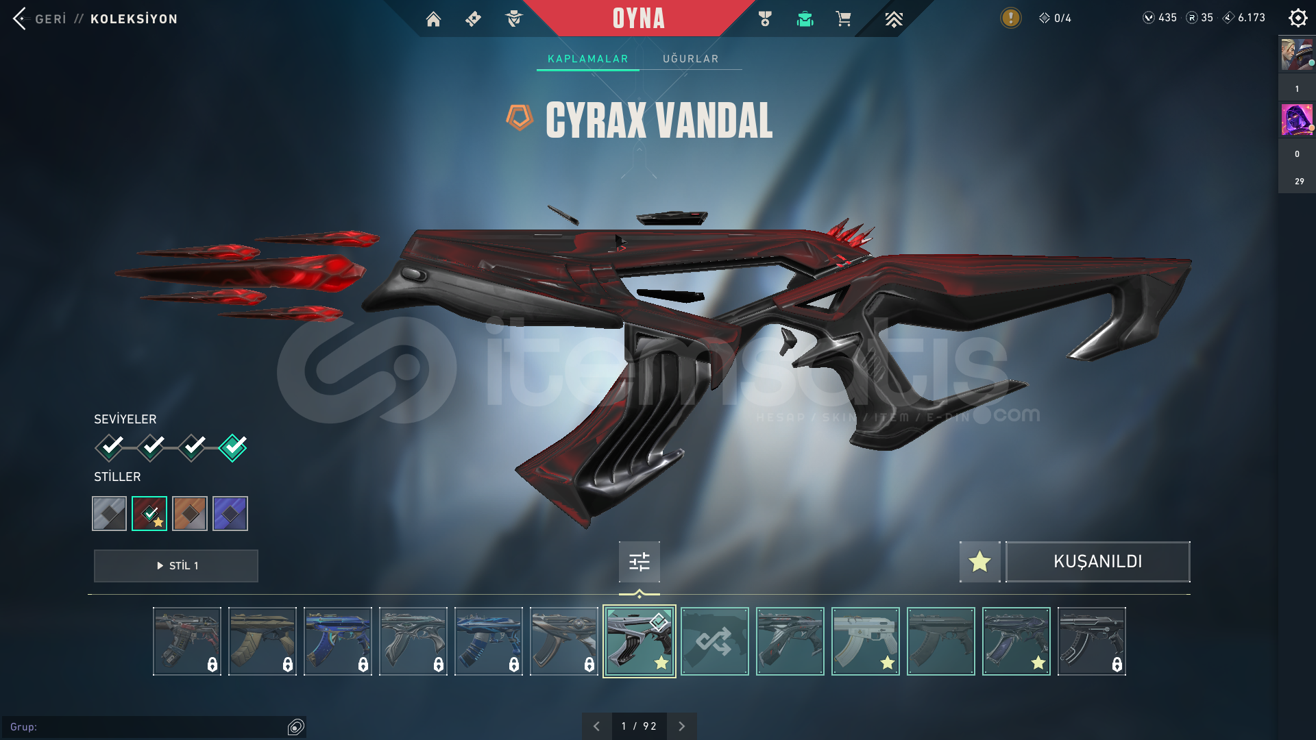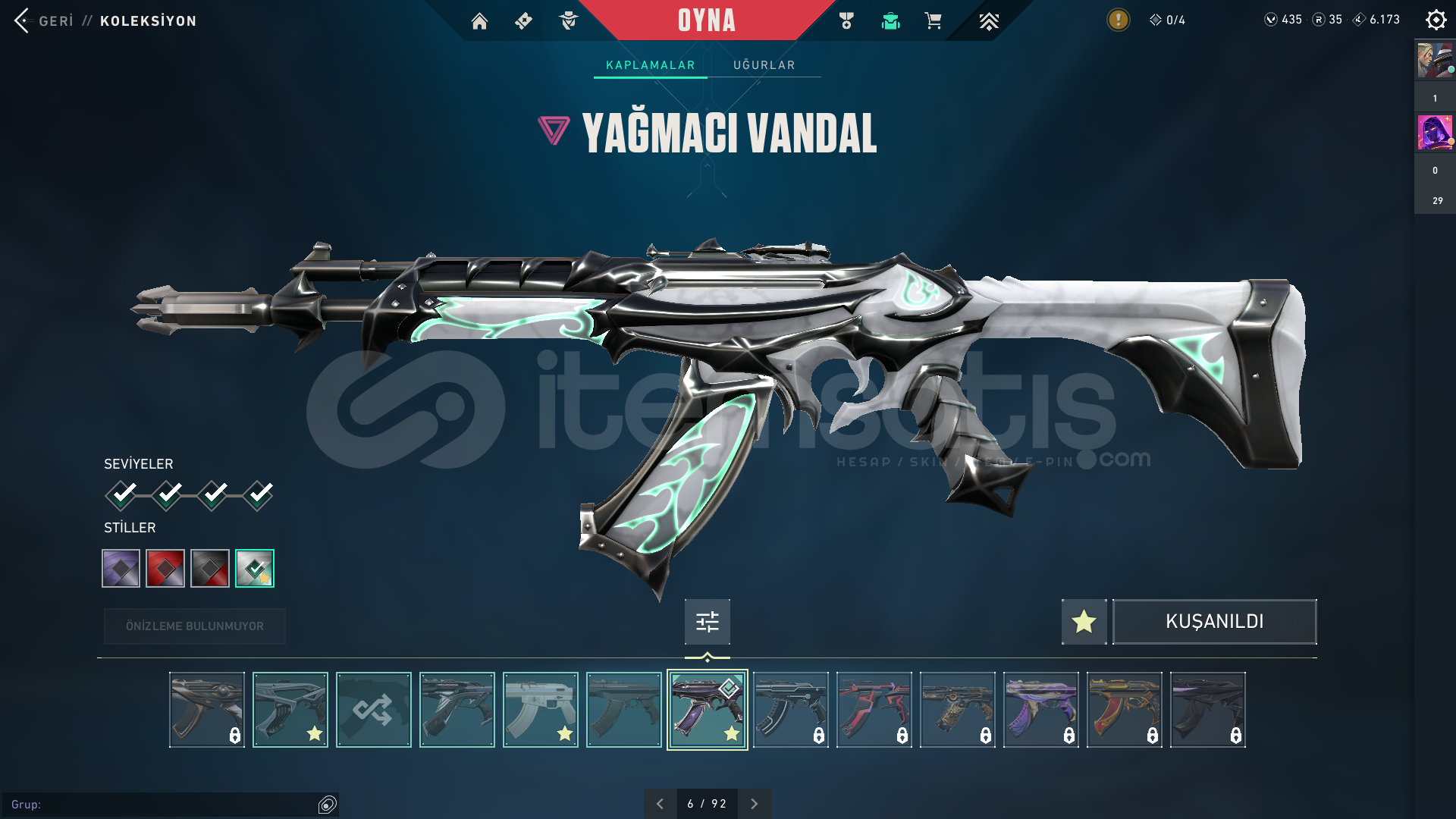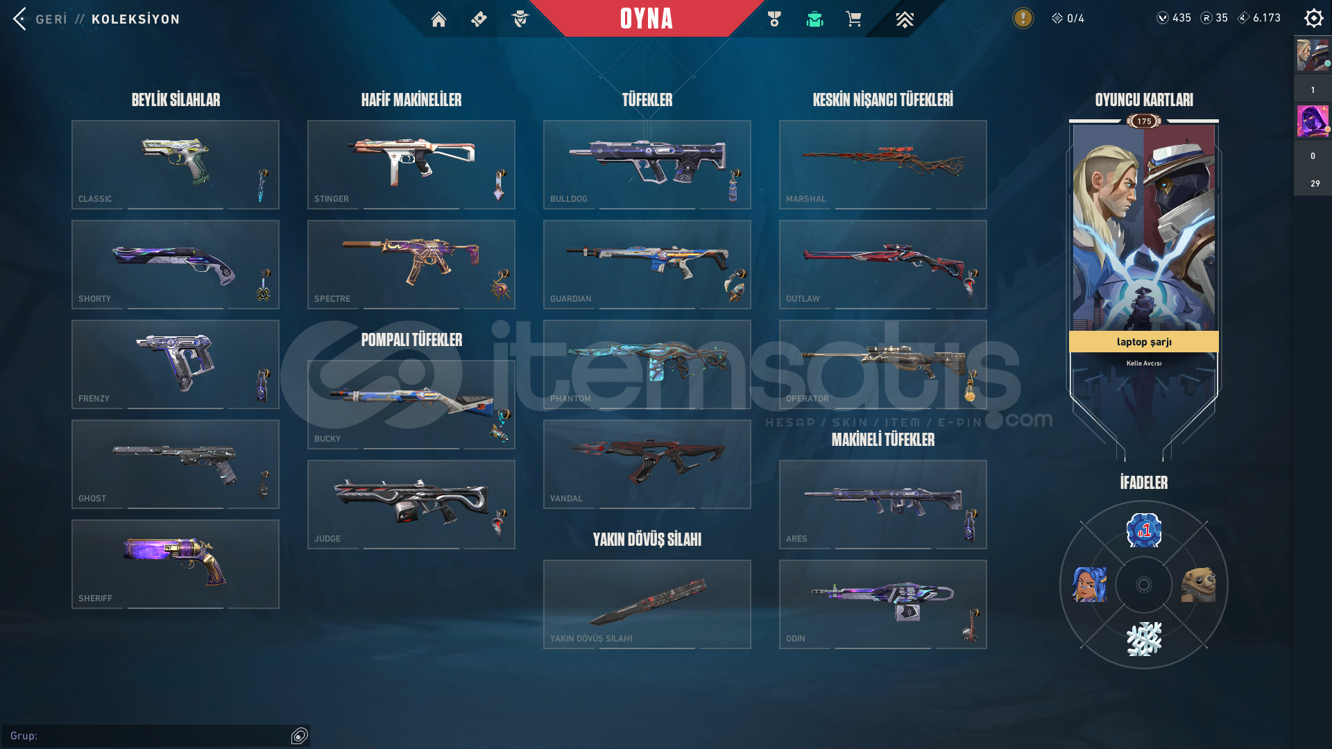 İÇERİKLER:VANDAL : YAĞMACI, CYRAX, NEPTÜNSHERİFF : SERİ TETİKPHANTOM: GAİA'NIN İNTİKAMI BIÇAK: ÖZEL HAREKAT KELEBEKMARSHALL: GAİA'NIN İNTİKAMIBU SKİNLER DIŞINDA HER SİLAHTA BATTLEPASS SKİNİDE BOLCA VARDIR.TÜM AJANLAR AÇIKTIR : OMEN VE DEADLOCK TEÇHİZATI FULLENMİŞTİR.EKSTRADAN 435 VP VARDIR HESAPTA.TELEFON ONAYLANMAMIŞTIR İLK SİZ ONAYLA...