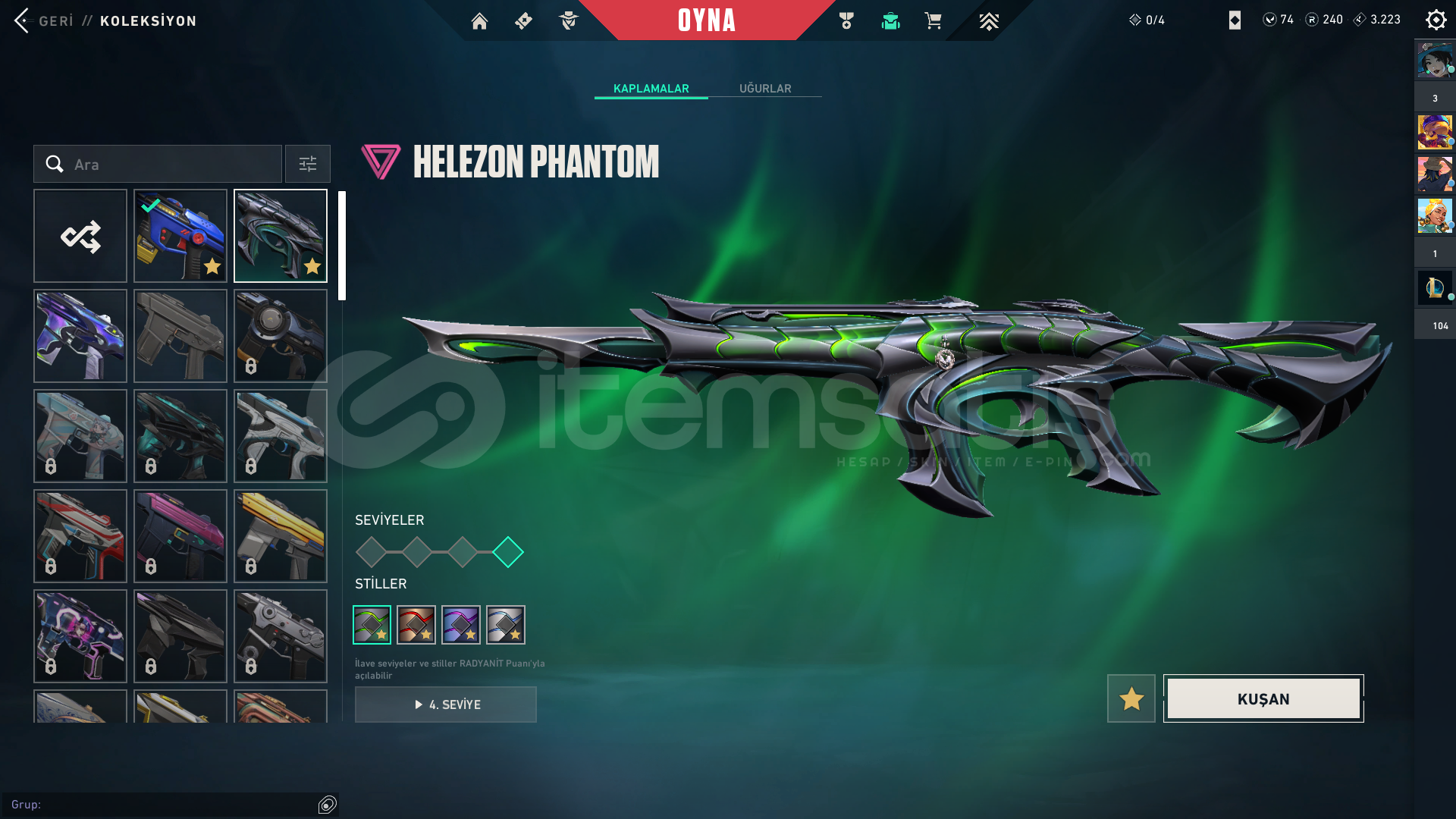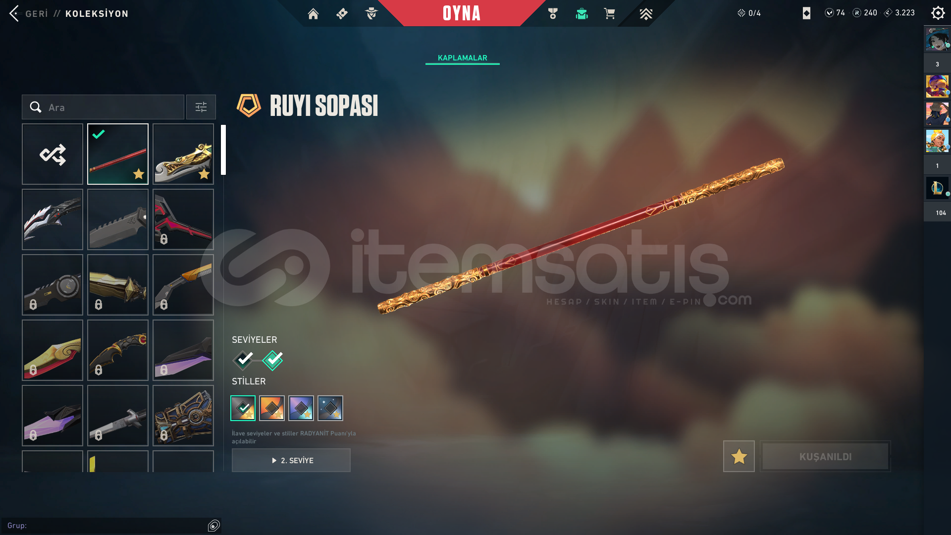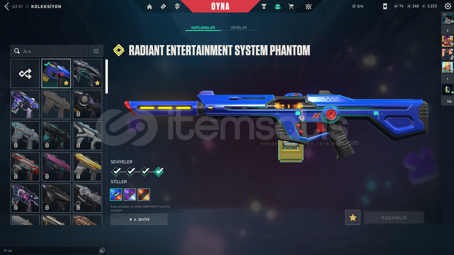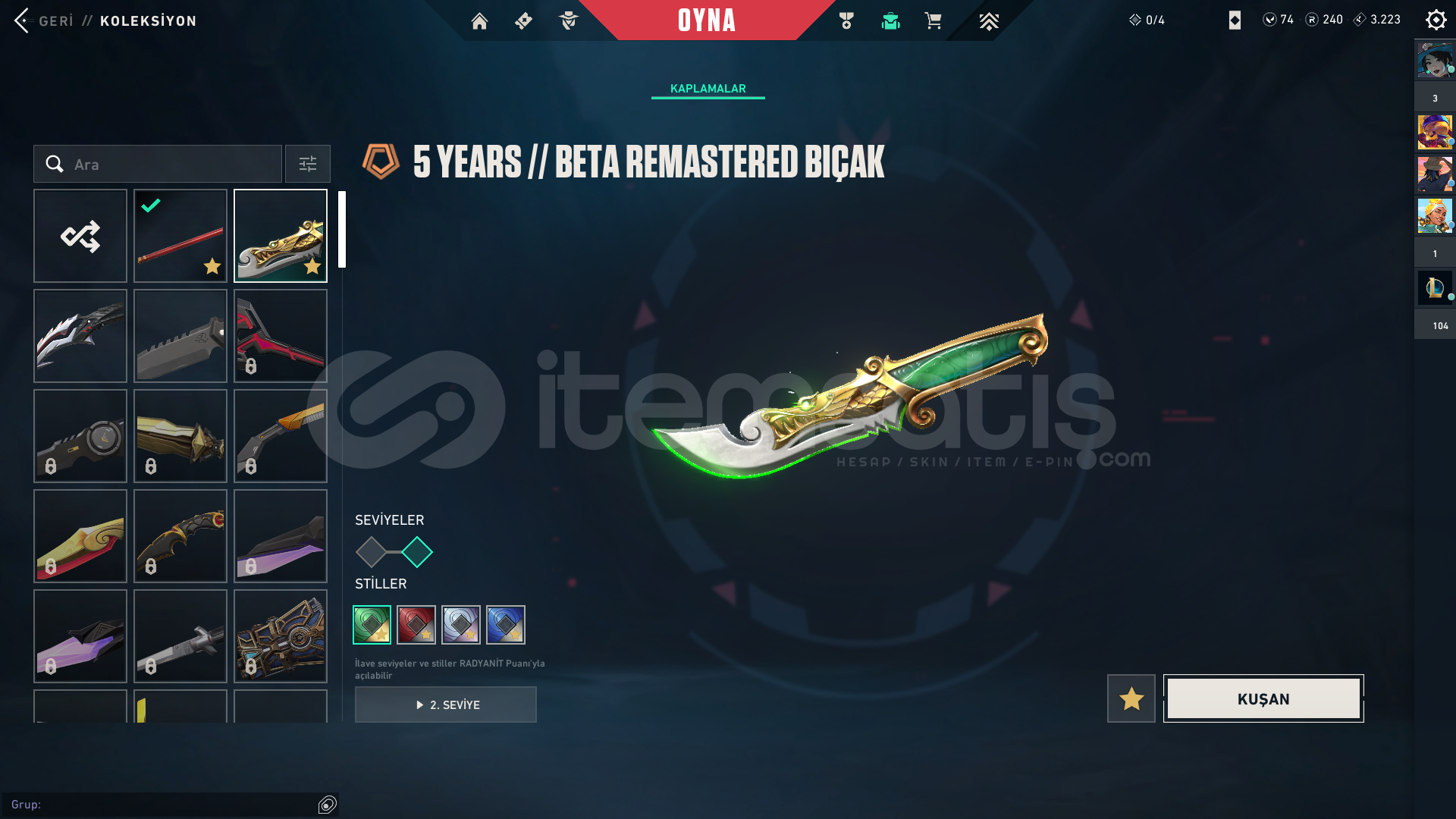Ürün Hakkında Bilgi;İLANI SATIN ALDIĞINIZDA 7/24 OTOMATİK OLARAK TESLİM EDİLİR.RANK - PLATİNUM 1HESAP SEVİYESİ - 218SKİN SAYISI - 28VP SAYISI - 74HESAPTAKİ ÜCRETLİ SKİNLER;Radiant Entertainment System Phantom5 Years // Beta Remastered KnifeChronoVoid VandalByteshift KnifeRuyi StaffDoombringer SheriffForsaken VandalHelix PhantomGravitational Uranium Neuroblaster Operator