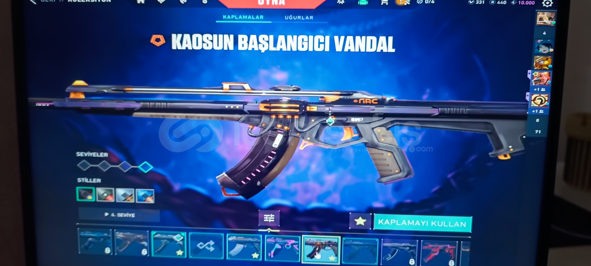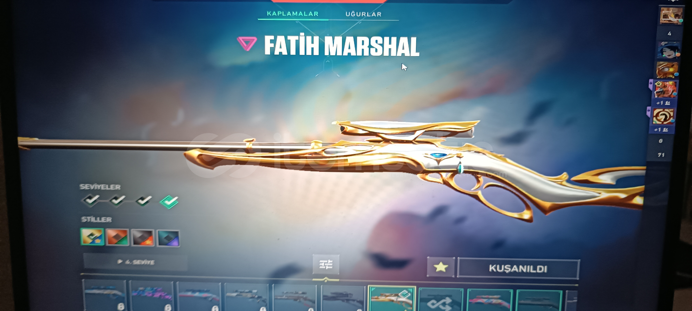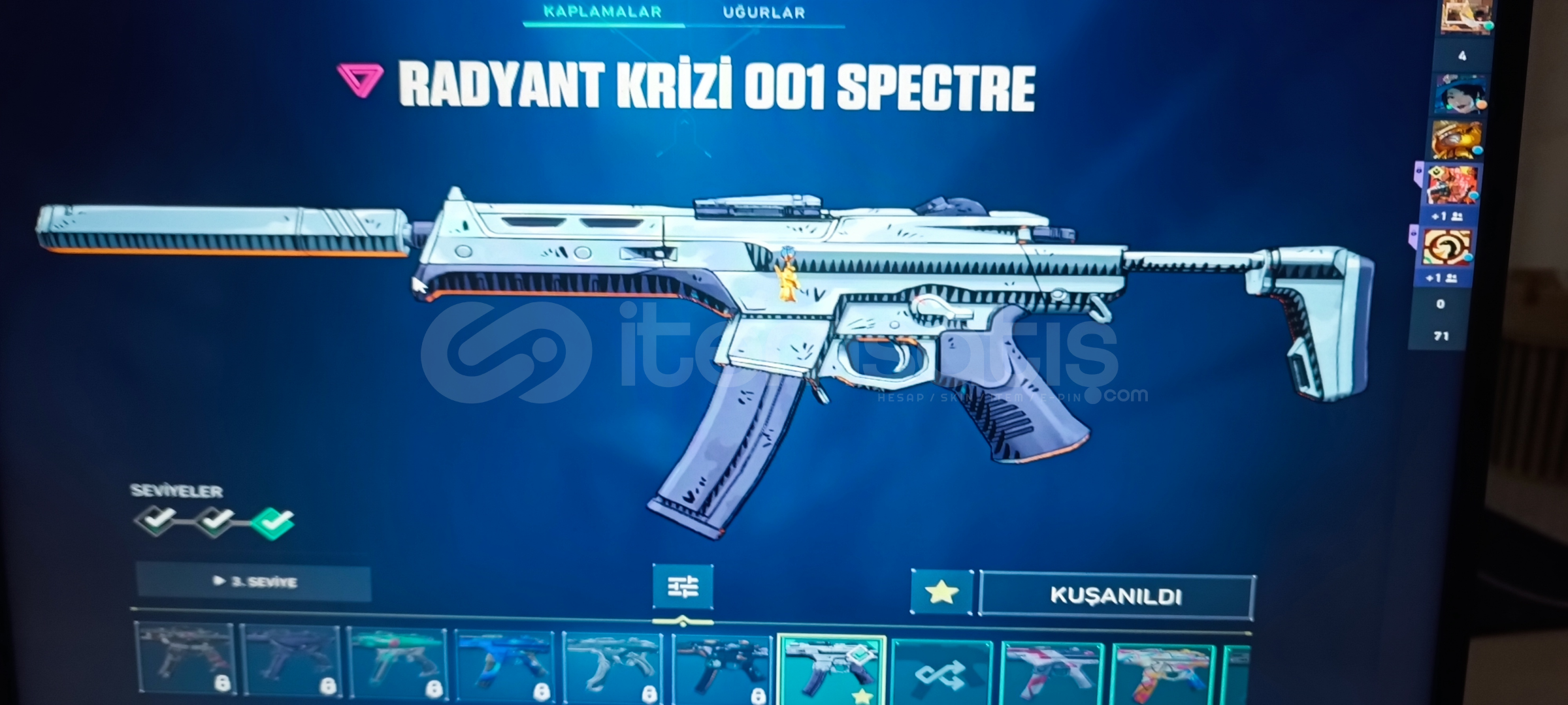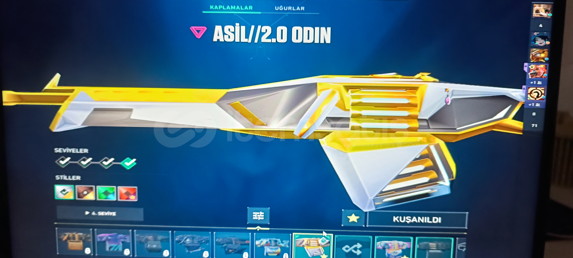 Vandal: Kaos ' Asil ' Işık muhafızı Phantom: Asil Spectre: Radyant kriziGuardıan: Gaia Marshal:FatihOperatör: Shirpunk Odin: Asil Bıçak: Uzaylı avcısı Ghost: Fatih Sherif: Yağmacı ' Ejderin buyruğu 384 Level olup Cadılar Bayramı sticker vs alınmıştır 5 Kez Battle pass alınmış Eski yucelik hesap uğurluk vs mevcuttur