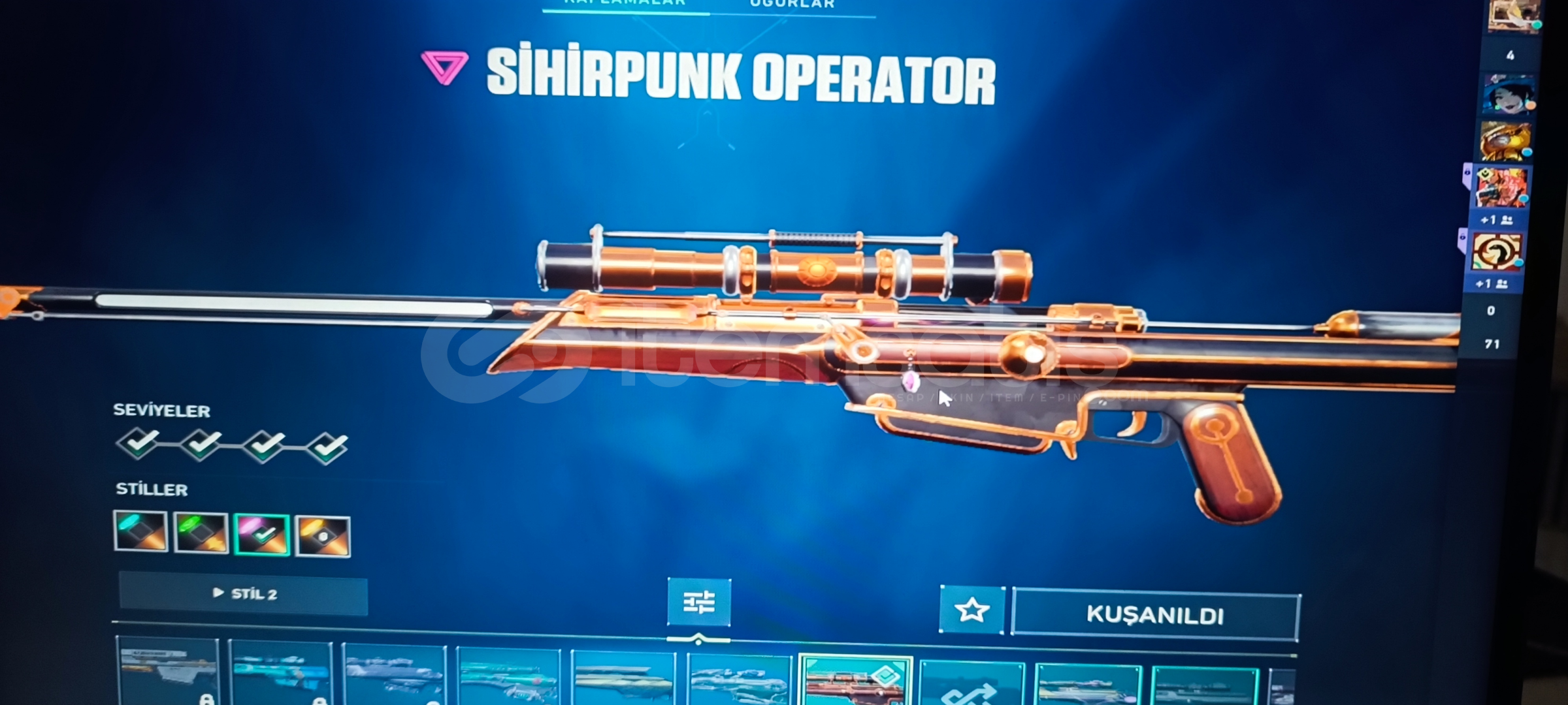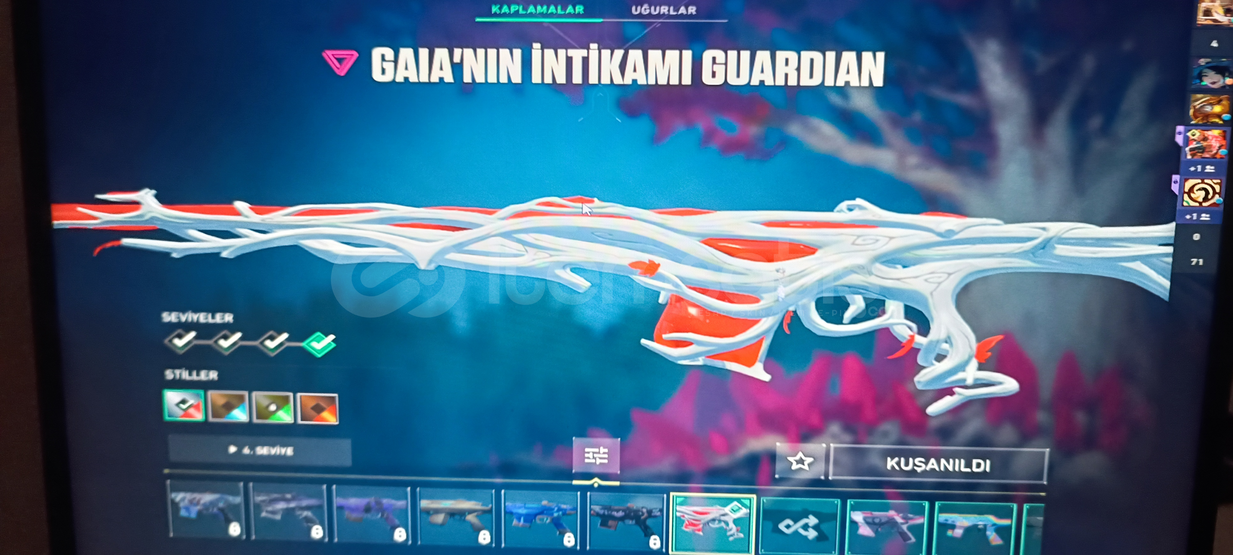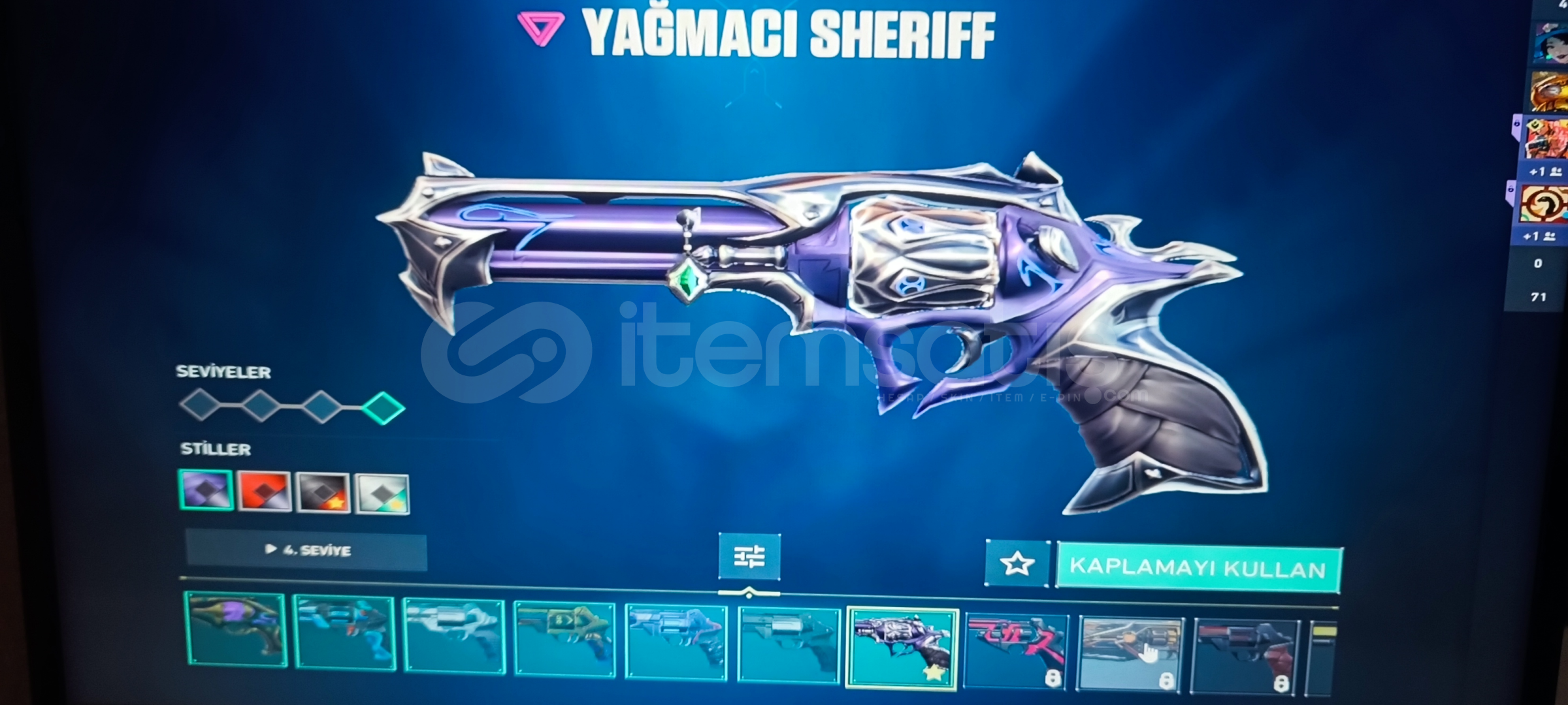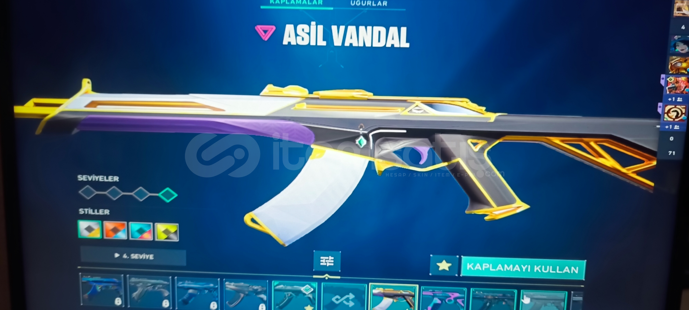 Vandal: Kaos ' Asil ' Işık muhafızı Phantom: Asil Spectre: Radyant kriziGuardıan: Gaia Marshal:FatihOperatör: Shirpunk Odin: Asil Bıçak: Uzaylı avcısı Ghost: Fatih Sherif: Yağmacı ' Ejderin buyruğu 384 Level olup Cadılar Bayramı sticker vs alınmıştır 5 Kez Battle pass alınmış Eski yucelik hesap uğurluk vs mevcuttur