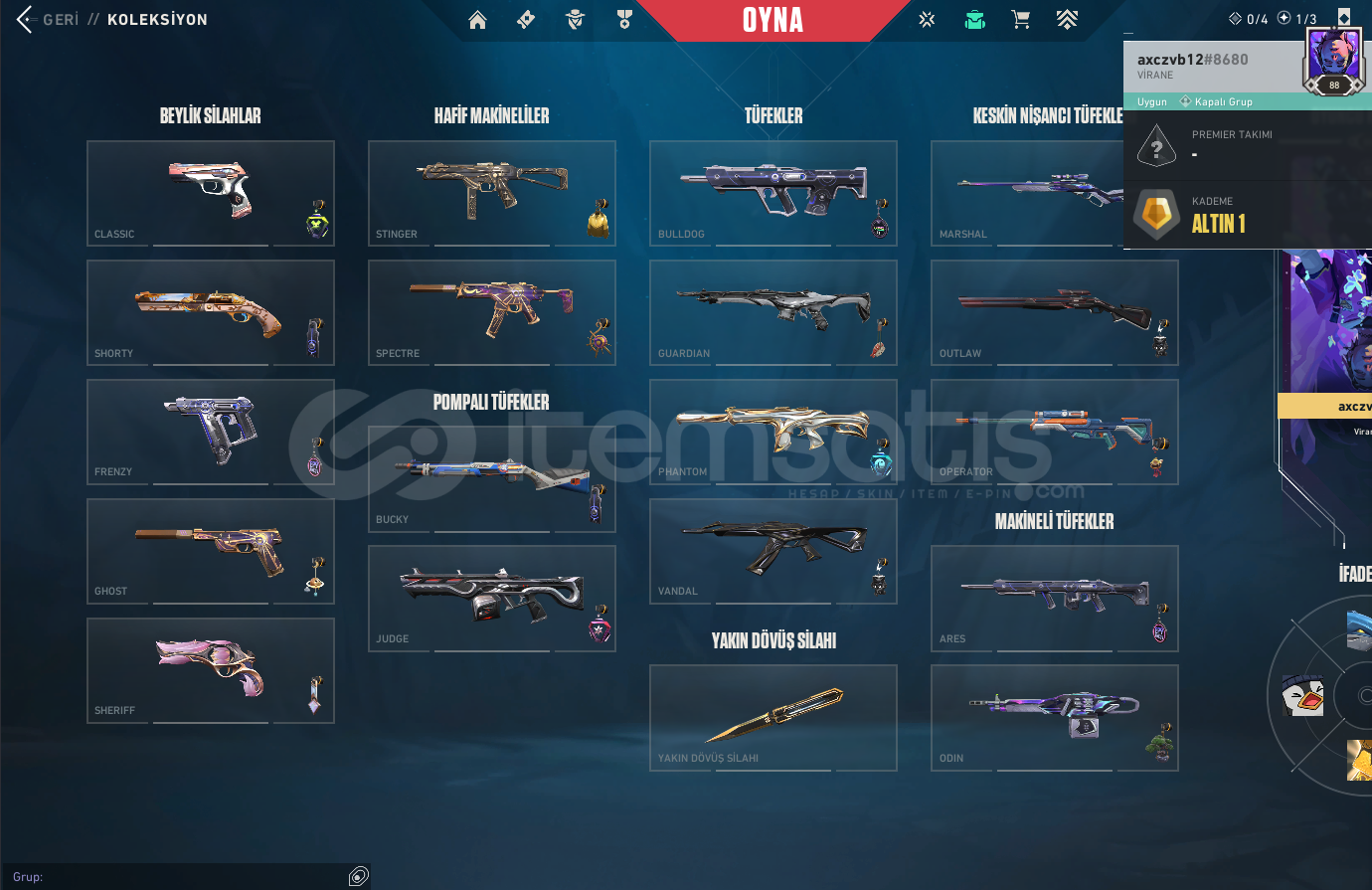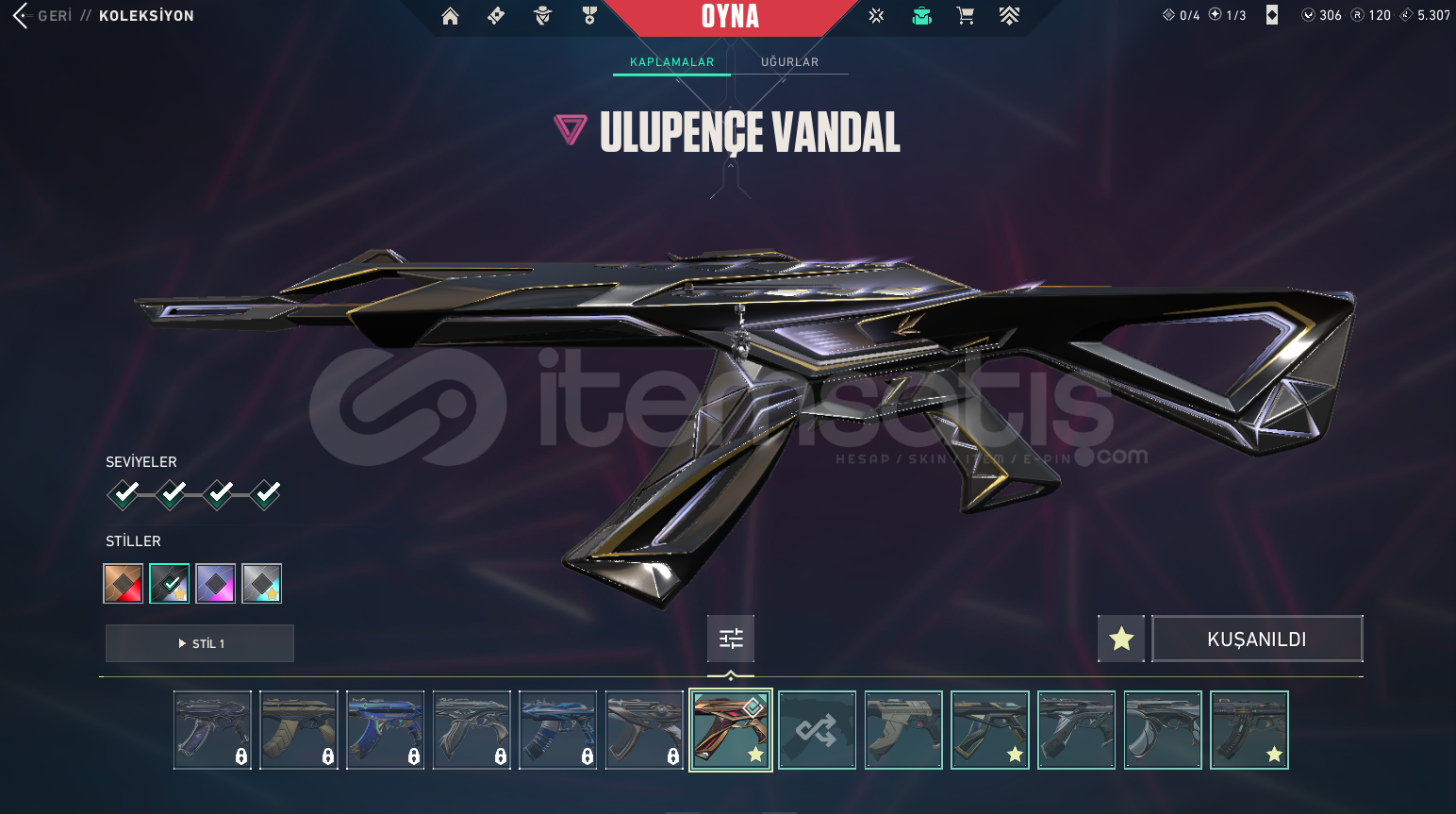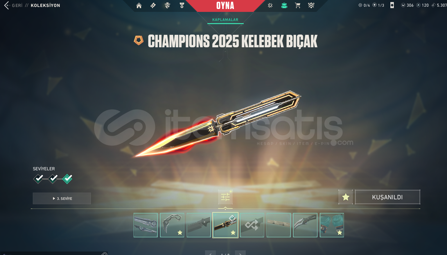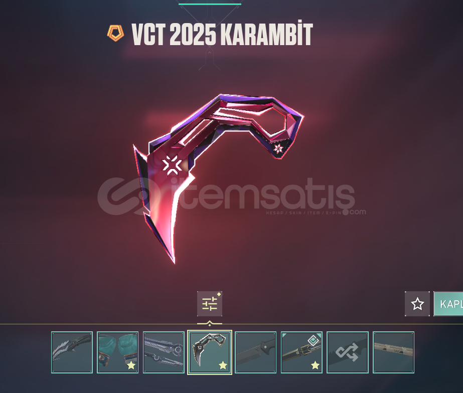 • Champions 2025 Seti + SplashX Seti + Kaos Vandal + Evrim Vandal + Ulupençe Vandal + Fatih Phantom + Yağmacı Guardian + Şimşek Outlow + Sırçiçeği Sheriff + VCT 2025 Karambit + Ecelin Isırığı Bıçak ve sayamadığım skinlerle birlikte toplamda 52 skin