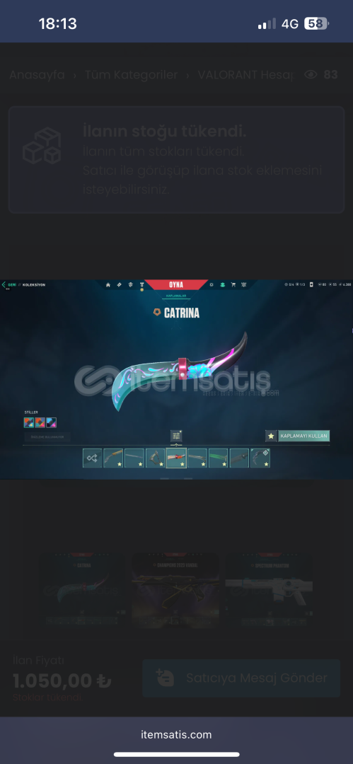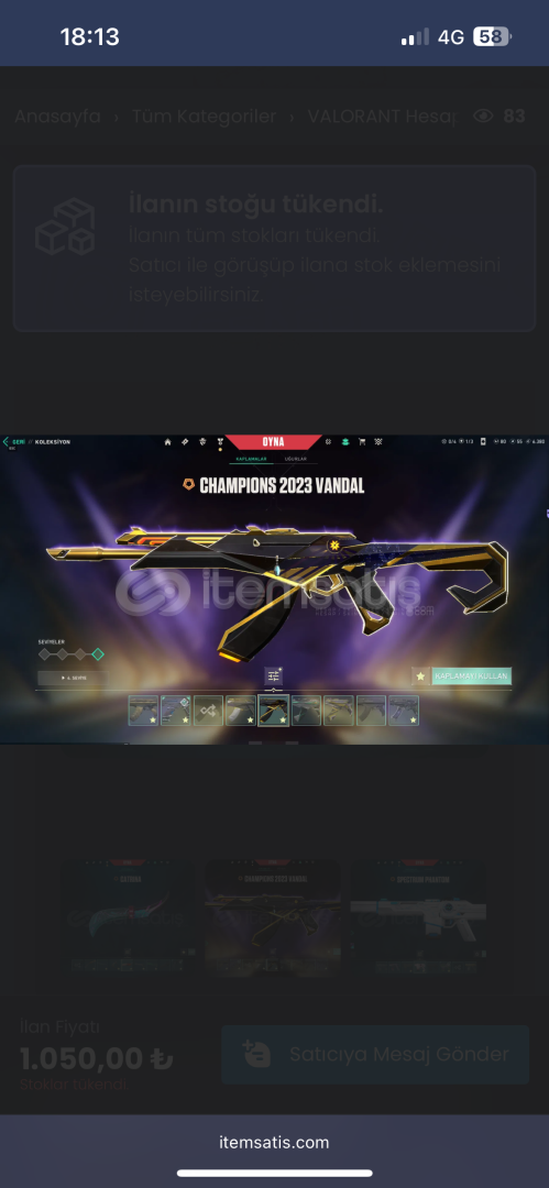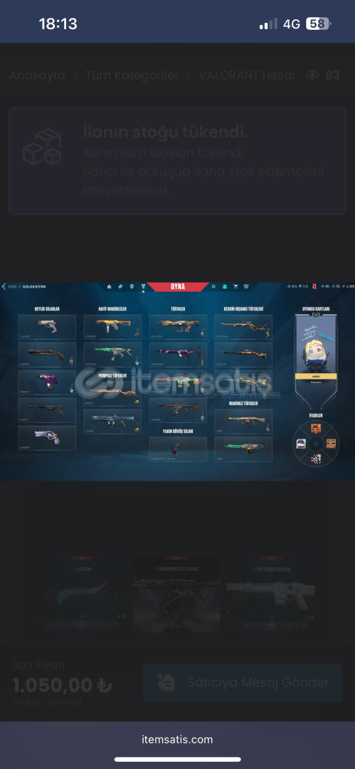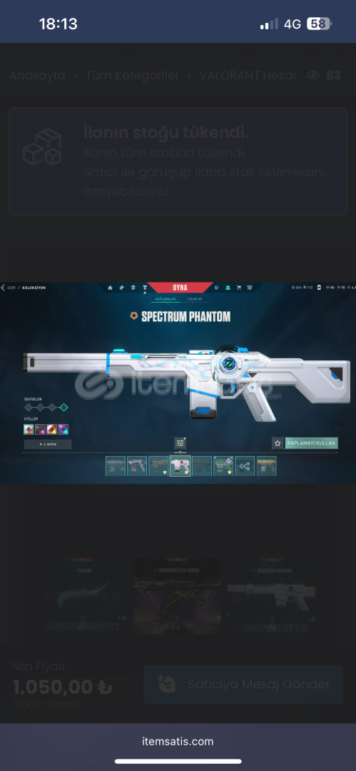RANK: Gold 1LEVEL: 236ENVANTER DEĞERİ: 32.600VPBlastX PhantomKuronami VandalChampions 2023 VandalMystbloom SheriffComet SwordReaver KarambitCatrinaGenesis ArcSpectrum PhantomComposite KnifeArtisan FoilEternal SovereignAraxys VandalAraxys SheriffReaver GhostRecon PhantomPrime VandalReaver VandalTOPLAM: 78 SKİN
