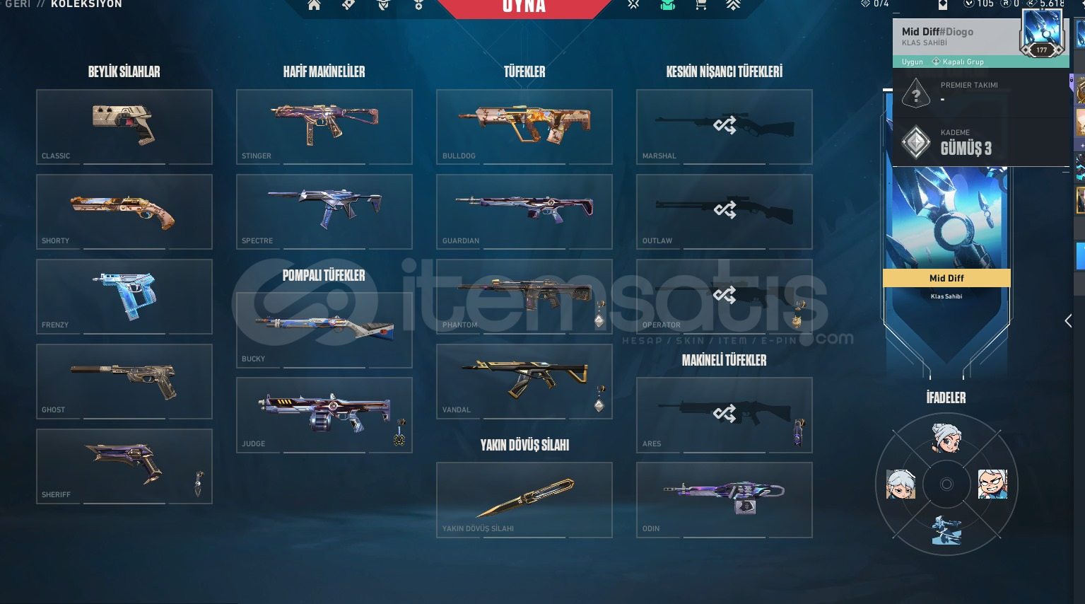 Hesap Hakkında Bilgi;Mail Teslim |Champions 2025 Kelebek+Champions 2025 Vandal +Ecelin Isırığı Set+ RGX 11z PRO Bıçak +RGX 11z PRO Karambit+Kuronami Vandal+Kuronami Sheriff +Neptün Phantom +Cyrax Vandal+Galaksi Muhafızı Phantom olmak üzere 78 skin mevcutturHesap Gümüş 3Hesap 177 LevelHesapta 0 Radiant Puanı VarHesap Envanter değeri +33k VPHesabı dilediğiniz gibi kullanabilirsinizS...