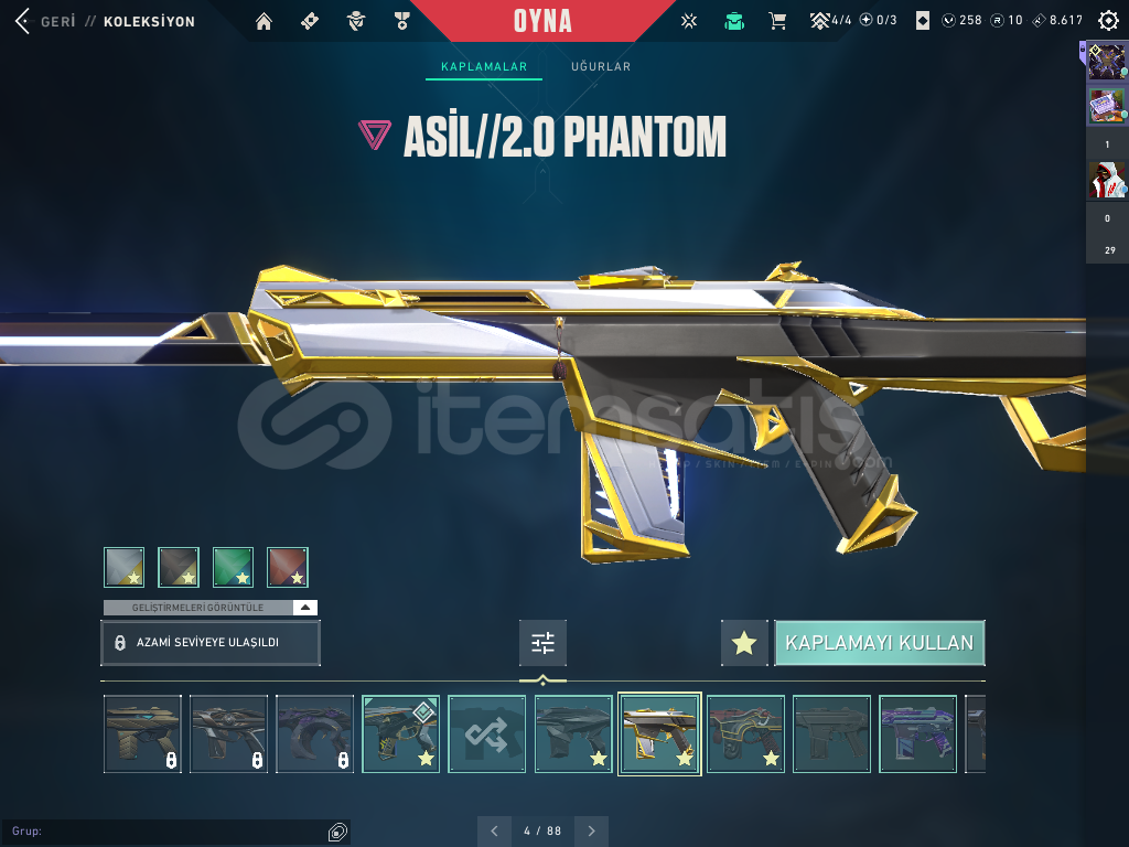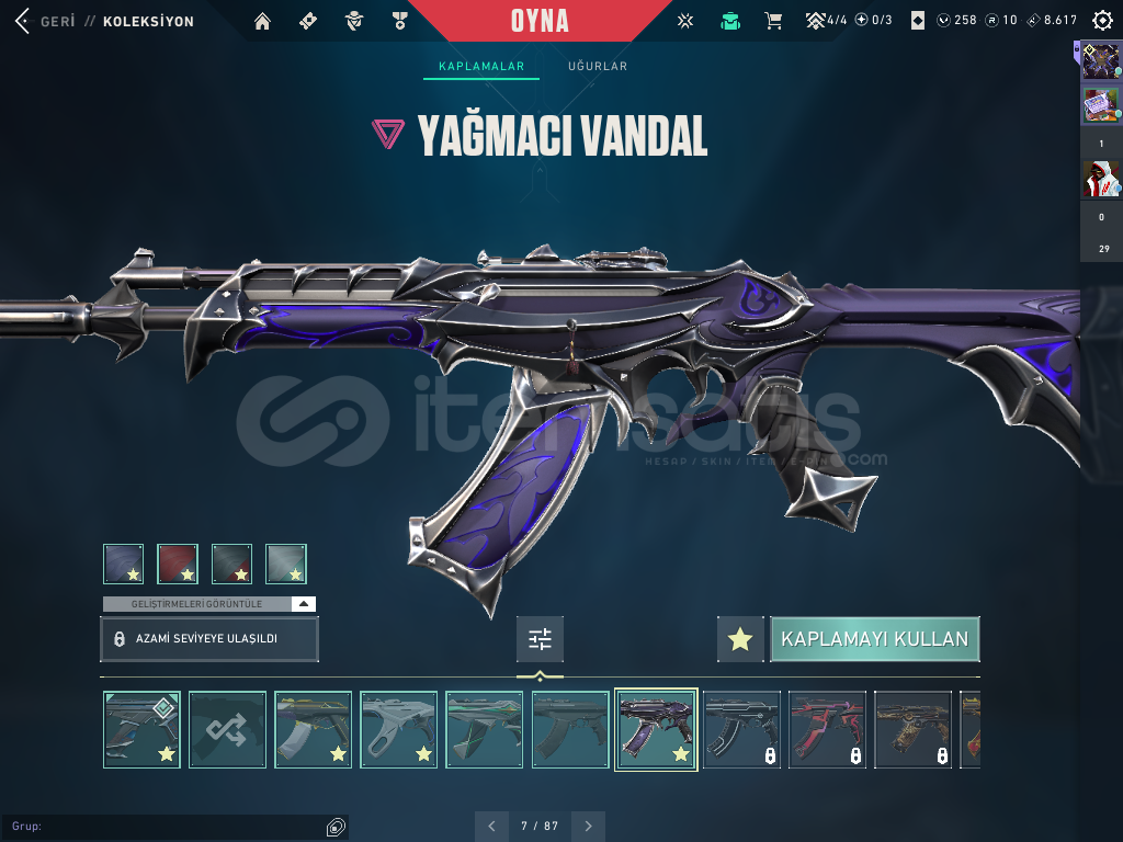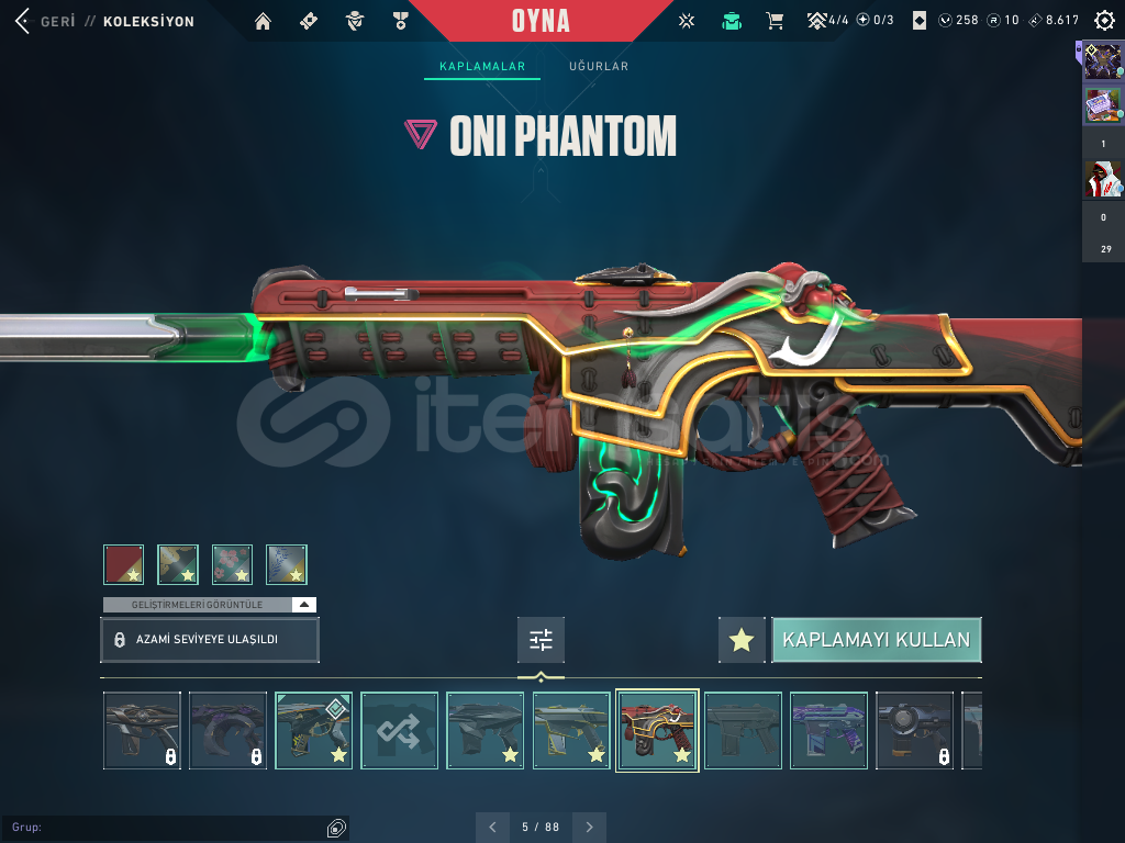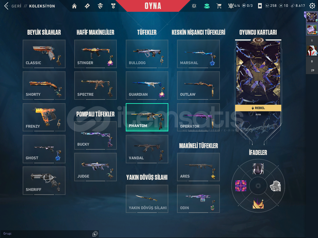 Hesabımı artık valorant oynamadığım için satıyorum. Herhangi bir banı yok, tr server sorunsuz bol skinli hesap. 2 kez battlepass alınmıştır, radyanit sorunu yoktur, skinler son animasyona ve renge kadar yükseltilmiştir.İçindeki skinler:Classic: AsilGhost: FatihSheriff: YağmacıSpectre: SihirpunkPhantom: Champions 2024 phantom, oni, asil, anomali.Vandal: Yağmacı, iyon, kuronami, asil.Operat...