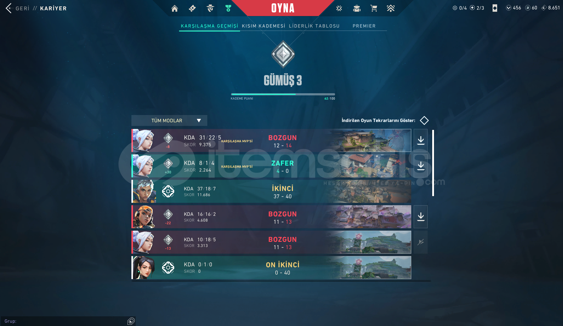 Valorant Hesap İçeriği;Exo Vandal , Gaja Vandal , Ejder Ateşi Vandal , Ejderin Buyruğu Vandal , Anomali Phantom , Zamanın Ötesi Şerif , Ejderin Buyruğu Operator , Fatih Guardian , KaraBorsa Kelebek Bıçak 450 Vp 60 Radyanit 651 Kingdoms Kredisi Açılmamış Sadece 3 Ajan Vardır , Gümüş 3 60 kpdir.Wildrift Hesap İçeriği;87 Leveldir Peak Rank Zümrüt 1 dir Şuanki Rank...