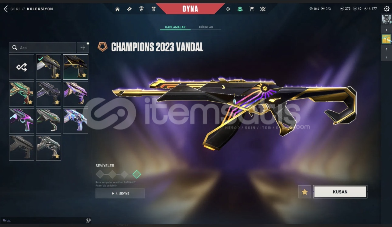 • VANDAL:Asil Vandal,Yağmacı Vandal,Champions2023 Vandal,Ejderin buyruğu Vandal,Yitik vandal,Kuyruk yıldızı Vandal,Popstar Vandal,Nitro Vandal