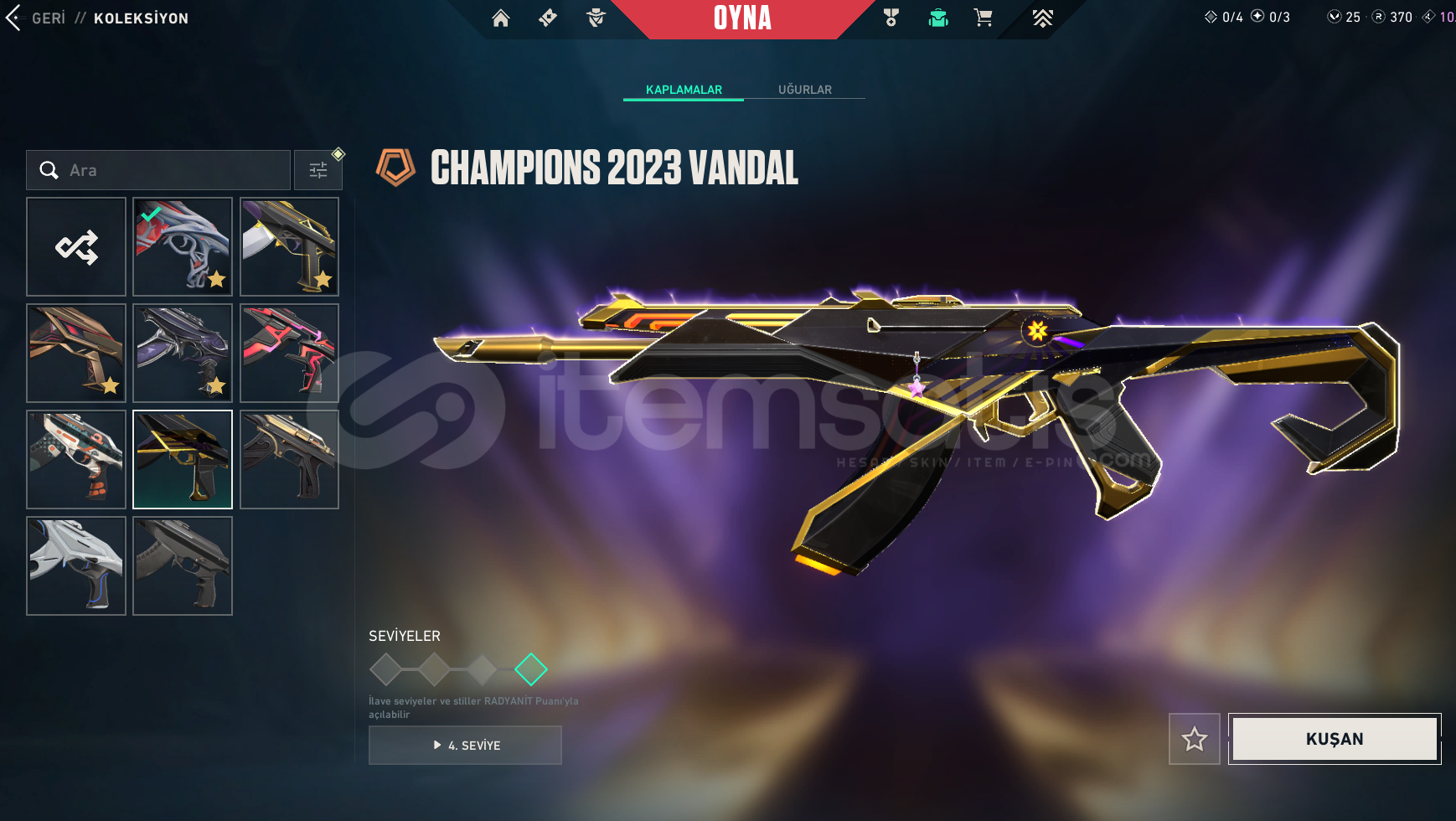 SUNUCU:TRRANK: UNRANKEDLEVEL: 226ENVANTER DEĞERİ: 41,500 VPNeo Frontier SheriffMystbloom SheriffRuination PhantomShellspire SwordChampions 2023 VandalGuardrail Hammer.SYS MeleeIon KarambitSpectrum ClassicBoundBlack.Market Butterfly KnifeSingularity SheriffReaver VandalPrime VandalPrime//2.0 PhantomXERØFANG VandalIon SpectreIon AresSovereign GhostOni PhantomIon FrenzyGaia's Vengeance VandalIon VandalGuardrail ShortyGuardrail Vandal.SYS StingerShellspire Phantom.SYS SheriffOverlay...