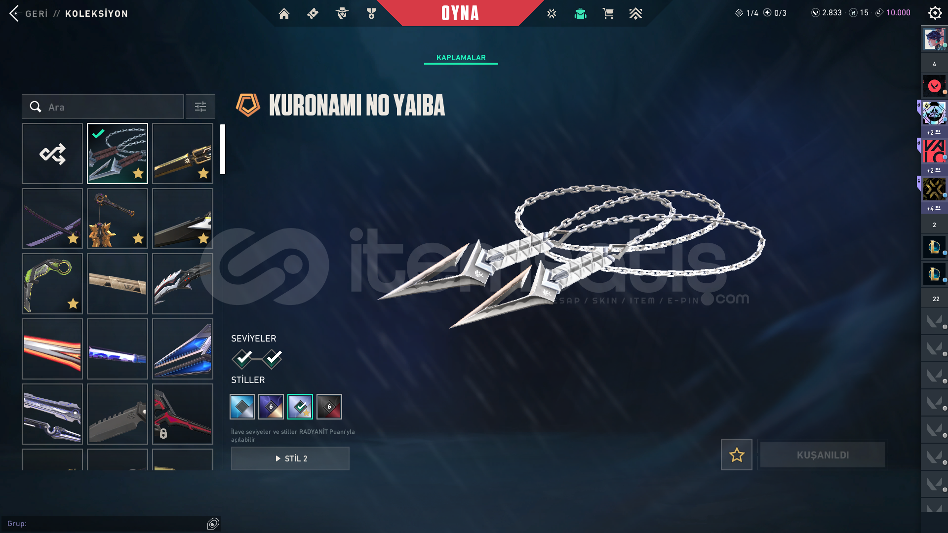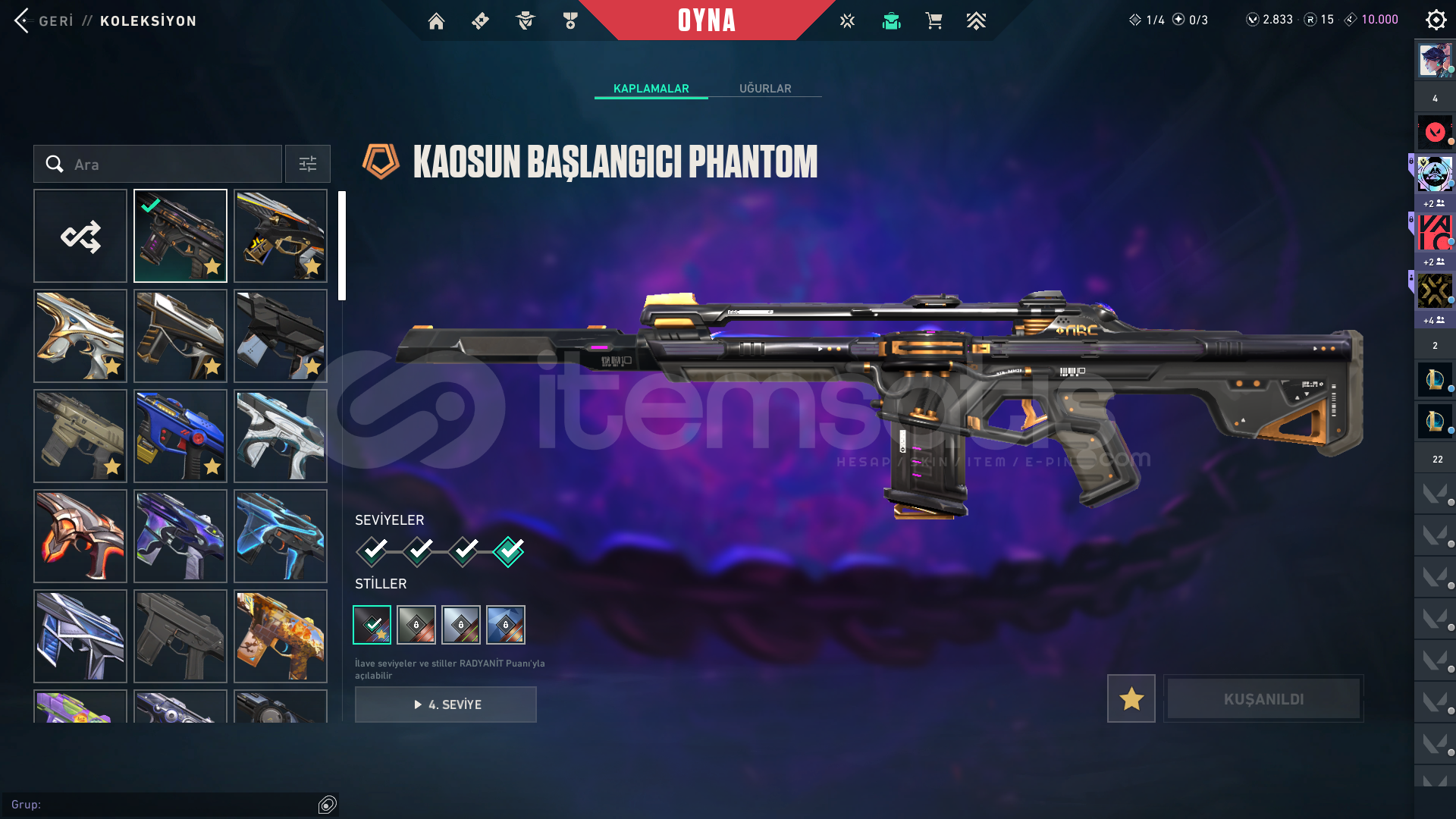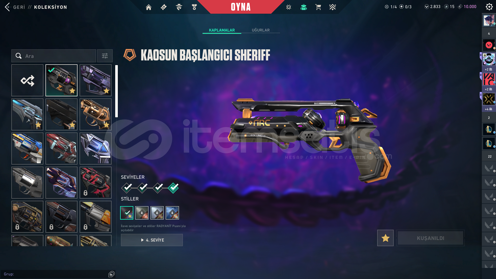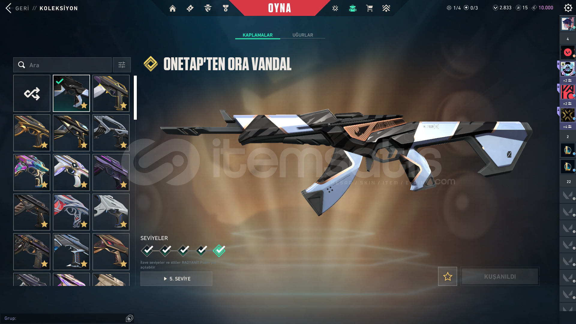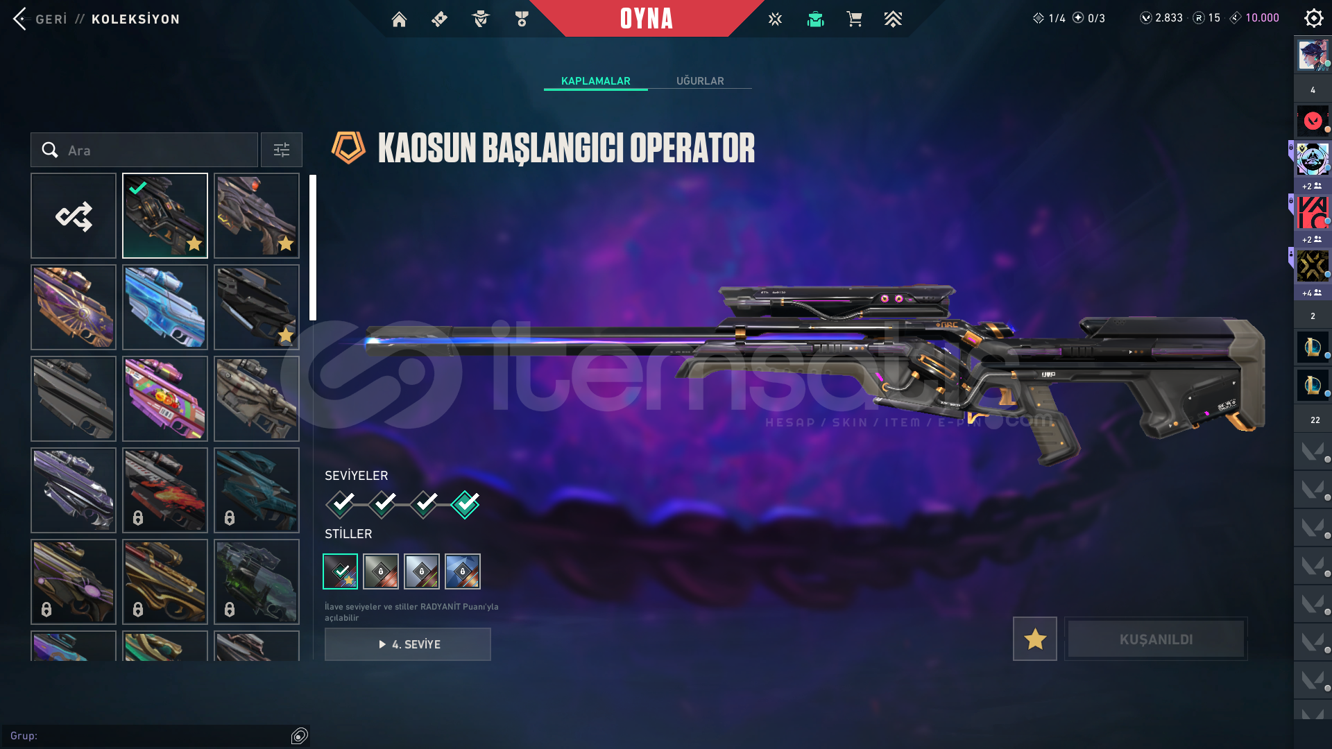 Hesaba 30293 tl yatırılmıştır içinde battle pass açık ve 2800 vp var. 15 rp var.toplam 174 skin.VCT25 X T1 CLASSICANOMALİ GHOSTEX.O SHERİFFSİHİRPUNK SHERİFFKURONAMİ SHERİFFKAOSUN BAŞLANGICI ŞHERİFFONETAP'TEN ORA SHERİFFFATİH STRİNGER EX.O SPECTREKAOSUN BAŞLANGICI SPECTRASÜRAT CANAVARI BUCKYFAZ KORUYUCU BULLDOGFATİH GUARDİANIŞIK MUHAFIZLARI PHANTOMFATİH P...