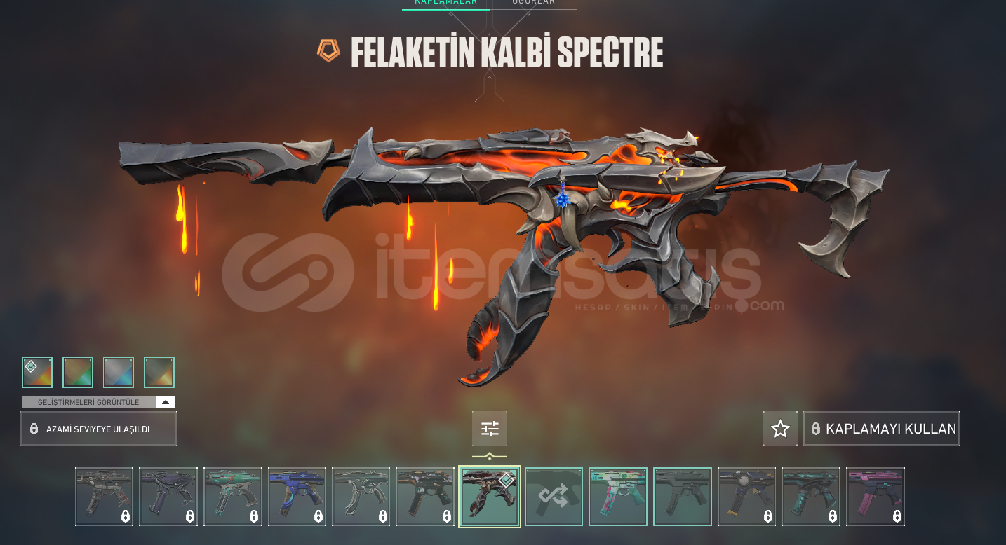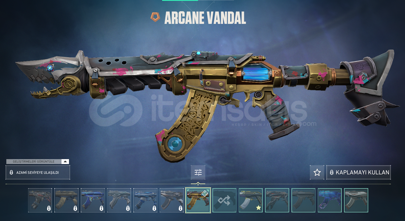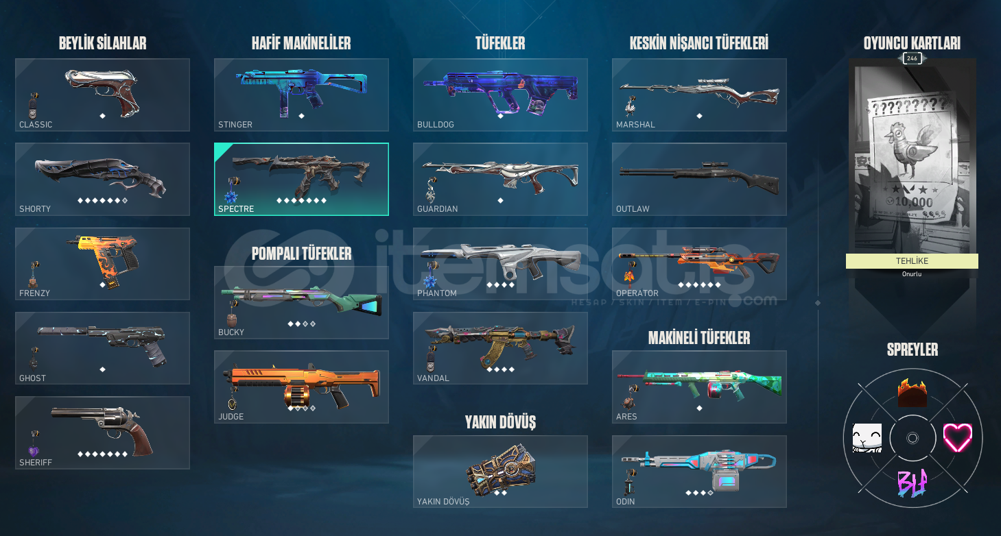Bıçak = Arcane Eldiveni,Felaketin Bıçağı,Prizma balta,Şakıyan ÇelikVandal= Arcane Vandal, Asil Vandal, Yağmacı Vandal, Felaketin kalbi vandal, Sualtı Vandal,Süvari VandalPhantom= İYON Phantom, Asil Phantom, Felaketin Kalbi Phantom, Işık Dalgası PhantomOparatör= Radıyant Enterment Oparatör , Köken OperetörSherif = Seri tetik 4 tane normal sherif skinGhost = 5 tane normal sherifSpekt...