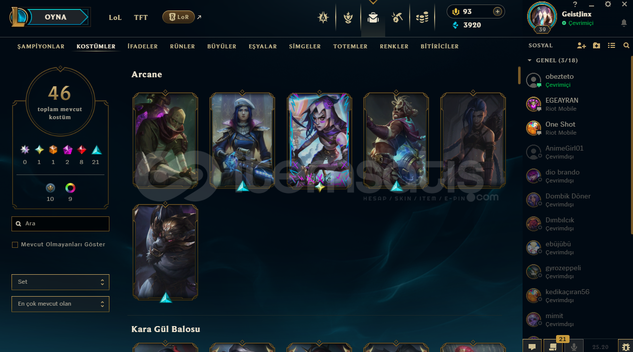 lolünde 500 dolarlık skin ve 46 skin bulunmaktadır hesaba 5 bin yatırıp 7 bine satmamım nedeni hem a rcan var hemde lolde 500 dolarlık arcane jinx var valoranttında 27 skin var hesabın ilk maili bende birşey olmaz