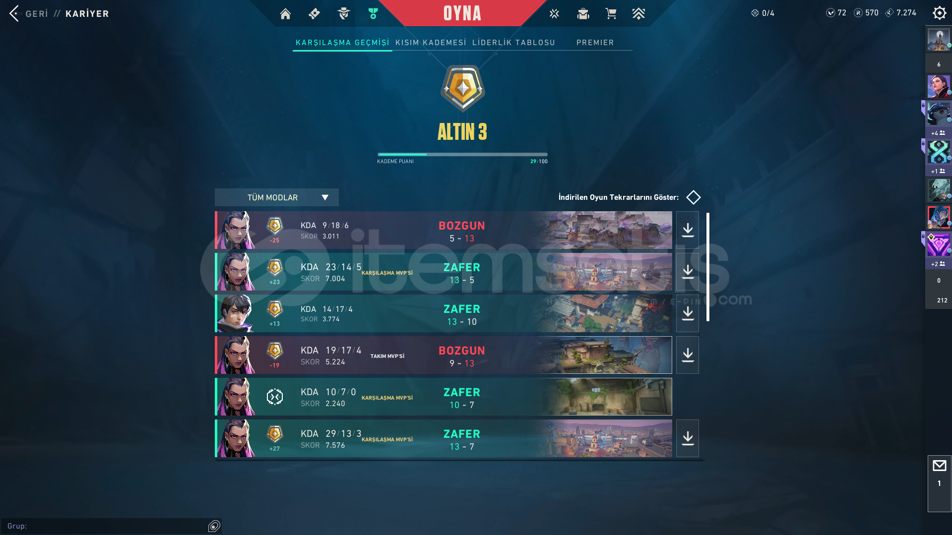 Ürün Hakkında Bilgi;İLANI SATIN ALDIĞINIZDA 7/24 OTOMATİK OLARAK TESLİM EDİLİR.RANK - GOLD 3HESAP SEVİYESİ - 123SKİN SAYISI - 5VP SAYISI - 72+ 100.000 BAŞARILI İŞLEM İLE GÜVENLE ALIŞVERİŞ YAPABİLİRSİNİZ
