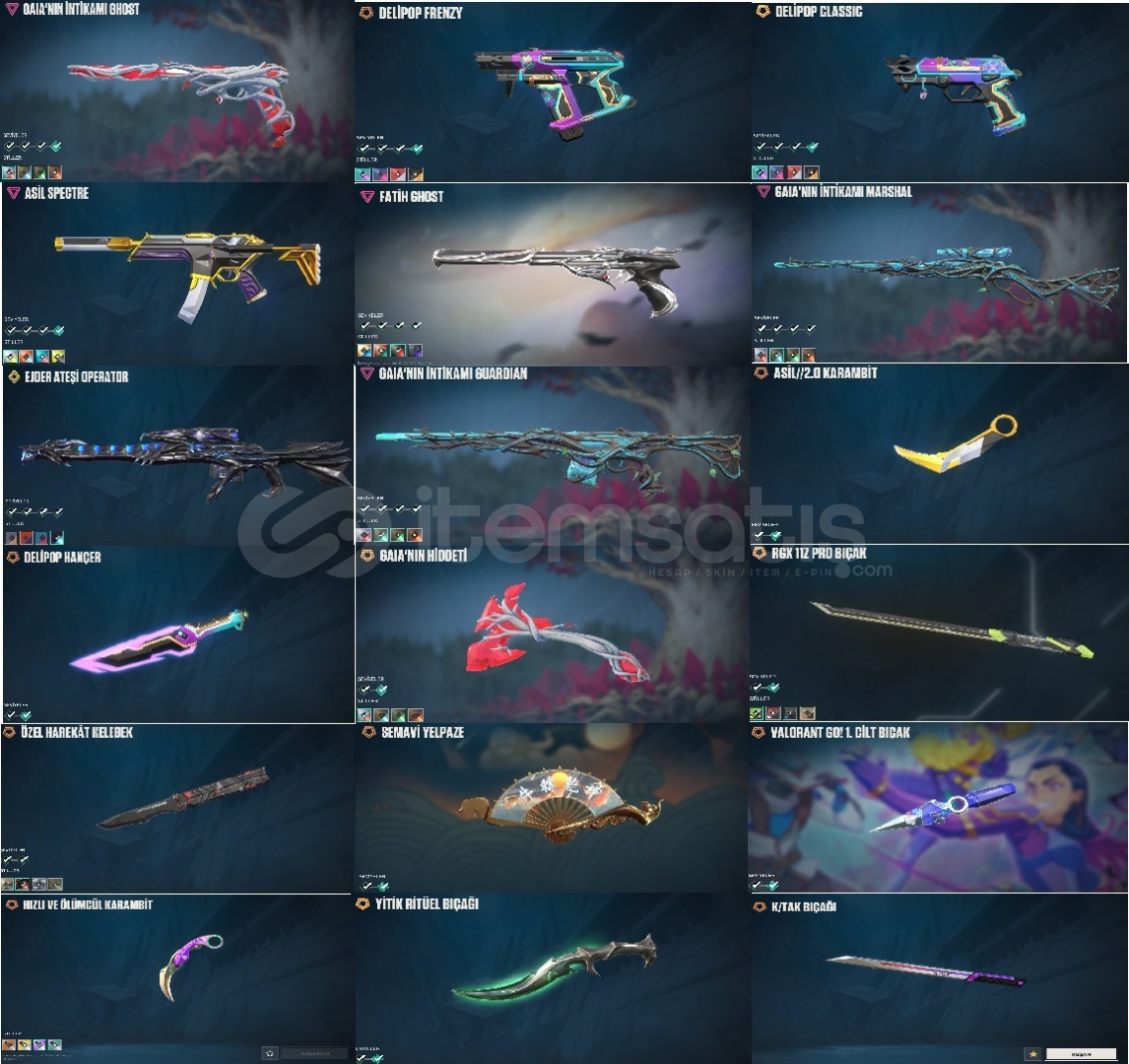 -Bıçaklar: VALORANT GO 1. CİLT JETT BIÇAĞI, ASİL KARAMBİT, RGX 11ZPRO KATANA, ÖZEL HAREKAT KELEBEK, DELİPOP HANÇER, YİTİK RİTÜEL BIÇAĞI, SEMAVİ YELPAZE, GAIANIN HİDDETİ BALTASI, GERİ KALAN 12 BIÇAK BATTLE PASS BIÇAKLARIDIR.