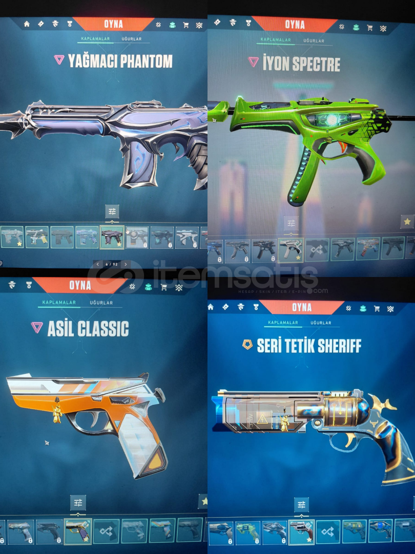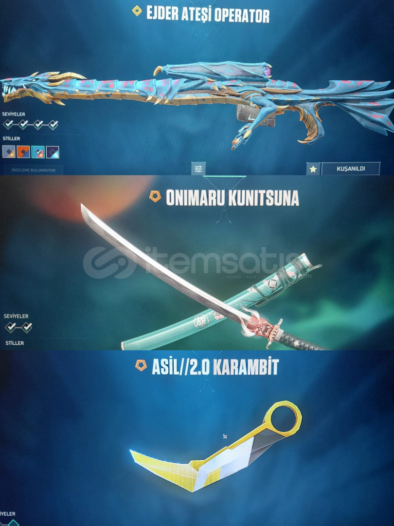 EJDER VANDAL + ONİ KATANA + ASİL KARAMBİT + SÜRAT CANAVARI VANDAL + SOĞUK ÇELİK VANDAL + YAĞMACI PHAMTOM + GAİ VANDAL + CESUR YÜREK VANDAL + ASİL CLASSİC + SERİ TETİK SHERİFF + İYON SPECTRE + BATTLEPASS SKİNLERİ