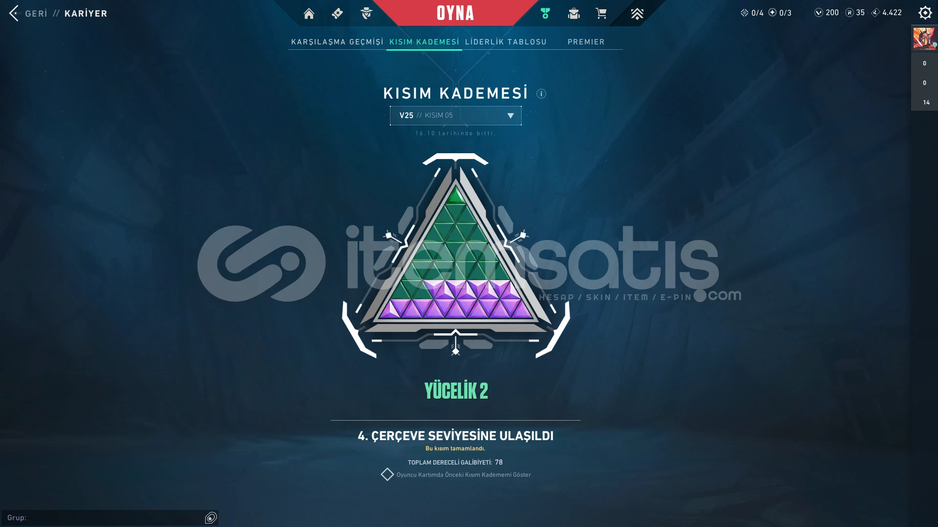 Hesaba 5k TL civarı para yatırıldı, 1 adet Battlepass bitirildi. Güncel rankı Elmas 2'dir, en yüksek gördüğü rank Yücelik 2'dir. Değerli ünvan, sprey ve kartların çoğu hesapta bulunmaktadır.