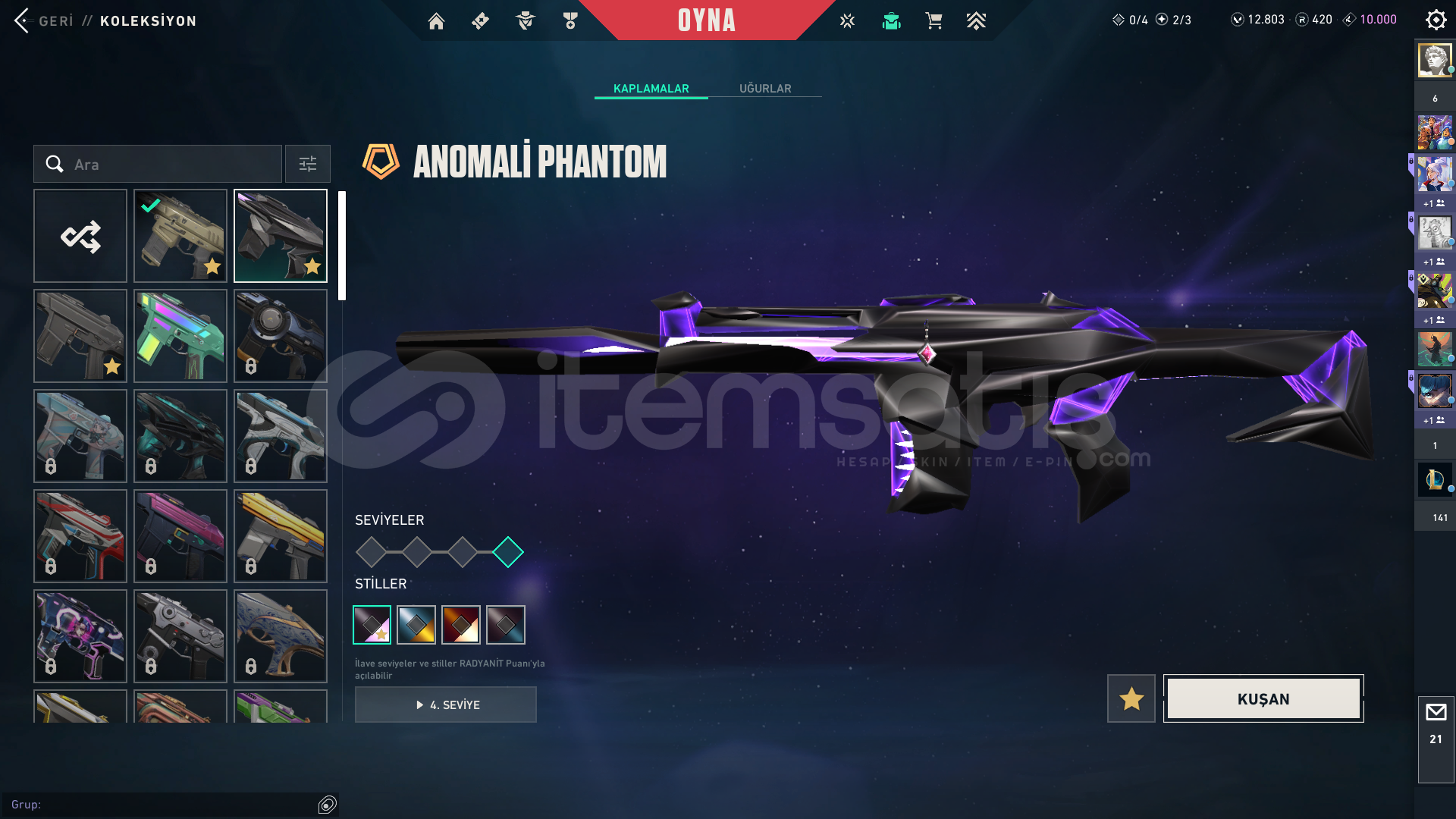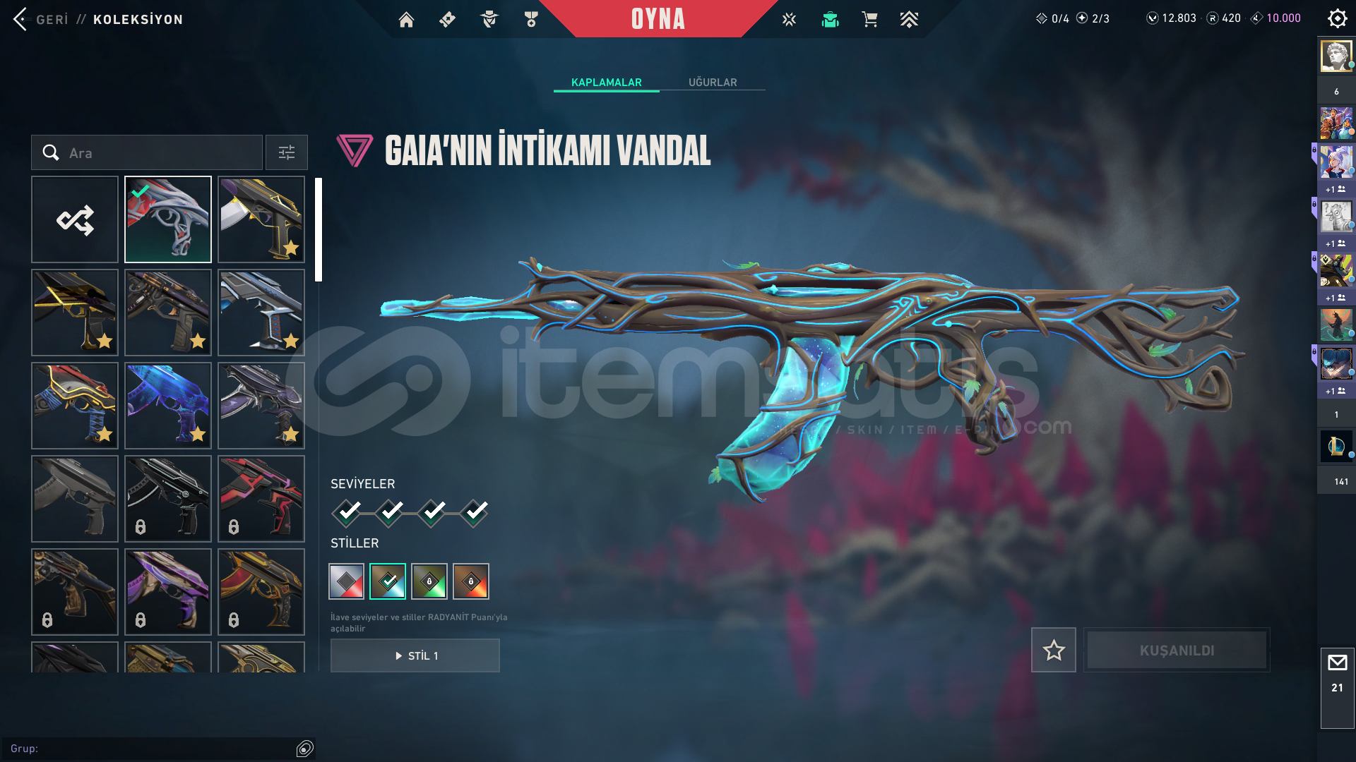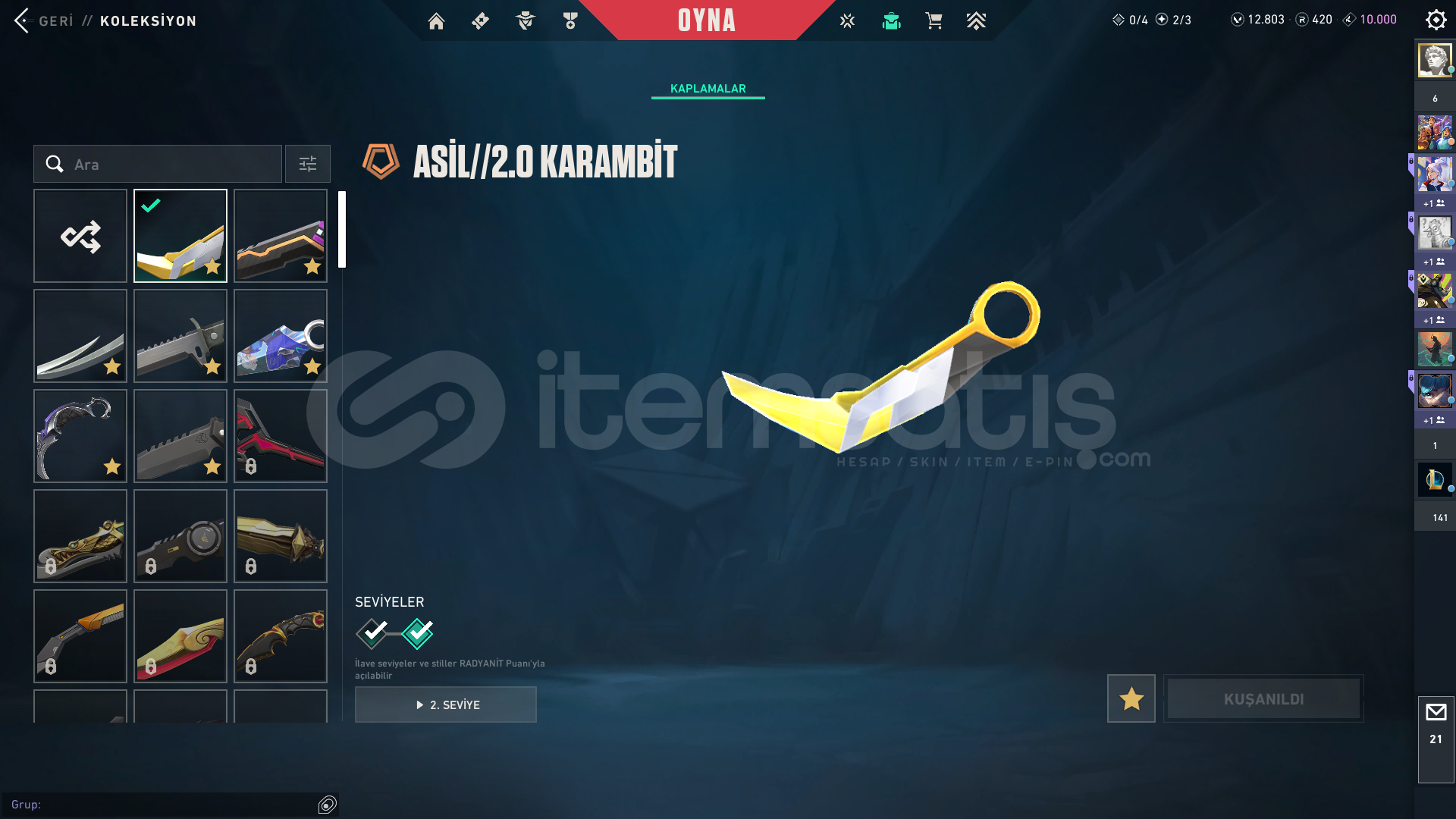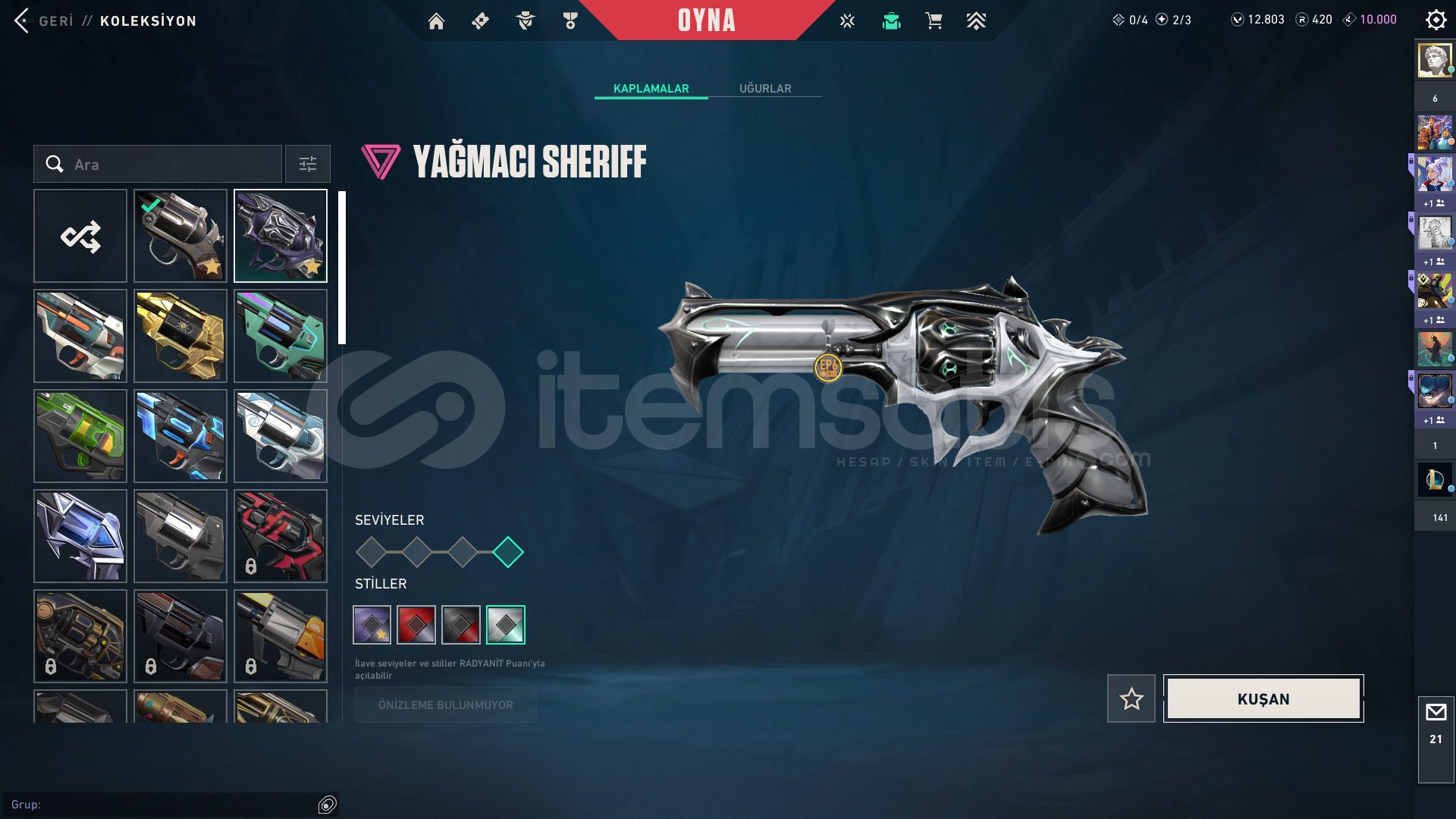 hesapta extra 12.800 vp vardırAsil ClassicAsil VandalChampions VandalGaia vandalKaos VandalKuronami VandalYağmacı VandalOni VandalÖzel Harekat PhantomAnomali PhantomYağmacı SheriffSeri tetik SheriffYerçekimsel Uranyum Naroateşleyici SpectreDelipop HançerYağmacı KarambitValorant Go 1.Clit BıçakUzaylı Avcısı BıçakAsil Karambit+Battlepass